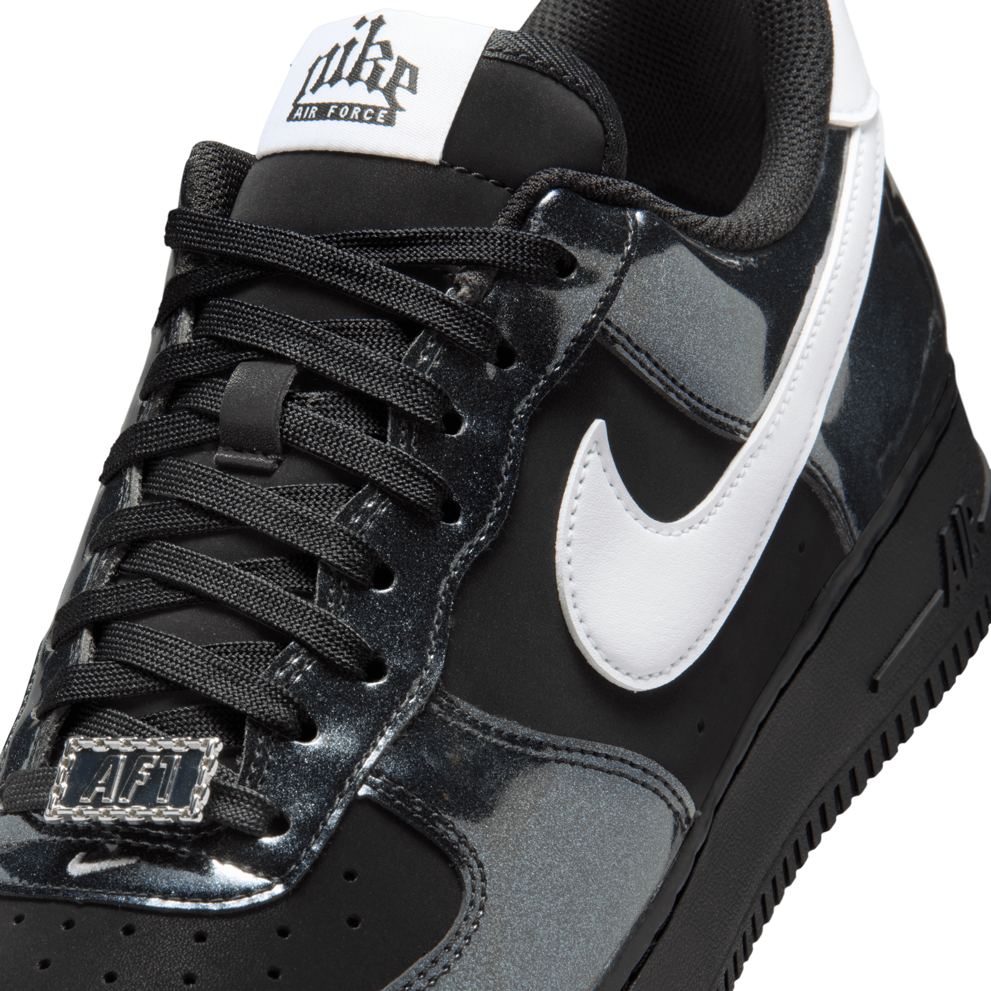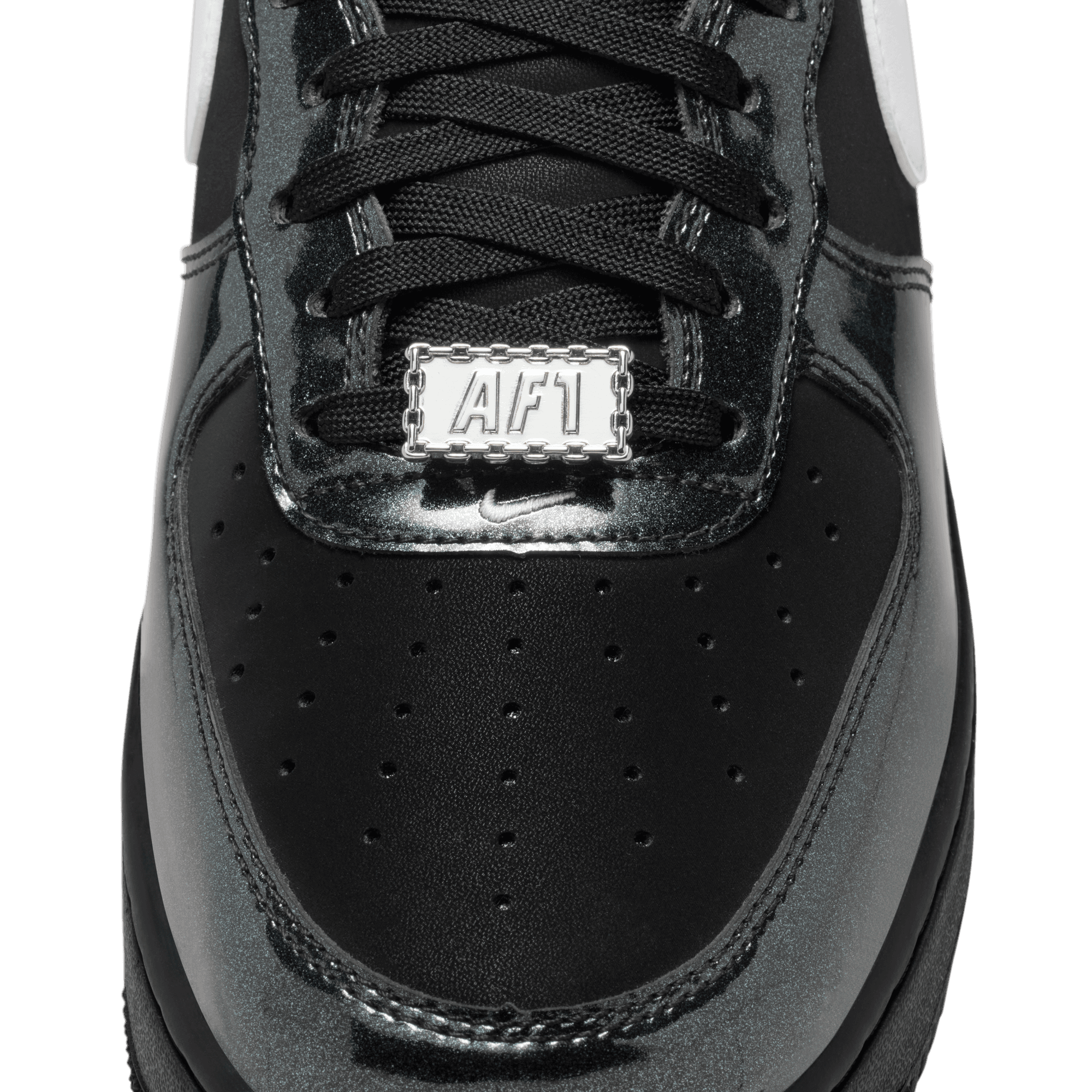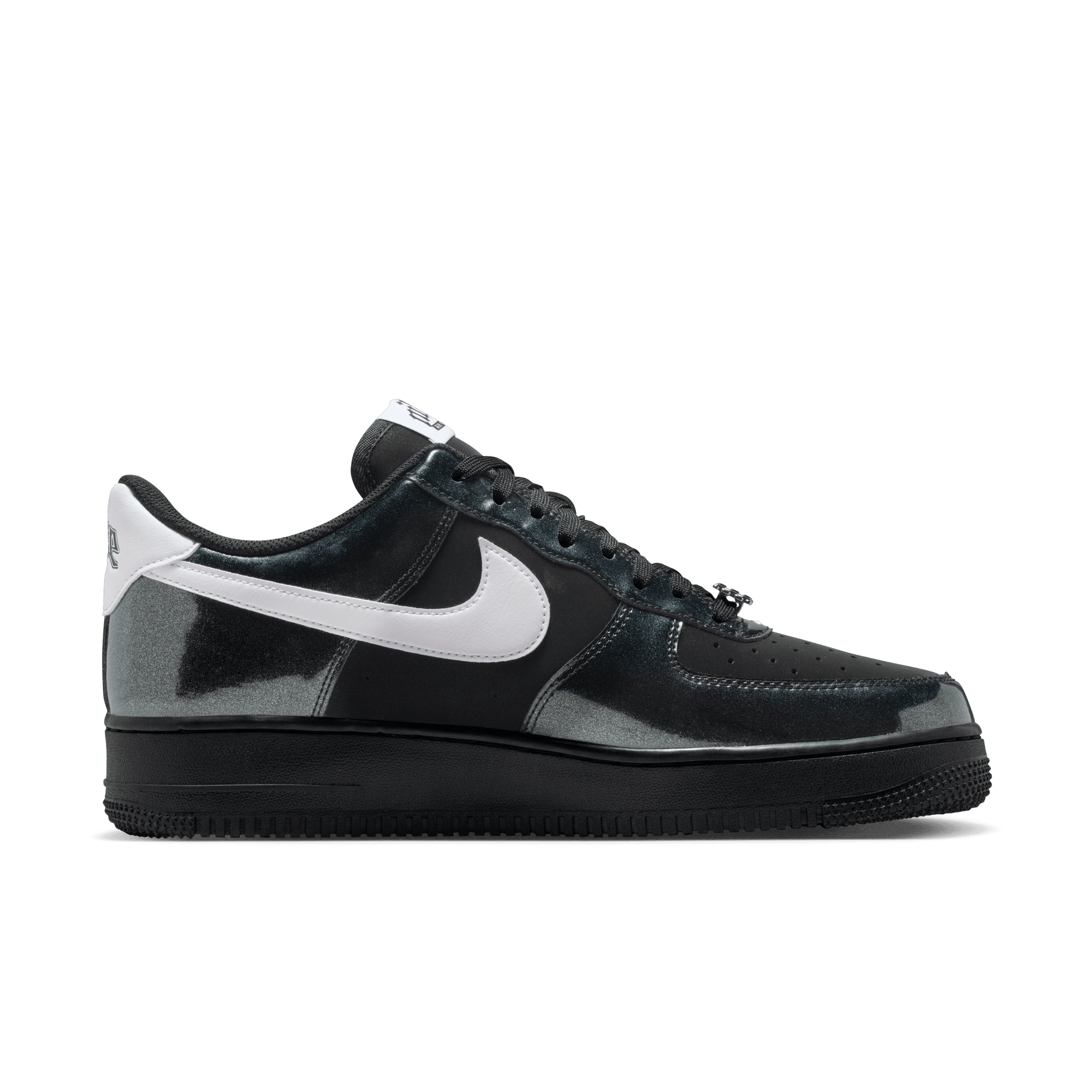 The era of platform boots and vinyl jumpsuits is alive again with the Air Force 1 '07 LV8 "Glam Rock Pack". Nike's signature sneaker nods to '70s rock style with shimmery gunmetal patent leather overlays on top of a standard black leather base with white leather swoosh and heel tab. Special rock-style Nike logos hit the tongue tag, insole and heel, with a metal chain-link lace dubrae and black sole unit finish off the design.