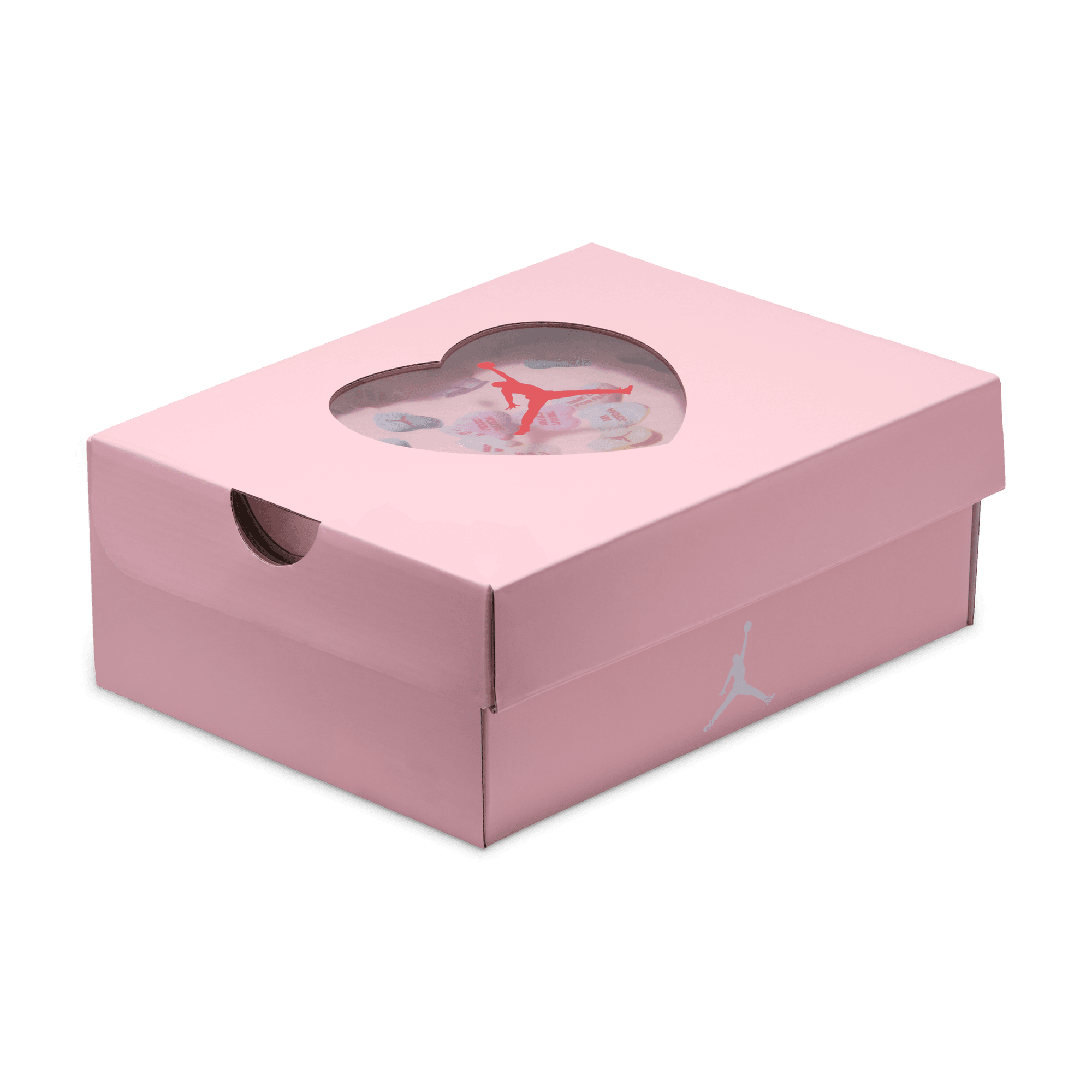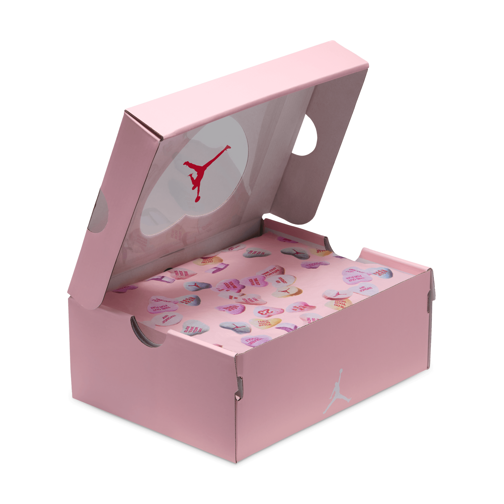 Love is till in the air on this springy Valentine's-themed kids exclusive Air Jordan 4 Retro "White/Vapor Green/Medium Soft Pink". The classic silhouette builds its upper from tumbled white leather with seasonal pastel accents on the blue lace hardware, green netting and tongue tag, and pink mudguard and heel branding. The insoles are printed with a heart candy graphic to go along with the Jumpman heart hang tag and pink heart-themed packaging.