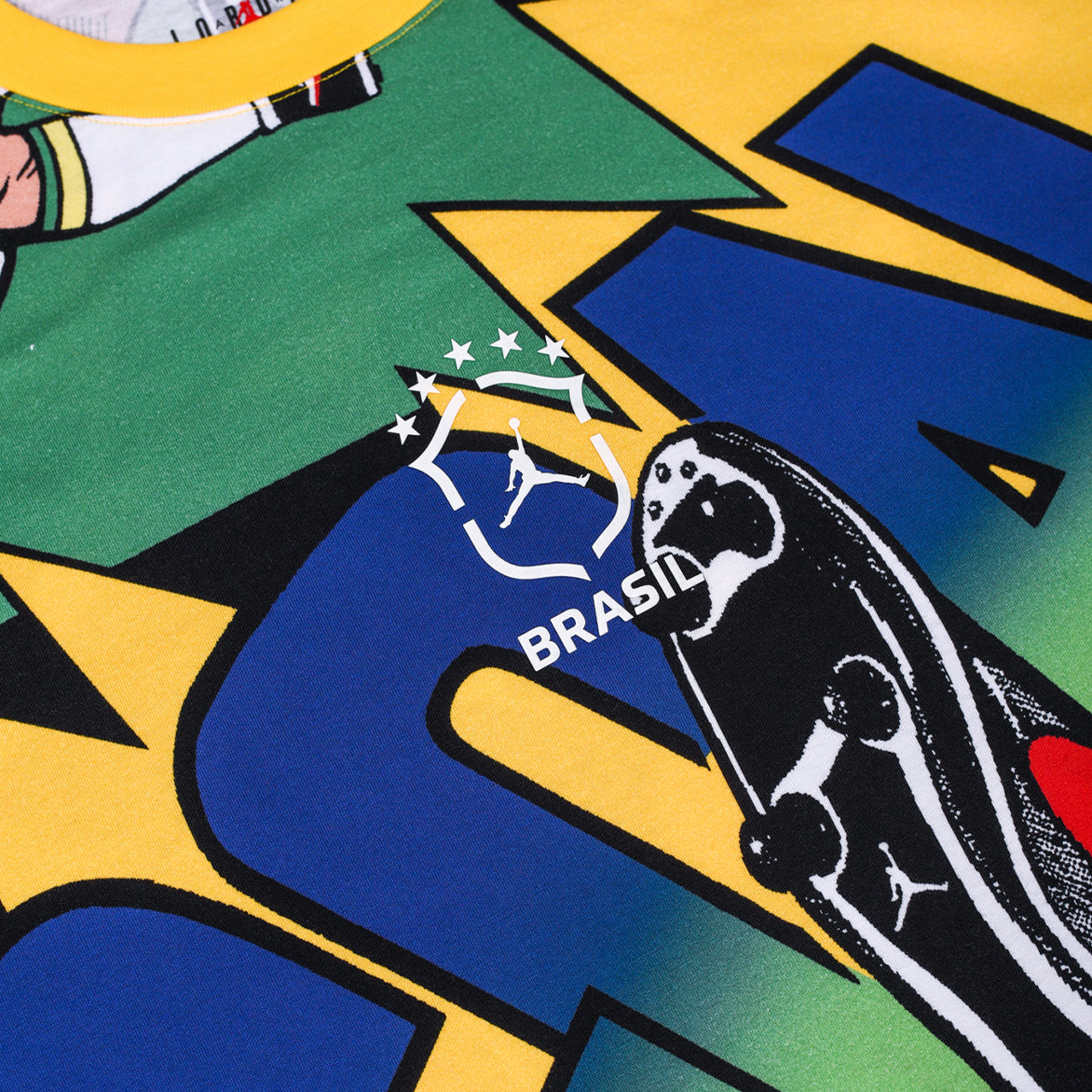 The World Cup is back on American soil for the first time since 1994 and Jordan Brand is getting us in the mood with the essentials Brasil Boxy Tee. This 100% cotton tee features an allover comic-style graphic print in Brasil colors, and rocks a boxy, oversized cut for a roomy and relaxed feel.