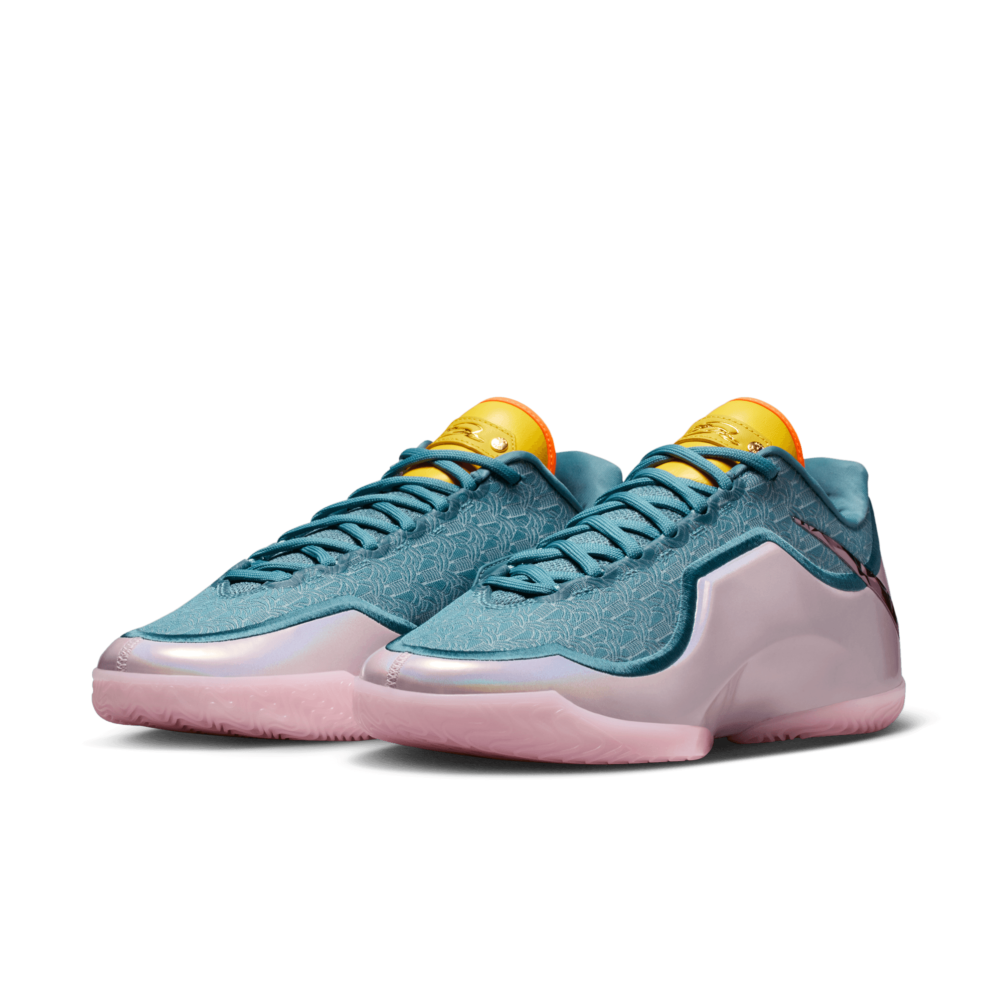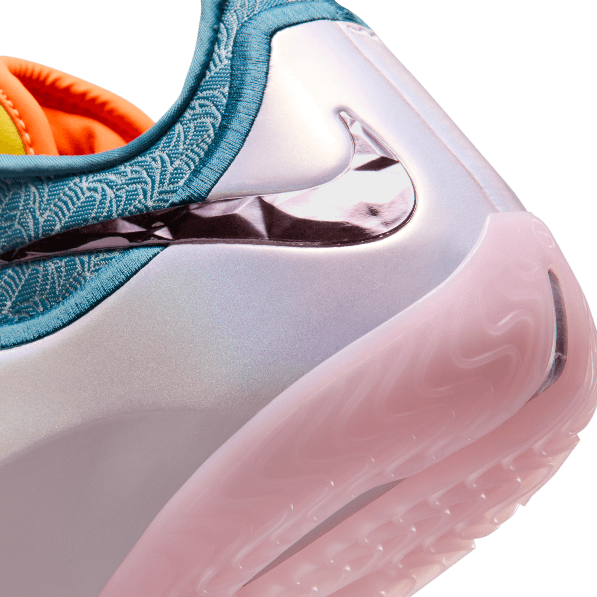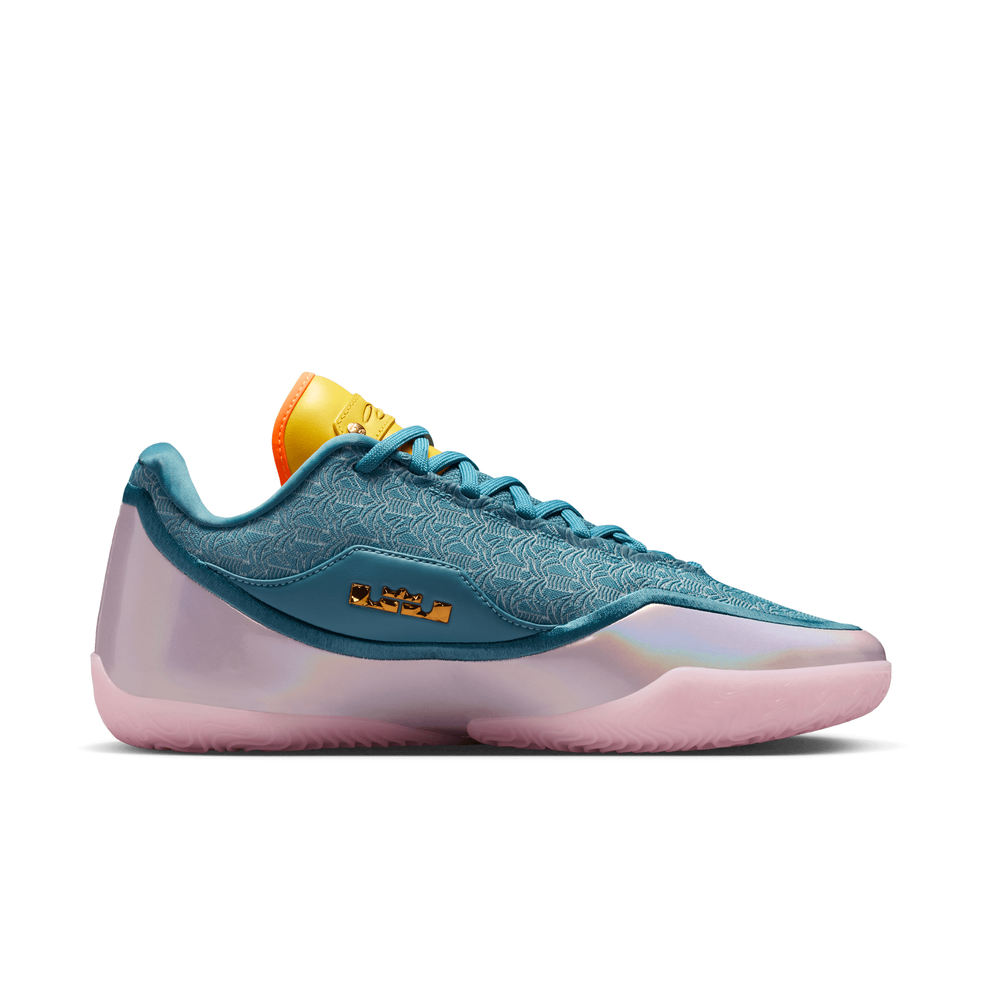 The LeBron 23 "Miami Twice" celebrates Bron's return to the NBA Finals to vanquish the formidable San Antonio Spurs in a seven game series for the ages that locked down a "Heat Repeat" that immortalized the King's legacy. This special design brings back those wavy Miami vibes, complete with a pink and teal color scheme, yellow leather tongue and repeating palm tree graphic along the upper. A slanted metallic purple reverse Swoosh on the lateral sides and iconic “LJ” crown logo on the medial sides nod to past Heat-era LeBron designs. A lightweight engineered jacquard upper and a full-length ZoomX drop-in midsole continue the mix of luxury and technology that is a hallmark of the LeBron series, matching the modern game’s demands for versatility, twitchiness, and playing with pace.