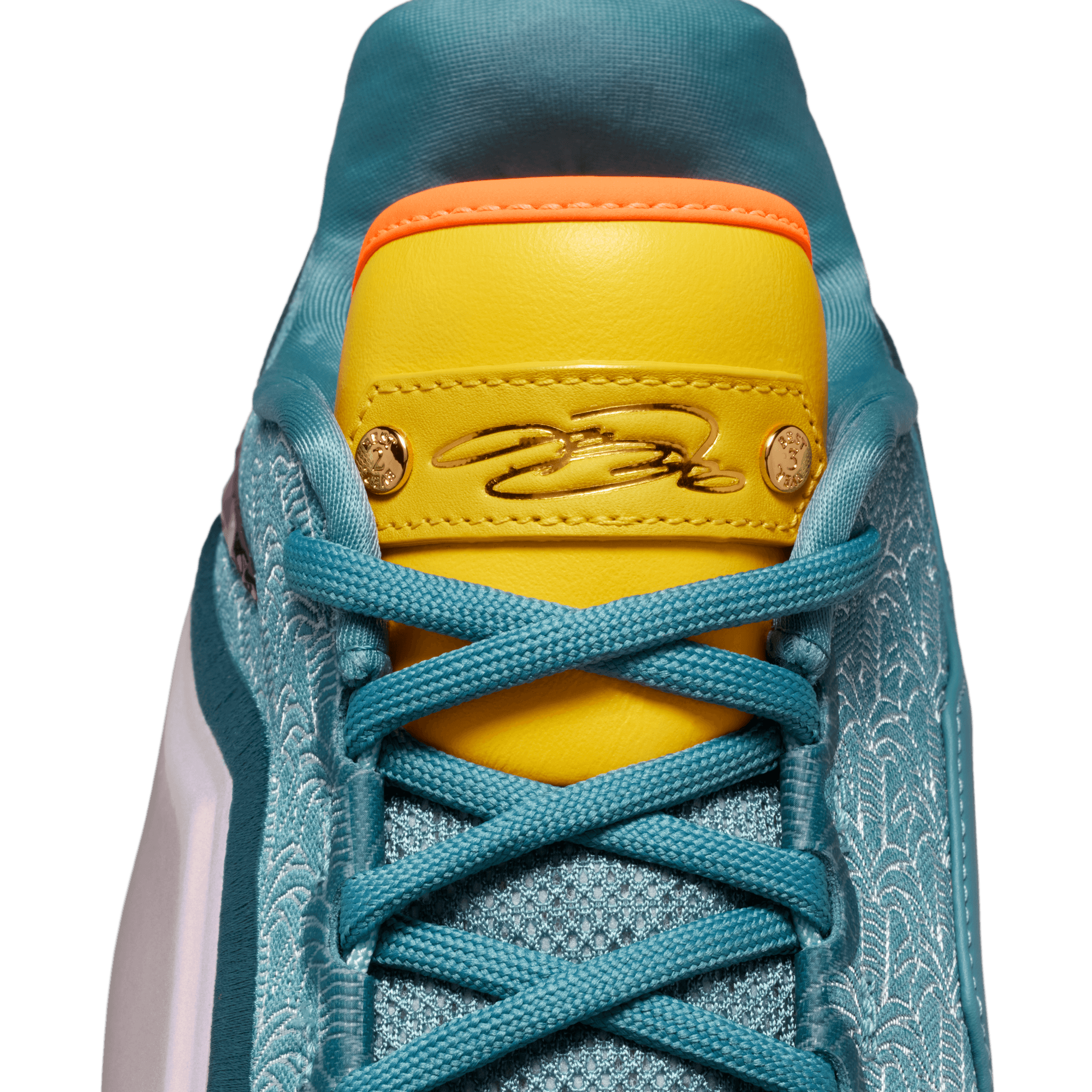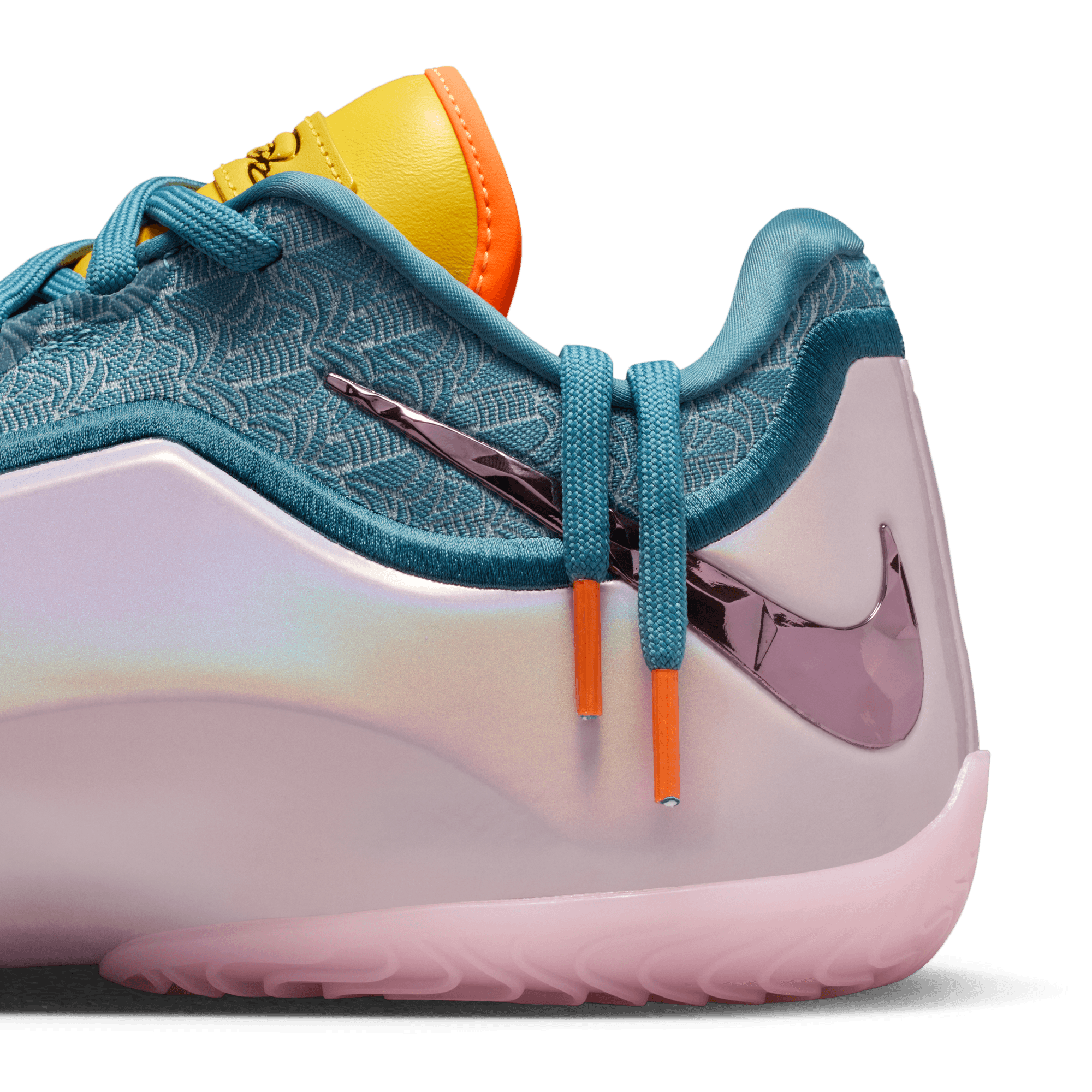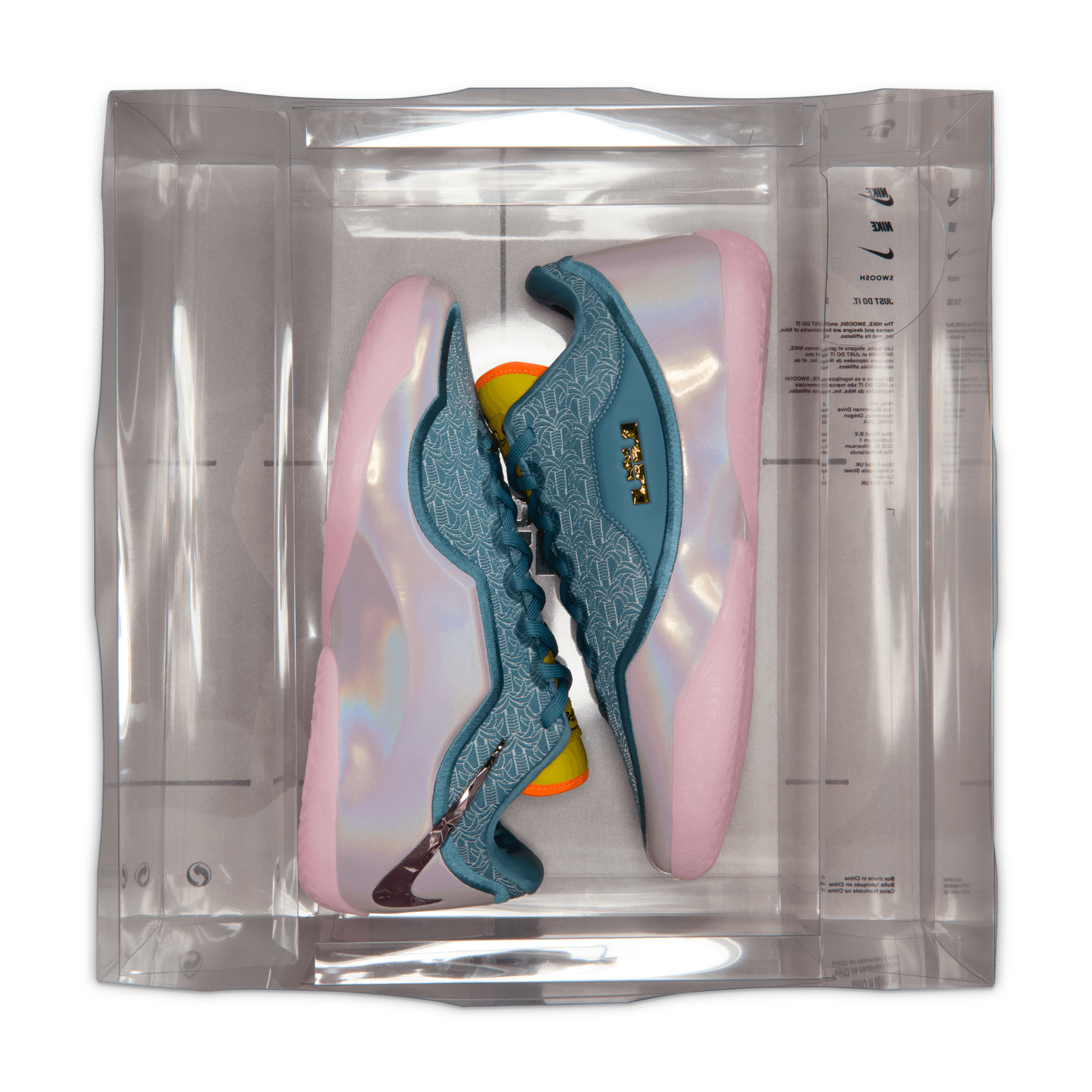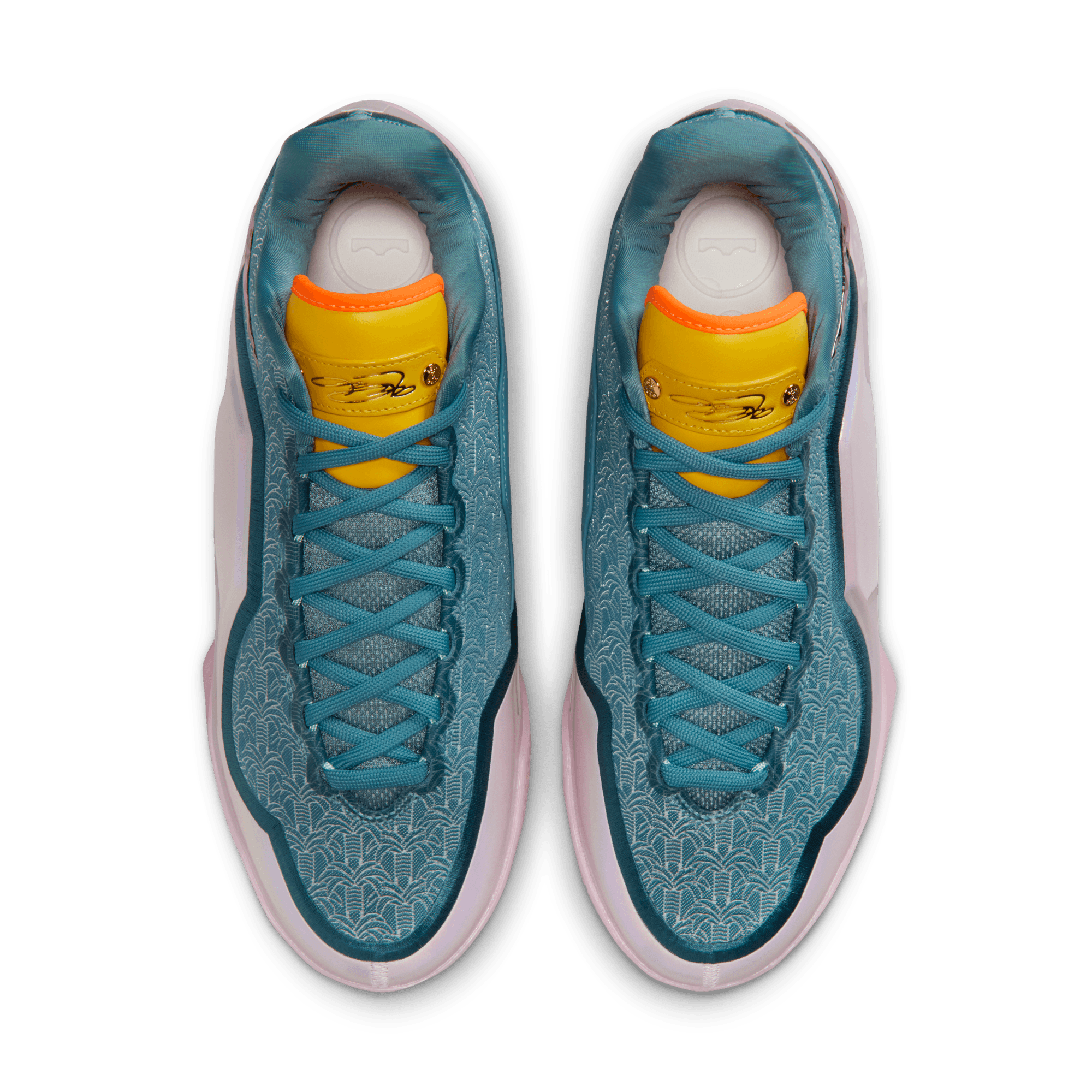 The LeBron 23 "Miami Twice" celebrates Bron's return to the NBA Finals to vanquish the formidable San Antonio Spurs in a seven game series for the ages that locked down a "Heat Repeat" that immortalized the King's legacy. This special design brings back those wavy Miami vibes, complete with a pink and teal color scheme, yellow leather tongue and repeating palm tree graphic along the upper. A slanted metallic purple reverse Swoosh on the lateral sides and iconic “LJ” crown logo on the medial sides nod to past Heat-era LeBron designs. A lightweight engineered jacquard upper and a full-length ZoomX drop-in midsole continue the mix of luxury and technology that is a hallmark of the LeBron series, matching the modern game’s demands for versatility, twitchiness, and playing with pace.