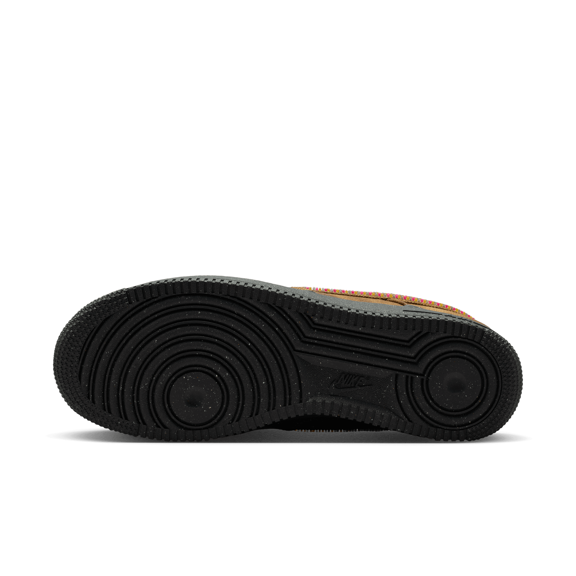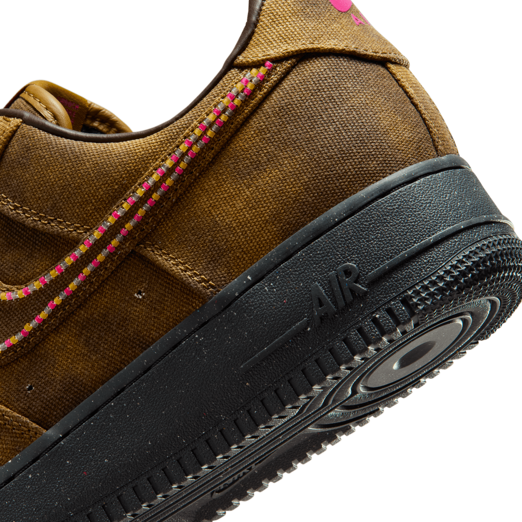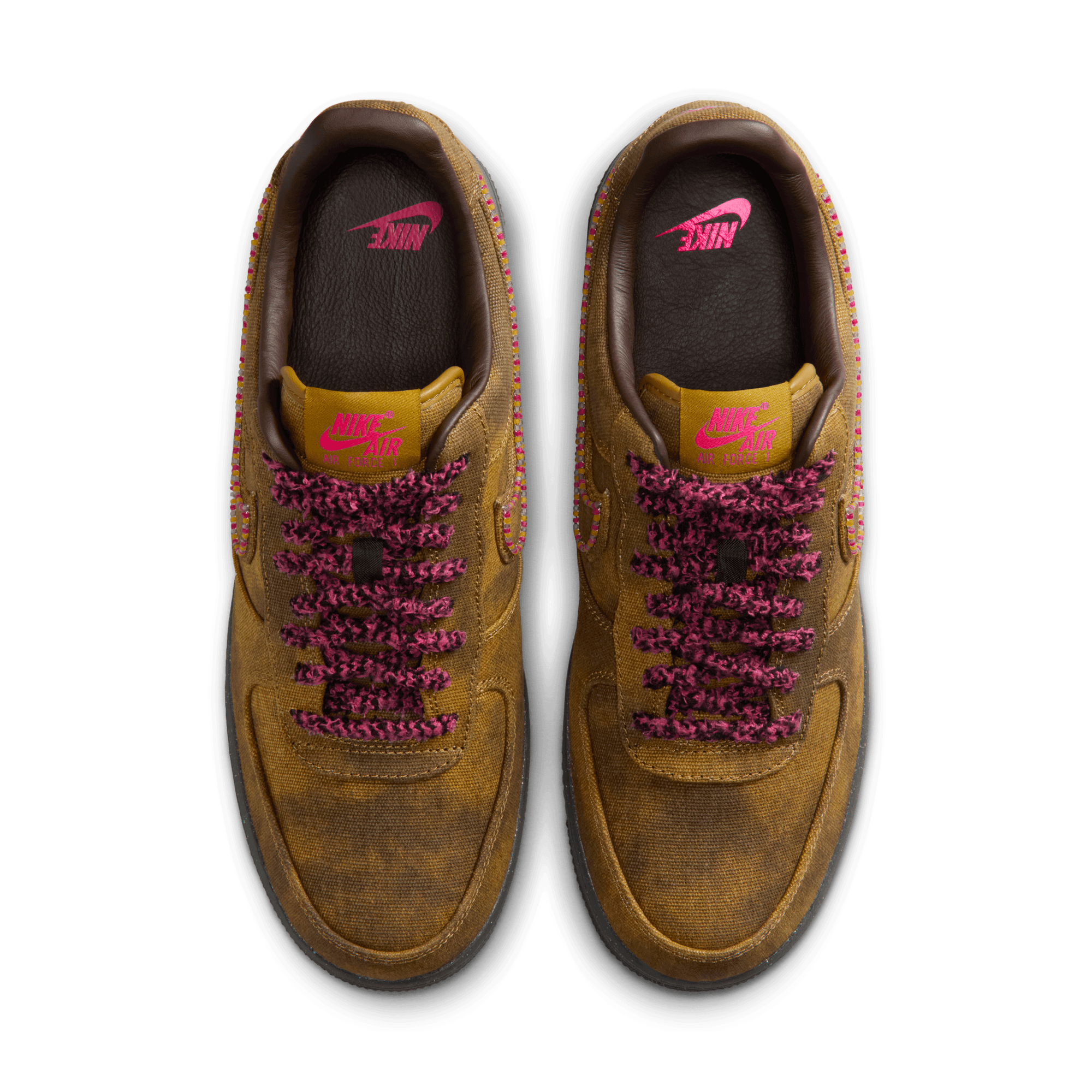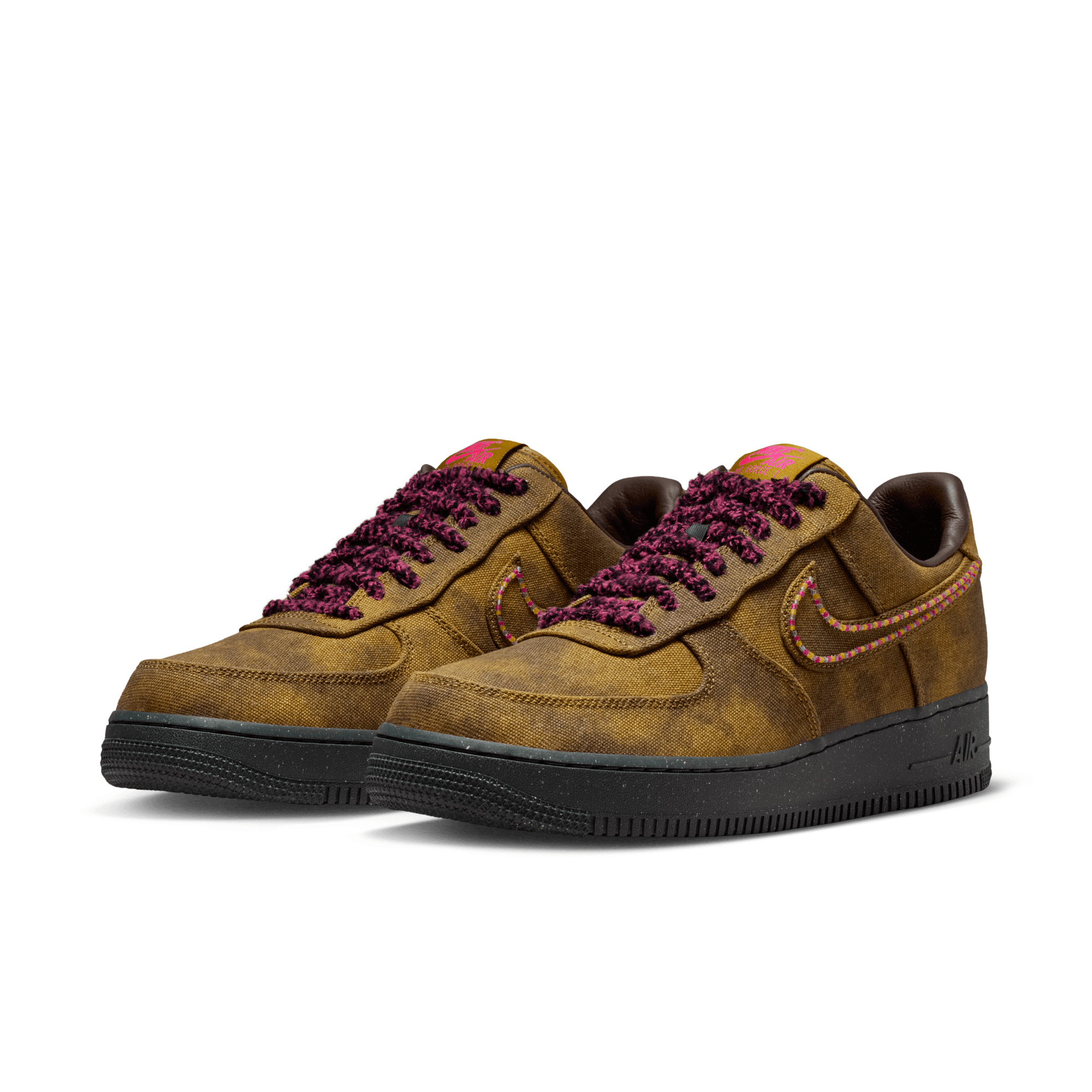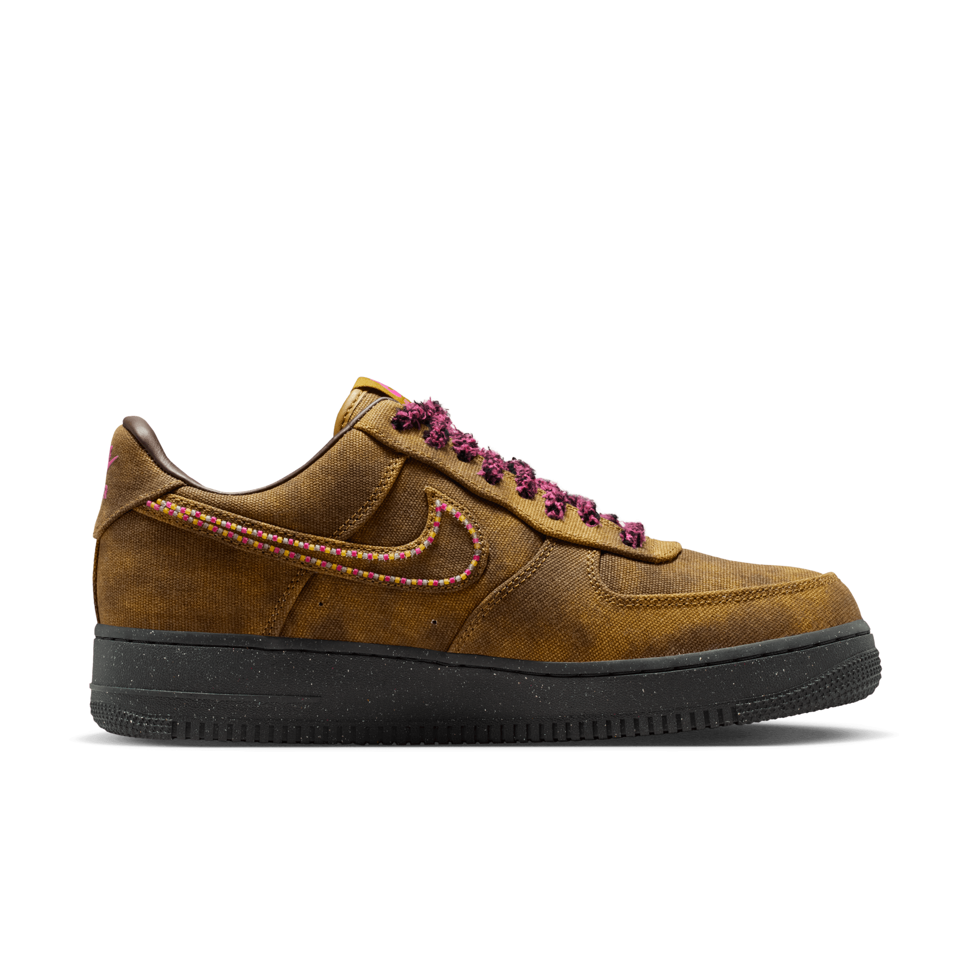 Over the years the AF 1 has taken on more looks than Emily In Paris, and its latest one pushes the envelope yet again on the Air Force 1 QS "Boucle". While the shoe may be called "Boucle", the build is primarily a distressed canvas upper that looks like a worn-in brown with tonal overlays. The swoosh is outlined in multi-color beads, with thick, fuzzy pink and black laces giving off a yarn-like appearance. Hot pink accents hit the branding on the tongue, heel and leather insole. A black speckled sole unit finishes off the daring look.
