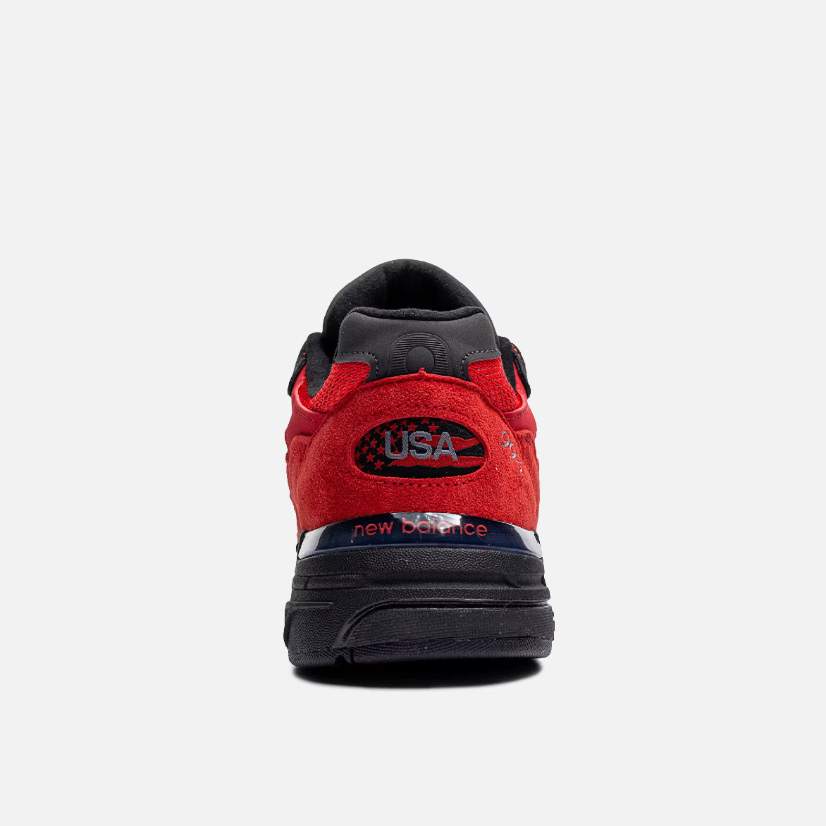 New Balance kicks off 2026 Made in the USA collection with this bold take on the 993 Made In USA "Pink Taffy". Originally introduced in 2008, the 993 features an upper construction of red suede panels on top of red open weave mesh and black leather accents and suede tongue. Black laces and lining, silver-over-black N logo on the sides and a black translucent NB branded TPU heel clip fill in the details. The black PU foam midsole features both ABZORB and ACTEVA cushioning while a blown rubber NDurance outsole provides superior durability. Silver Made in the USA embroidery over American flag detailing on the tongue and heel finish off the design.