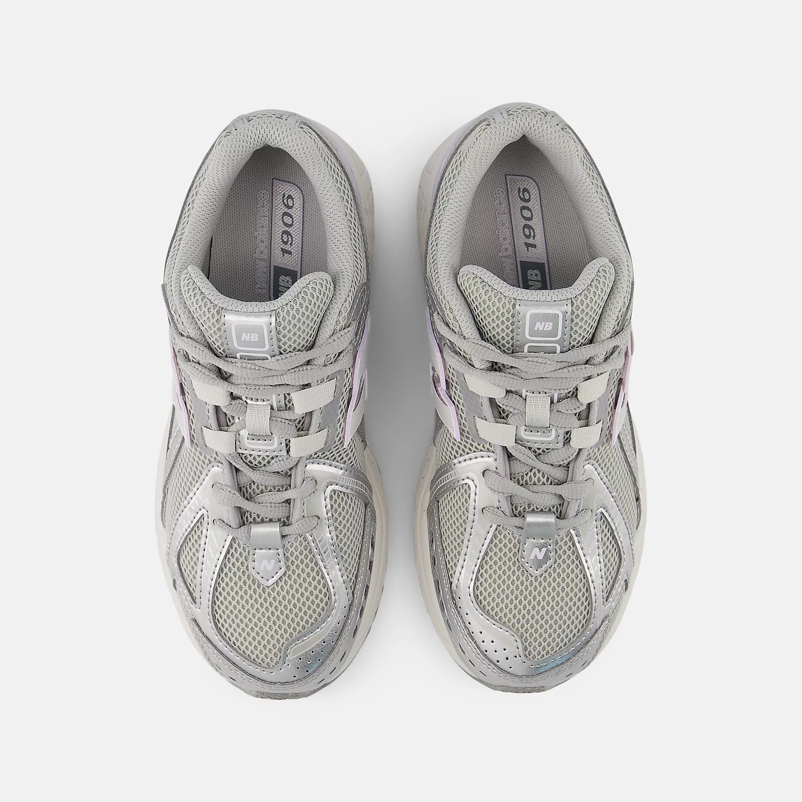 Following in the footsteps of the 2002R, another retro 2000s runner is back with fresh style on the 1906R. The shoe features silver synthetic leather layered over grey mesh on the upper, with a unique purple 'N' logo that ties into the lacing system overlaid on the sides and purple accents. New Balance branding hits the tongue, toe and heel, while "1906R" on the rear quarter, and "N-ergy" on the midsole fill in the rest of the details. A pale purple thatched TPU heel cage, cream midsole with ACTEVA LITE cushioning in the forefoot and ABZORB SBS cushioning in the heel, Stability Web technology for arch support and a grey N-ergy rubber outsole completes the look.