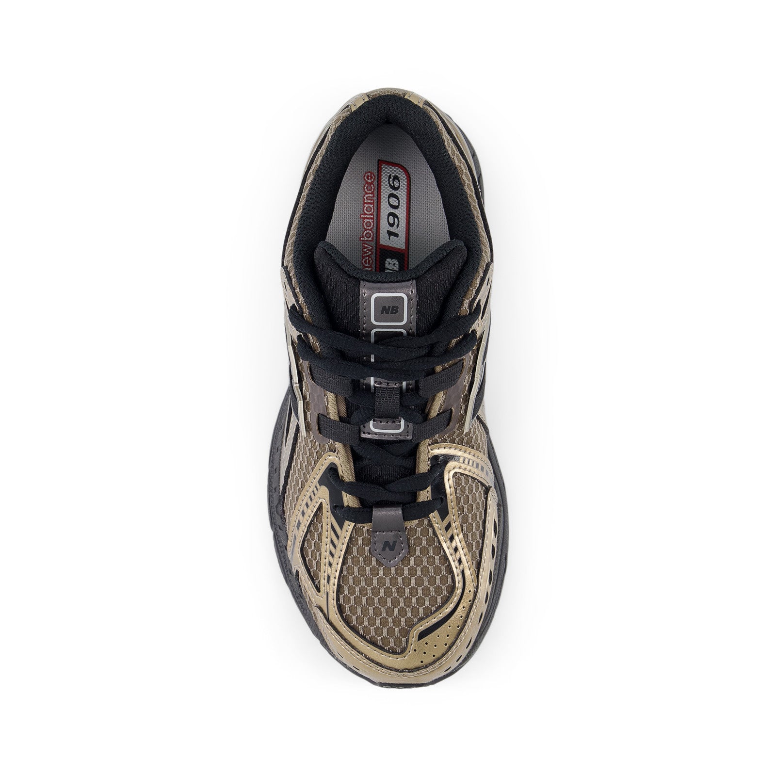 Following in the footsteps of the 2002R, another retro 2000s runner is back with fresh style on the 1906R. The shoe features gold synthetic leather layered over brown and black mesh on the upper, with a unique black 'N' logo that ties into the lacing system overlaid on the sides and black accents. New Balance branding hits the tongue, toe and heel, while "1906R" on the rear quarter, and "N-ergy" on the midsole fill in the rest of the details. A brown thatched TPU heel cage, black midsole with ACTEVA LITE cushioning in the forefoot and ABZORB SBS cushioning in the heel, Stability Web technology for arch support and a grey N-ergy rubber outsole completes the look.
