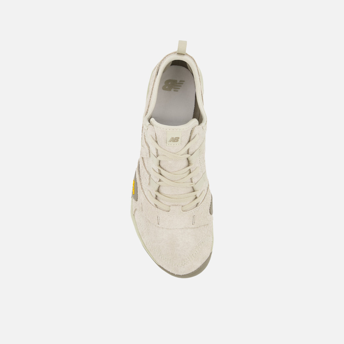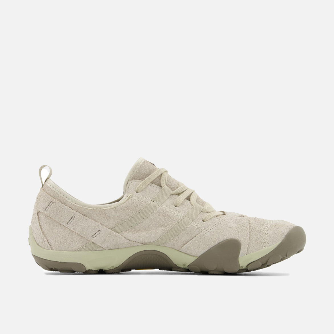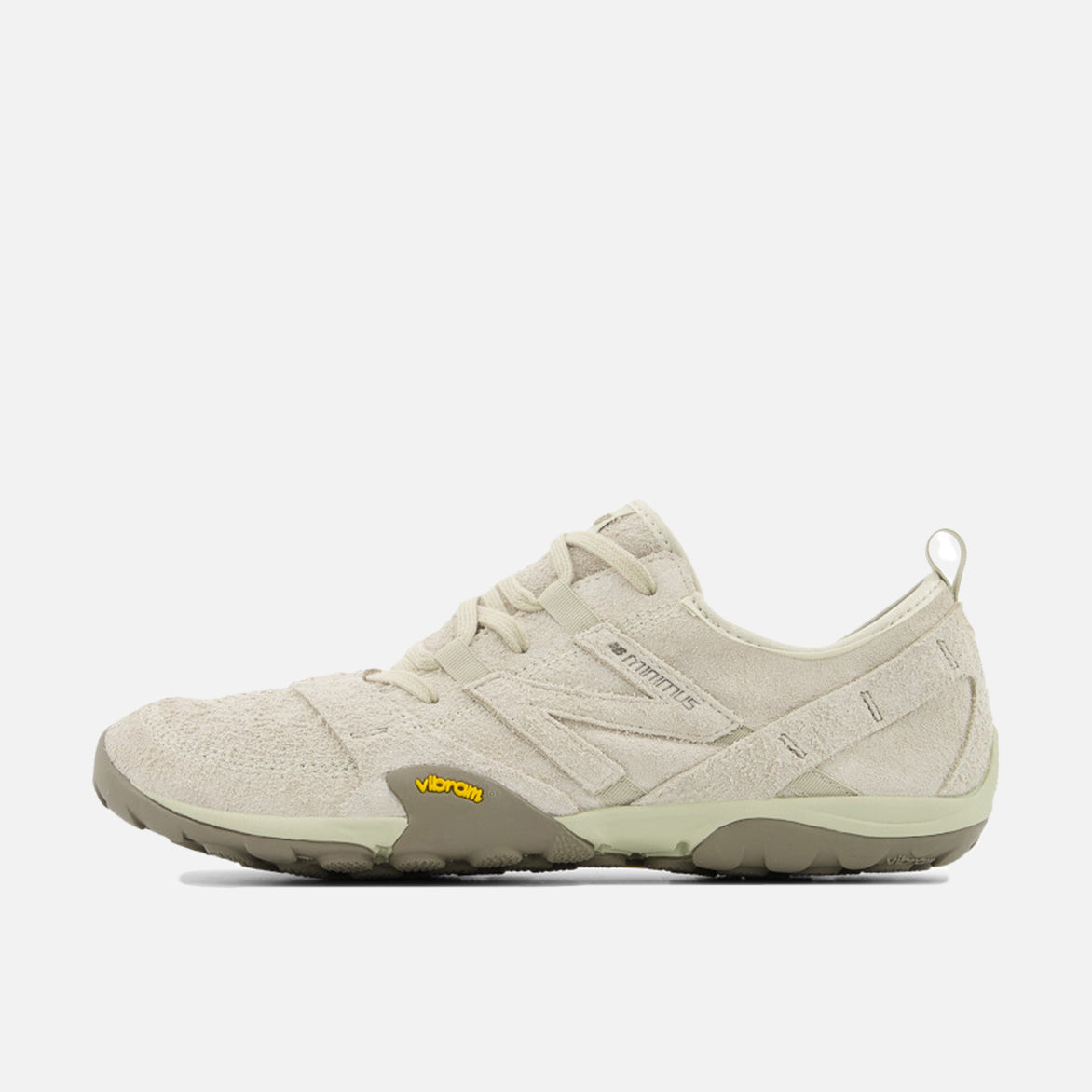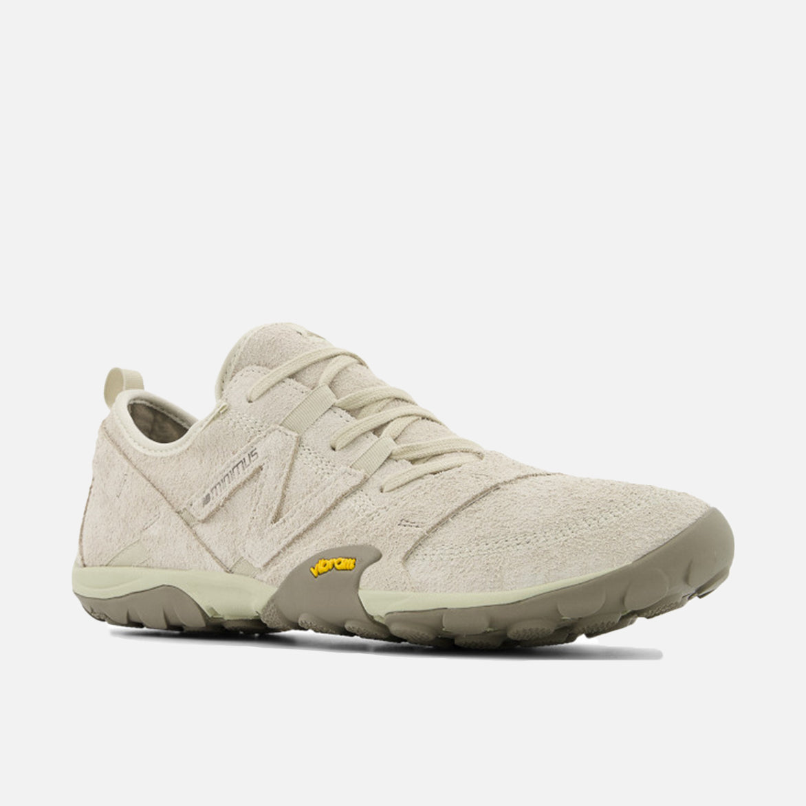 New Balance's MT10 descends from the original Minimus Trail 10, combining an ultra-lightweight feel with rugged, outdoor-ready durability. The shoe features a putty-colored rough suede upper with large suede canted 'N' on the sides, tonal suede synthetic overlays and tonal woven NB tongue tag. It sits on an EVA midsole and a custom Vibram outsole dotted with rounded lugs for superior traction.