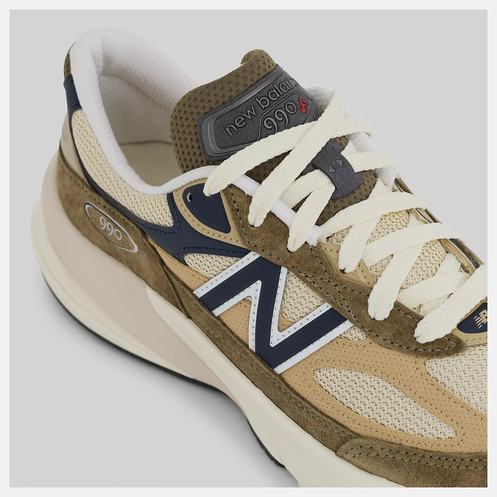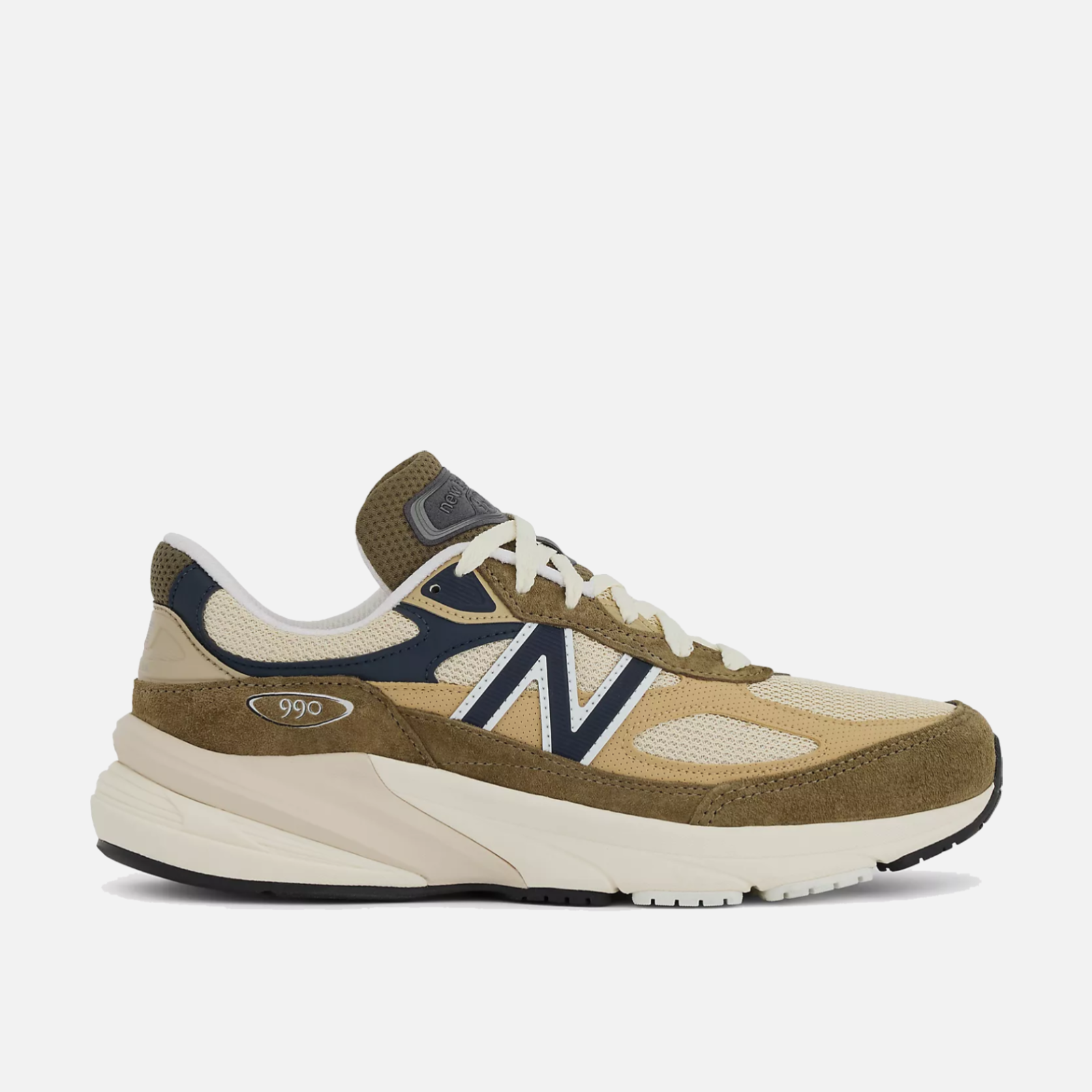 The New Balance 990V6 Made In USA "Dark Camo/Incense" continues the heritage of their 990 line of running shoes that have been the pinnacle of performance and design since 1982. The most recent update to the storied model streamlines the build by eliminating the traditional midfoot saddle and allowing olive pigskin suede panels and tan synthetic leather overlays to flow from heel to toe over the beige mesh upper. The shoe features upgraded features like adding FuelCell foam to the white ENCAP midsole for even more cushioning and propulsion. White laces and lining, reflective elements on the side navy 'N' logo and throughout the upper, New Balance branding on the tongue, toe and rear quarter, Made in USA heel branding and a black and white rubber outsole finish off the design.