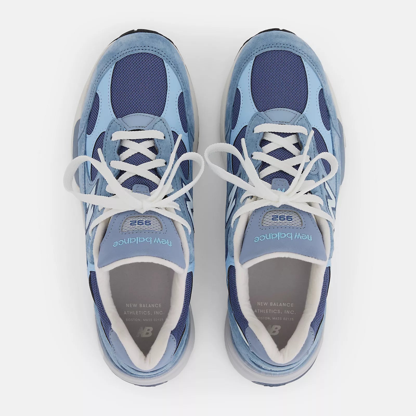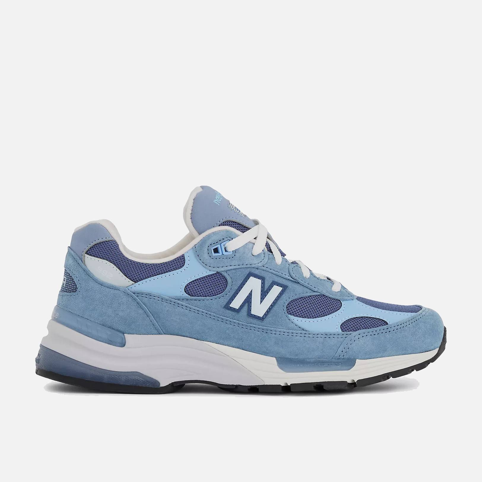 New Balance adds to their fall 2025 "Made" lineup with on the 992 Made in the USA "Dusk Shower". The heritage runner straddles the line between performance and lifestyle, arriving like a burgeoning storm at sunset with a dreamy blue suede over indigo mesh upper, light blue leather accents, white "N" overlays on the sides and a translucent blue TPU heel clip. The shoe sits on a white and grey ABZORB midsole that provides excellent cushioning and energy return, while New Balance branding on the tongue, heel and insole, embroidered USA on the heels and a black rubber outsole finish off the design. Made in the USA.