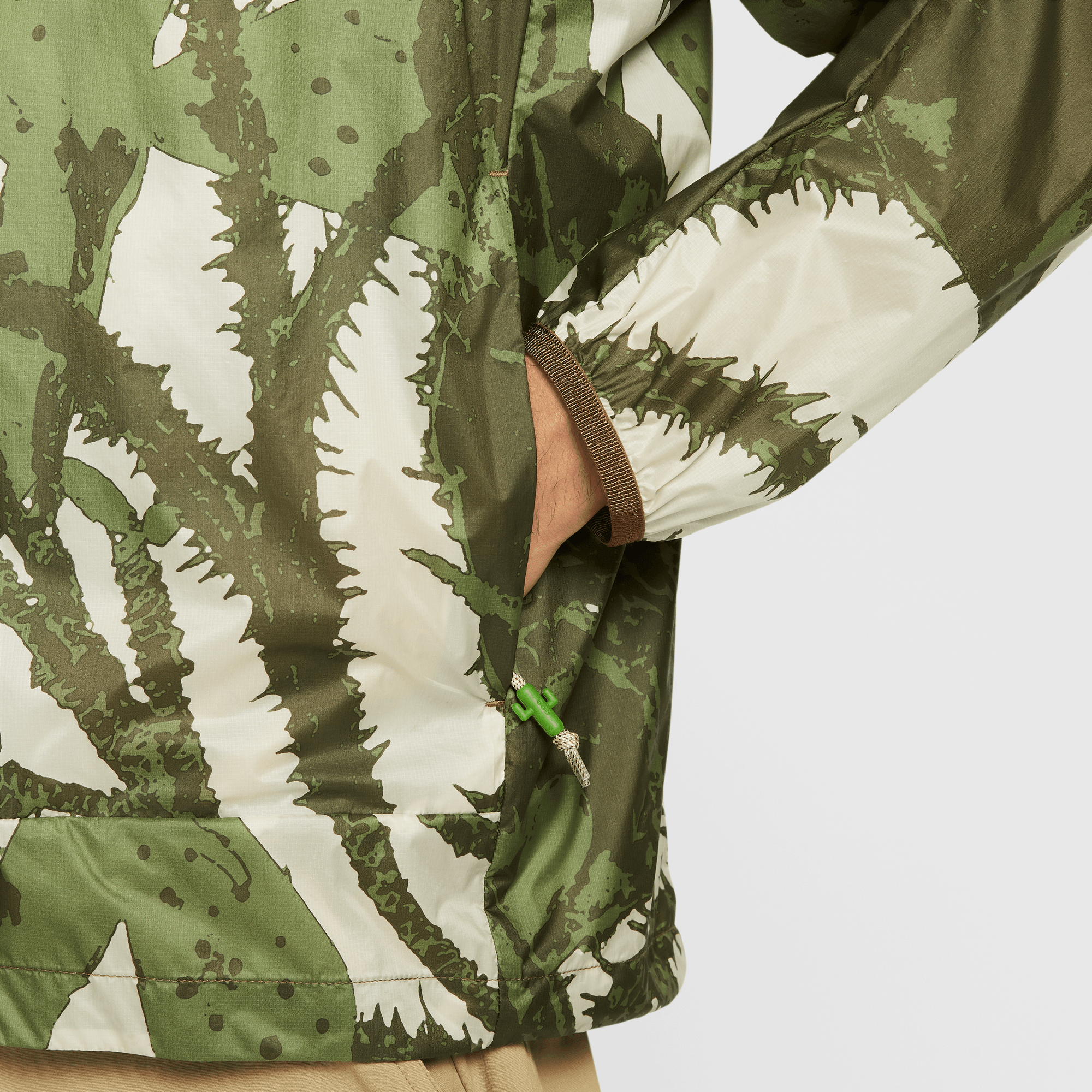 The Cinder Cone Windproof Jacket crams a lot of protection into a packable design. The superlight, water-repellent fabric lets it pack easily into an internal pouch. It's inspired by a canoe camping trip to Big Bend National park in West Texas, and features a desert inspired cactus print. The coat has a roomy fit and an underarm gusset to support a natural movement. A bungee system at the hem and hood lets you adjust your fit. A zipper guard helps protect your neck.