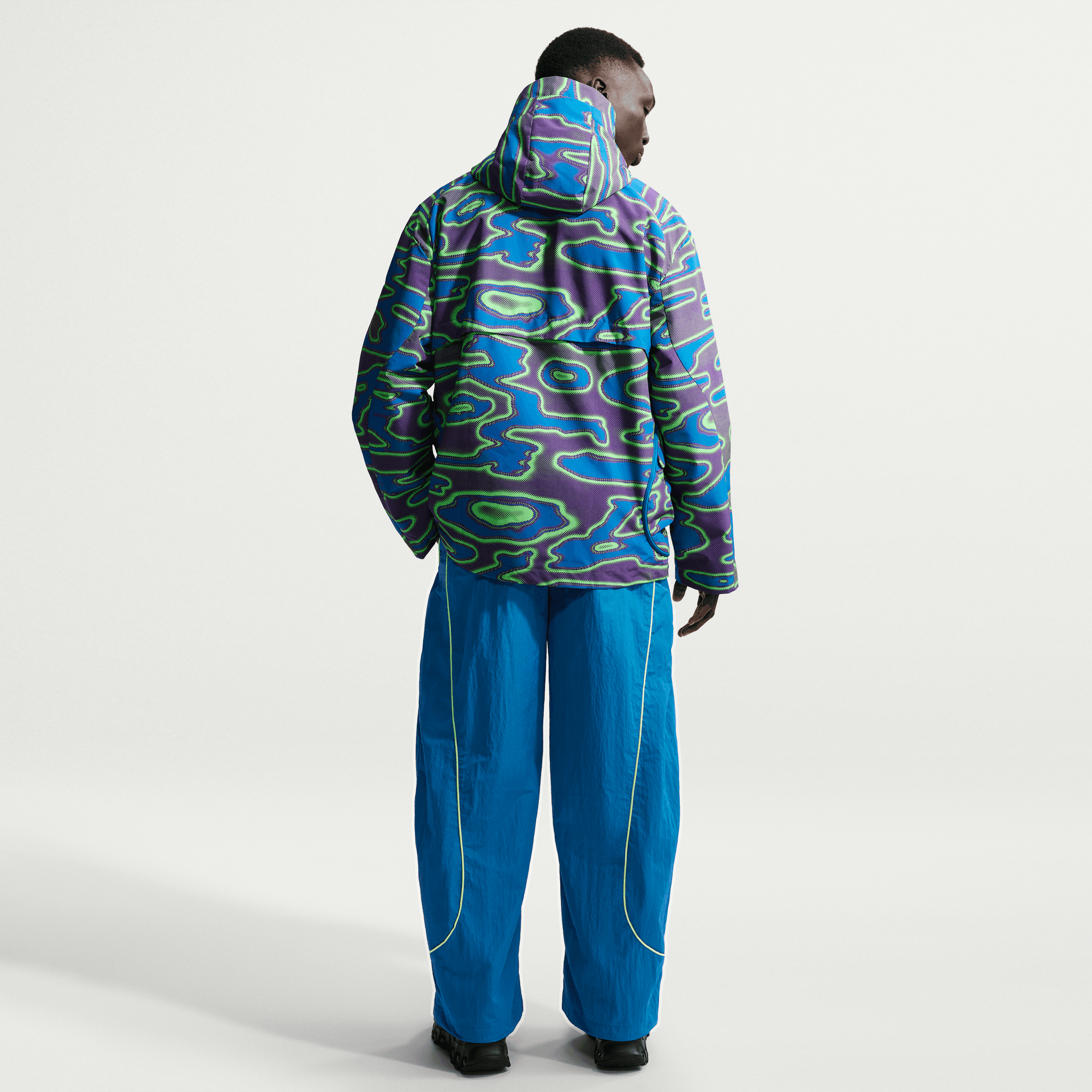 The Project F.R.O.G. Tobi oversize track pants are made from a 73% polyester/27% nylon blend and feature bright silicone piping that trace psychedelic lines on these oversized, woven barrel-leg pants.
