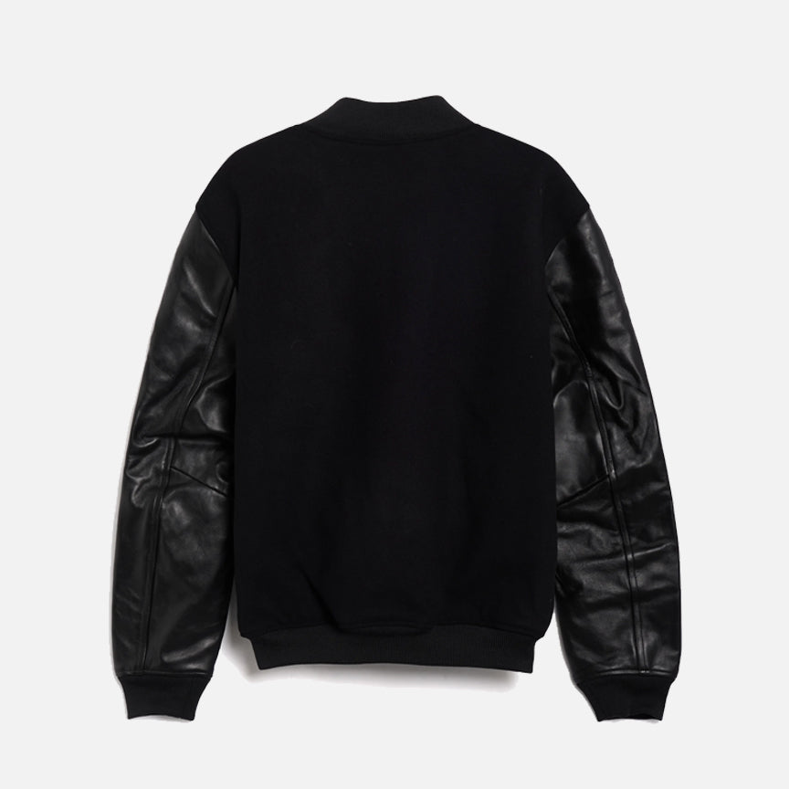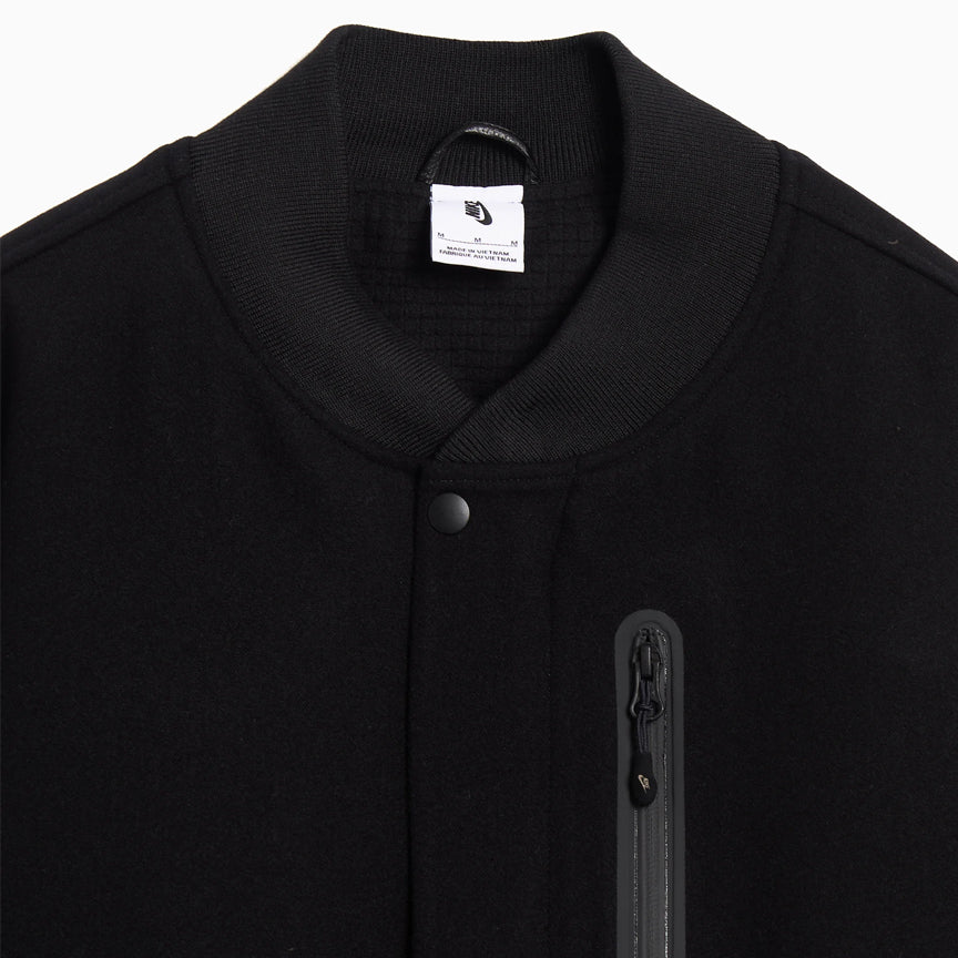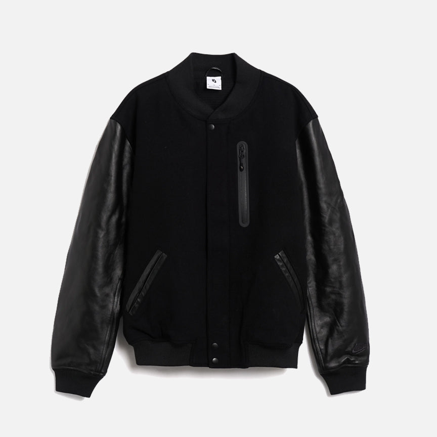 Nike brings casual luxury to an iconic silhouette with the ever-popular Destroyer Varsity Jacket. The jacket pairs full-grain black leather in the arms with a black, 100% water-repellant wool body for that always-on varsity look. Slash welt pockets, zippered chest pocket, concealed full-zip closure, ribbed collar, cuffs and hem, and embossed Nike branding on the sleeve take care of the details. Inside, a smooth woven lining with an interior chest pocket finish off the build.