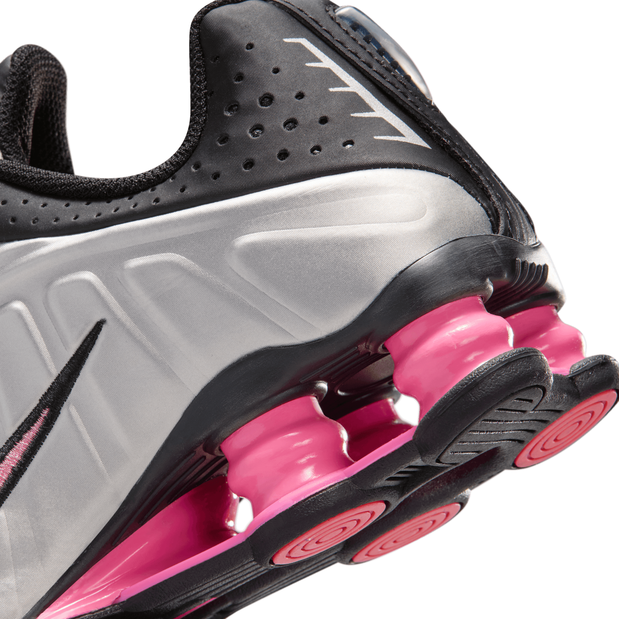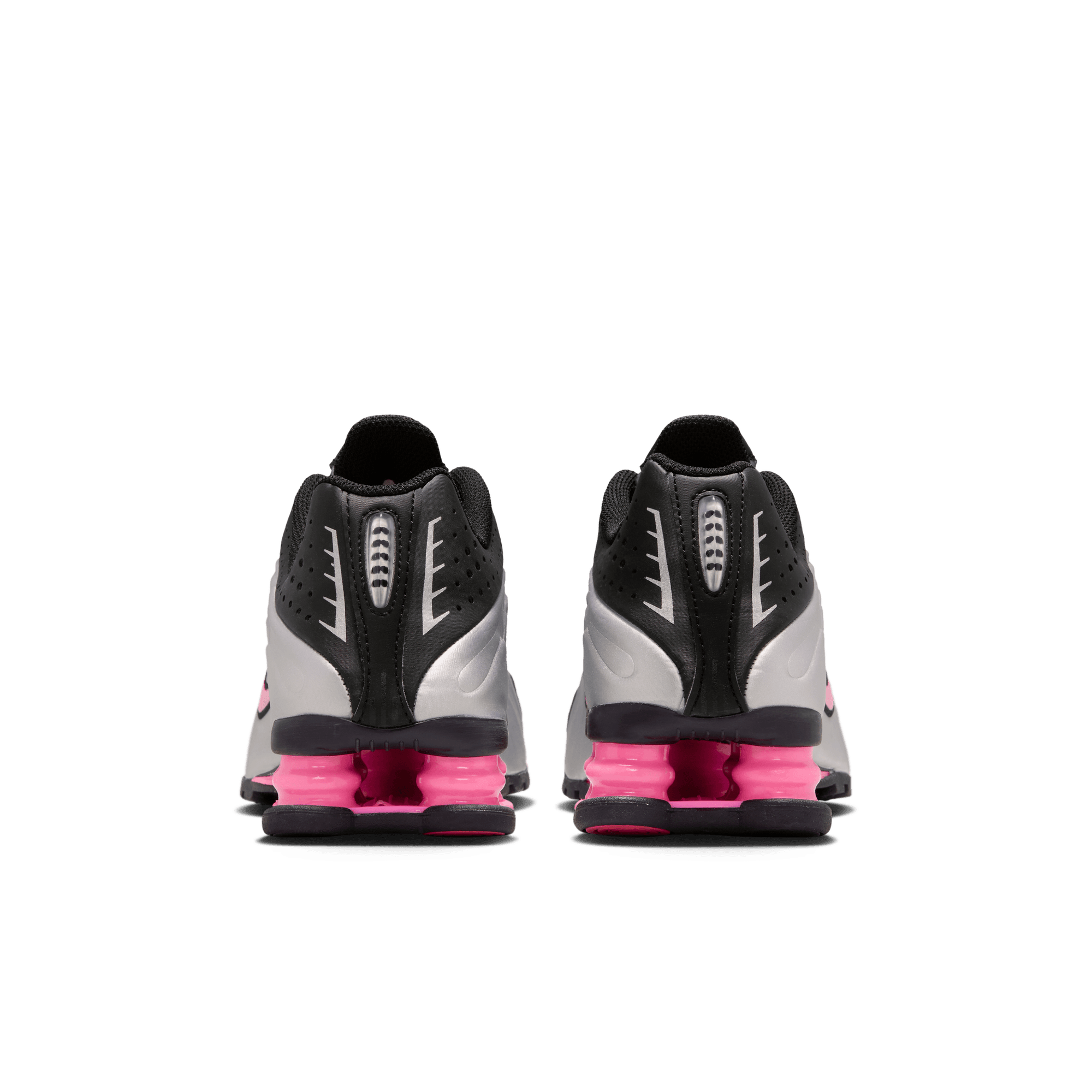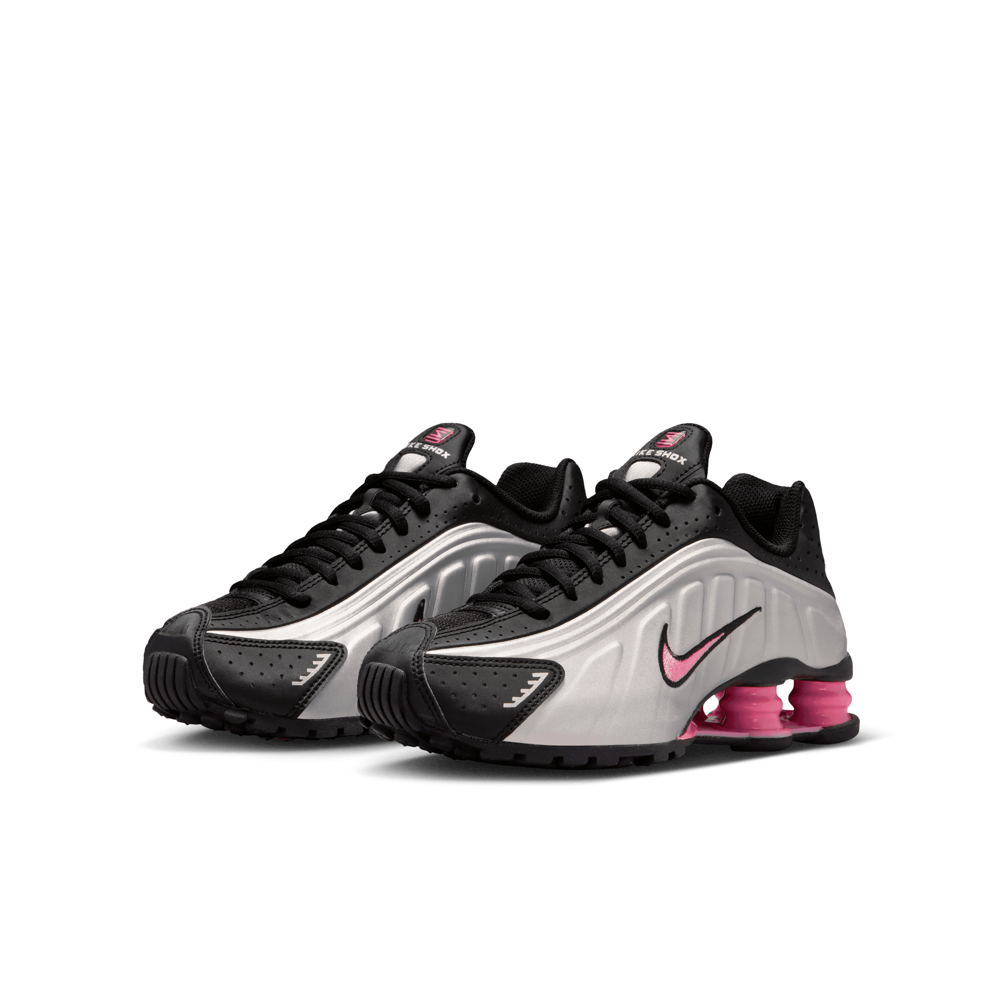 When Nike introduced the Shox R4 in 2001 it was hailed as a technological marvel and instantly became a cult classic, and now they're back again with the Shox R4 "Metallic Silver/Pinksicle". The classic silhouette is back in a black synthetic leather and mesh upper with a metallic silver textured overlay on the sides. An embroidered black and pink swoosh, black laces and lining, and four pink Shox columns in the heel keep the look sporty. Perf detailing on the leather toe cap and heel wrap, reflective details, silver Shox branding on the tongue and heel, and a black and pink rubber outsole complete the design.