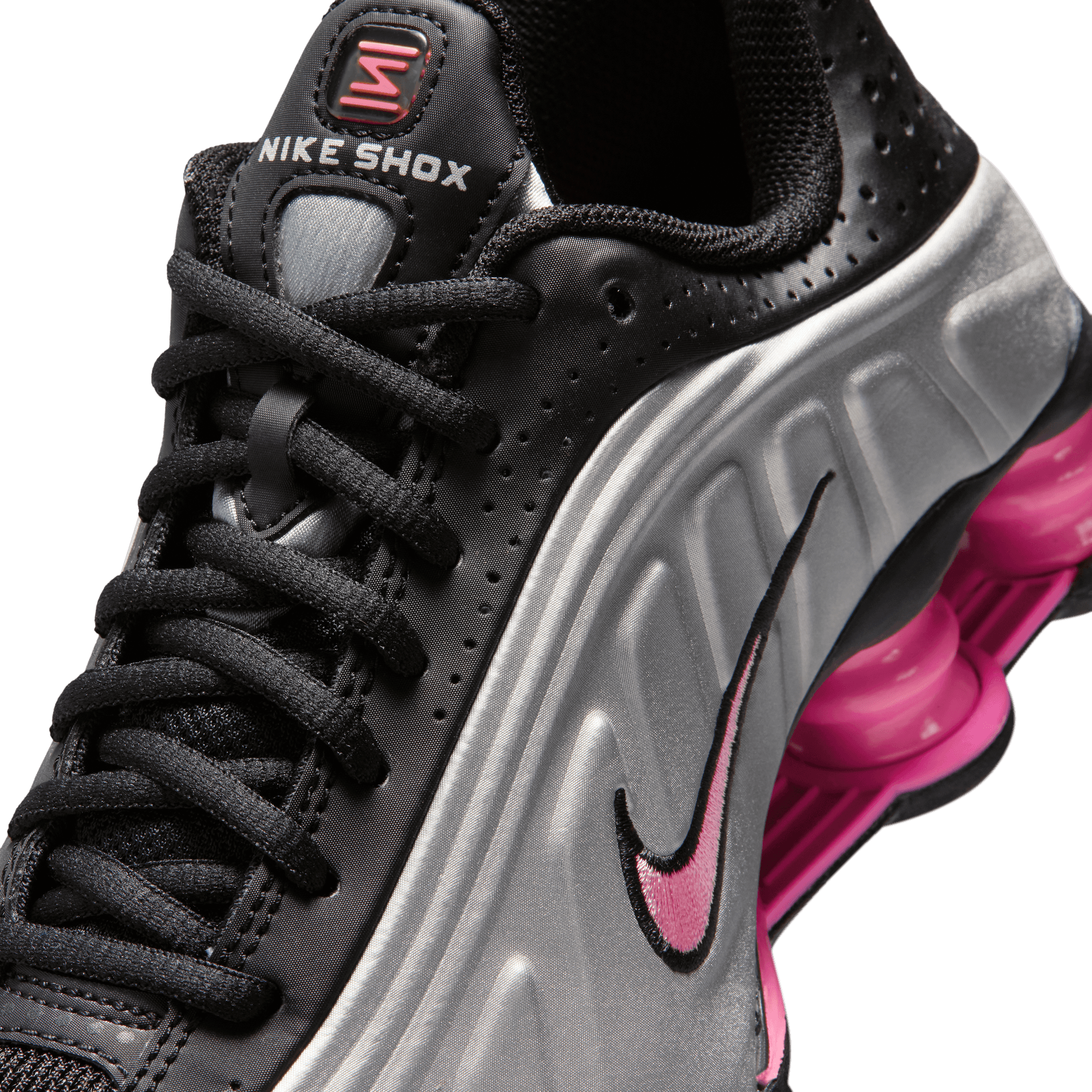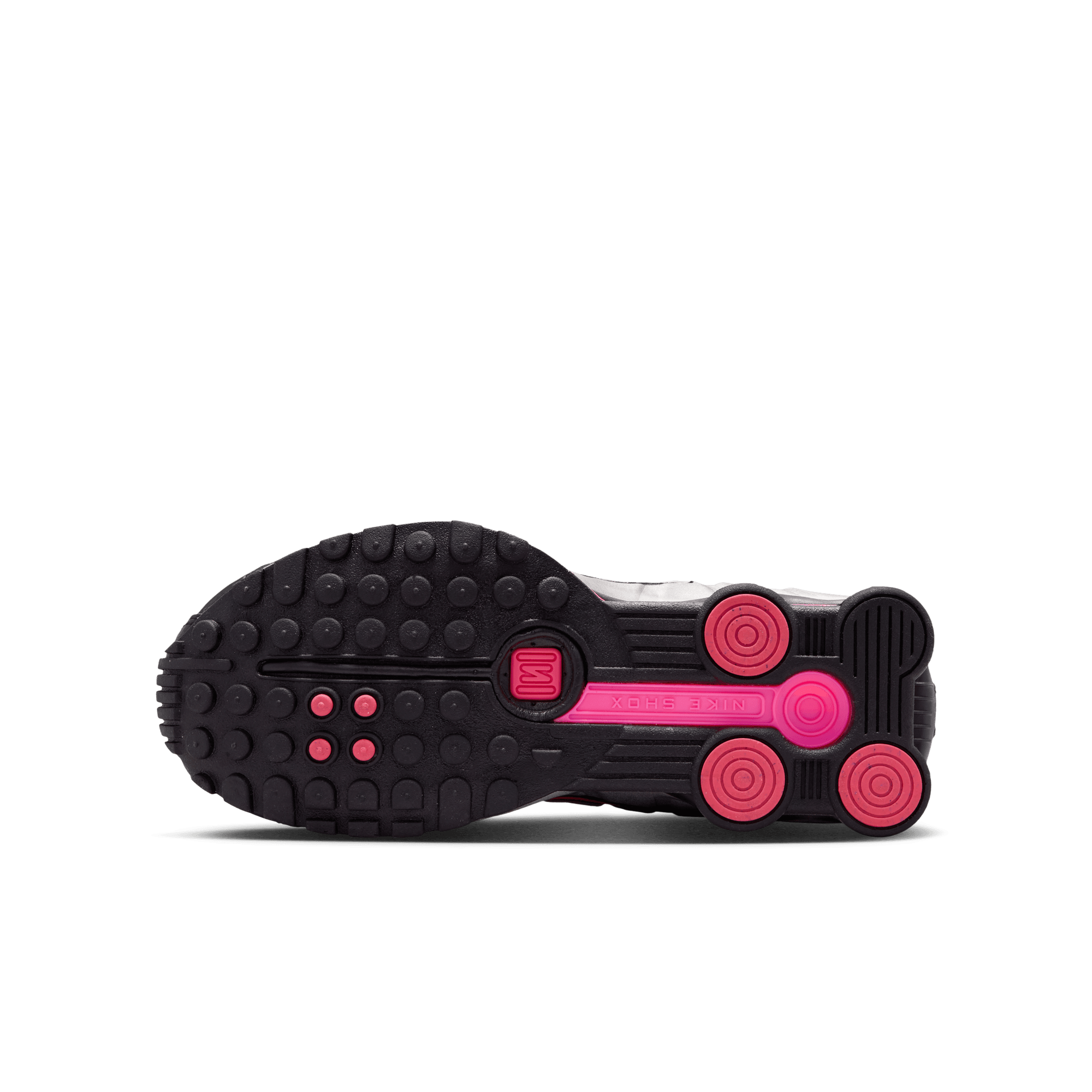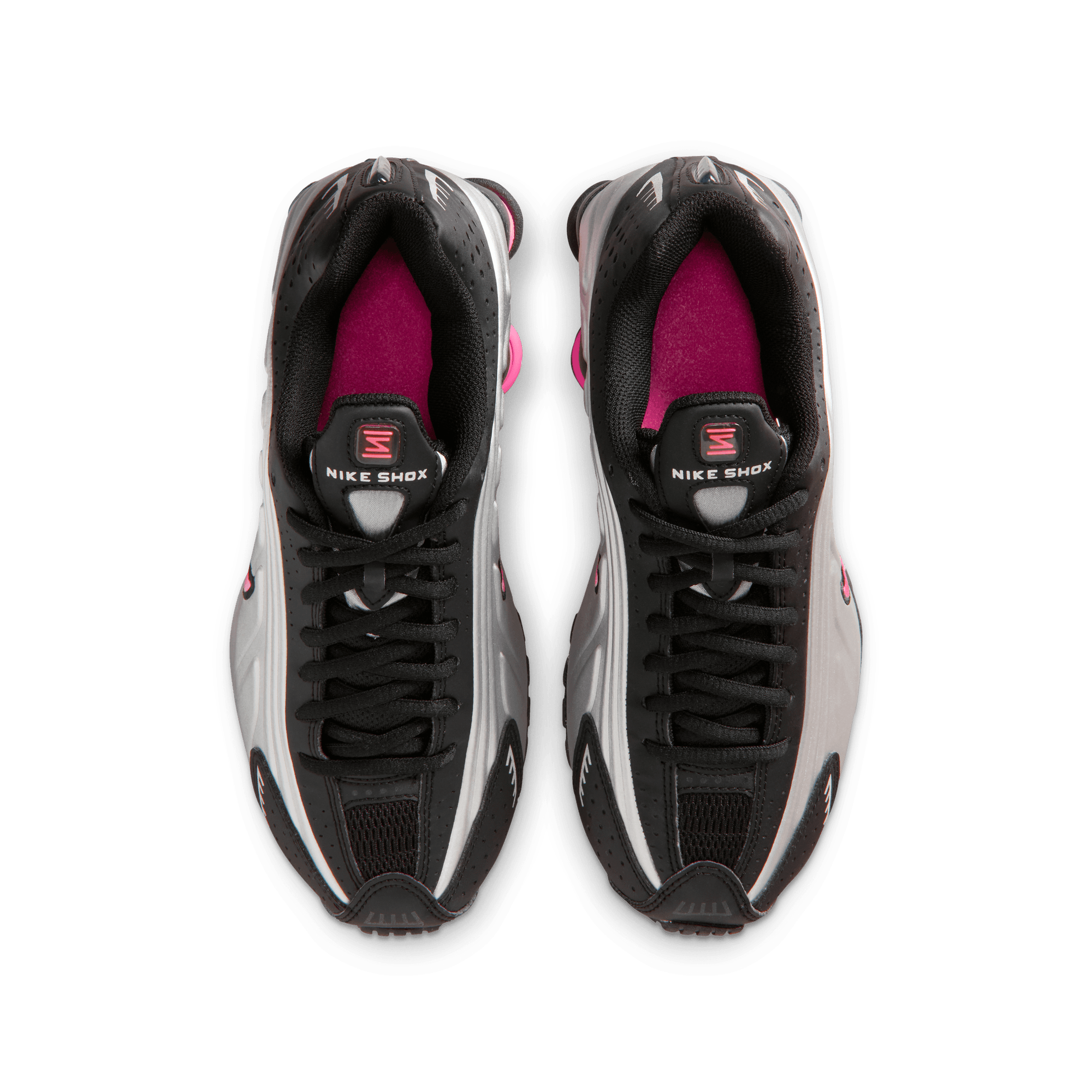 When Nike introduced the Shox R4 in 2001 it was hailed as a technological marvel and instantly became a cult classic, and now they're back again with the Shox R4 "Metallic Silver/Pinksicle". The classic silhouette is back in a black synthetic leather and mesh upper with a metallic silver textured overlay on the sides. An embroidered black and pink swoosh, black laces and lining, and four pink Shox columns in the heel keep the look sporty. Perf detailing on the leather toe cap and heel wrap, reflective details, silver Shox branding on the tongue and heel, and a black and pink rubber outsole complete the design.