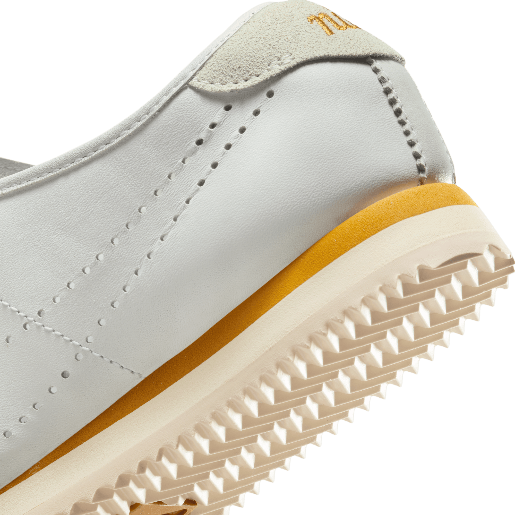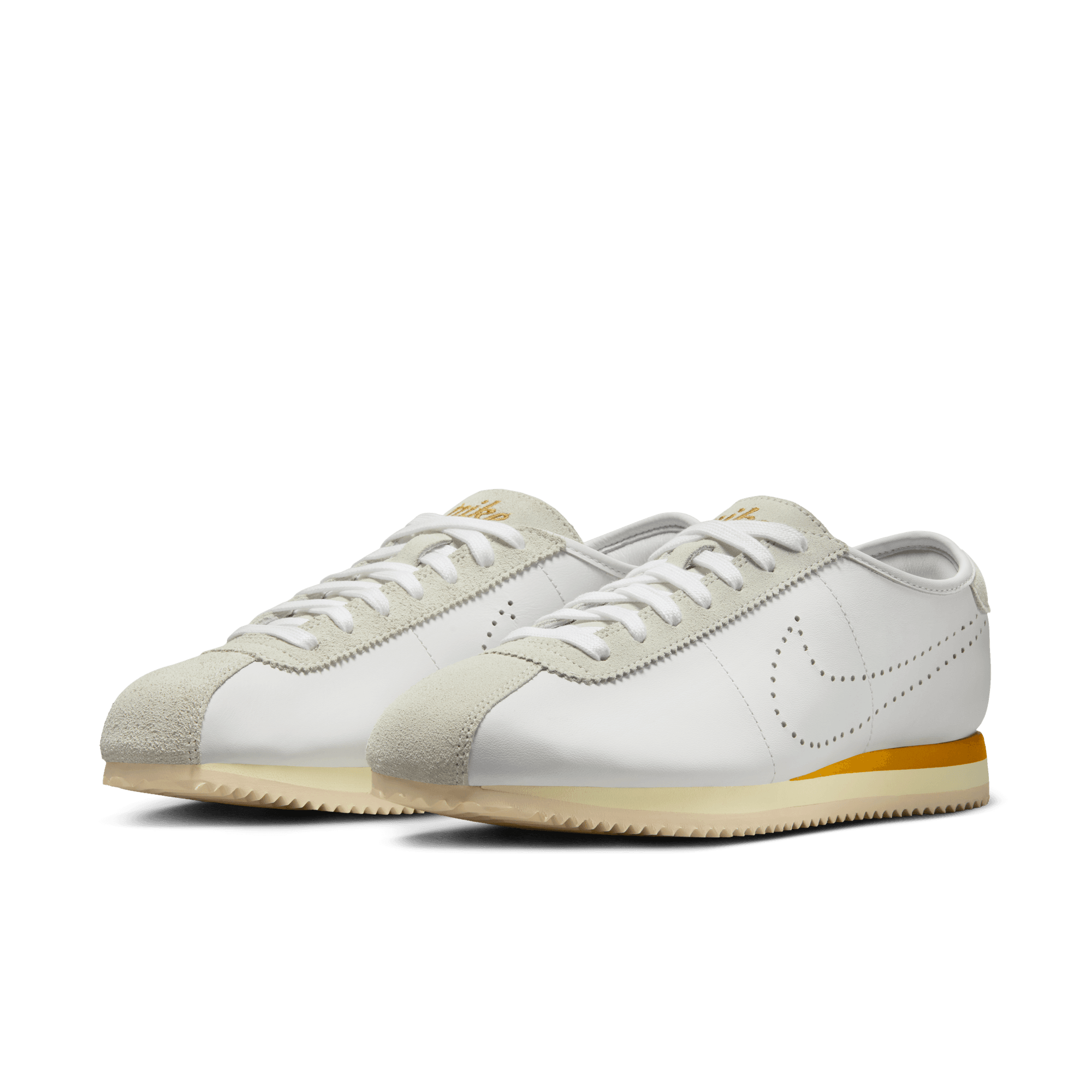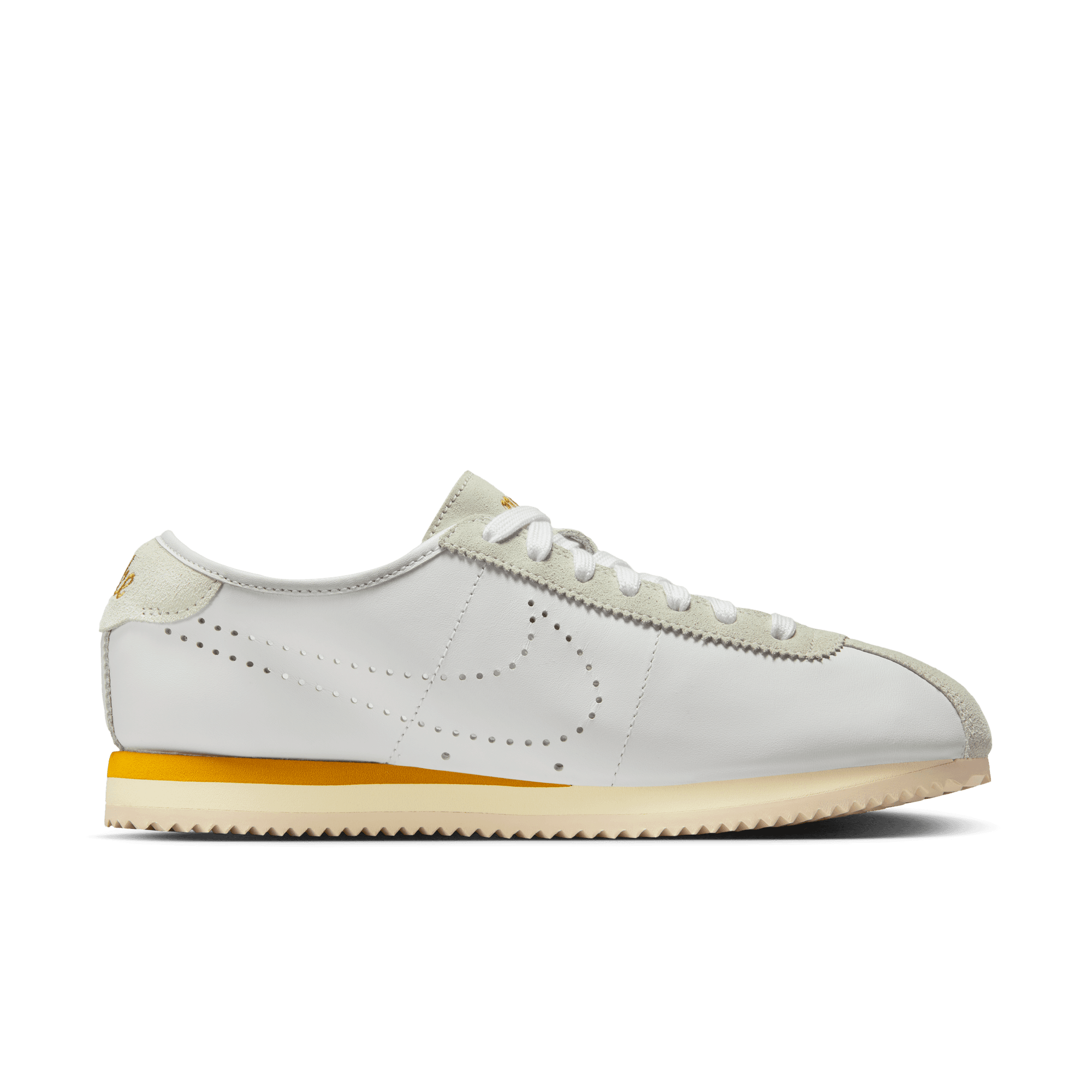 Nike's Cortez silhouette debuted in 1972 and has been one of their most popular styles ever since. The WMNS Cortez Leather "White / Light Bone" is the latest incarnation of the classic silhouette, and is built with a white leather upper and grey suede overlays on the eyestay, toe and heel tab. A perforated outline swoosh replaces the leather swoosh that normally graces the sides, while embroidered Nike branding hits the suede tongue and heel. A soft EVA midsole and a sail sharktooth outsole finish off this certified sneaker staple.