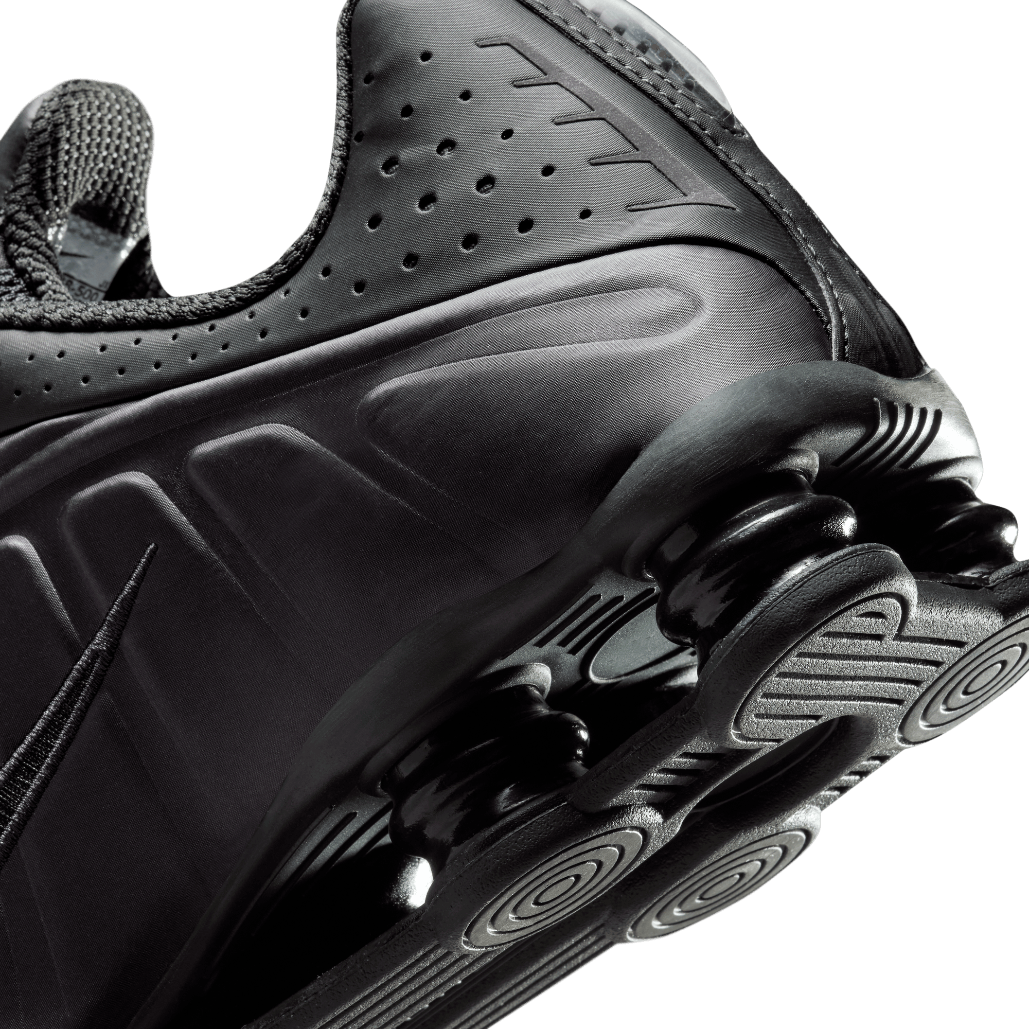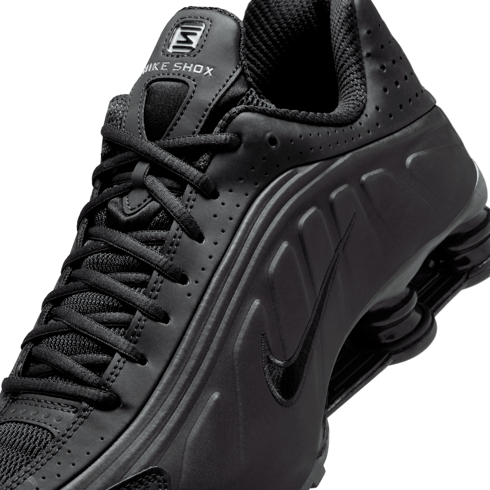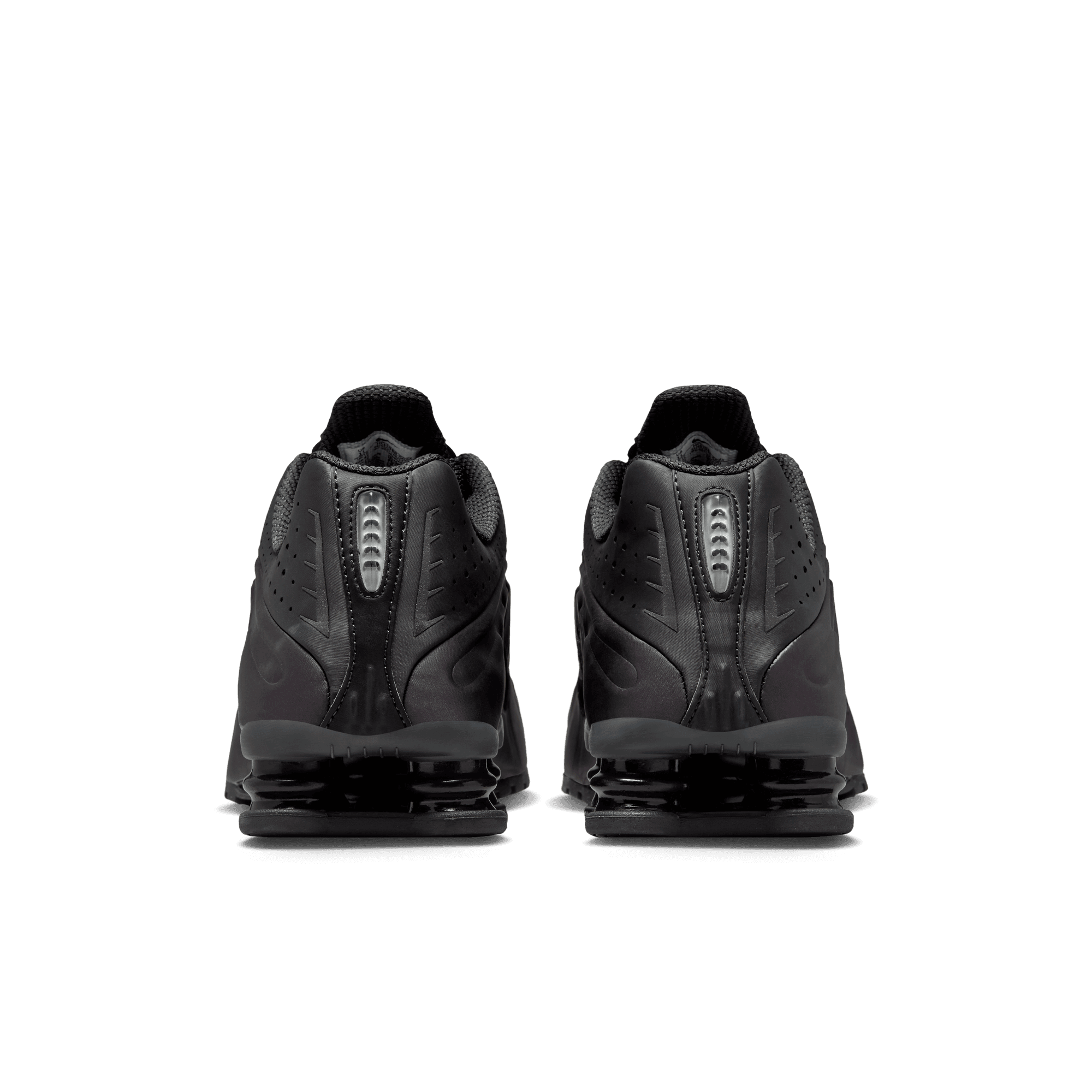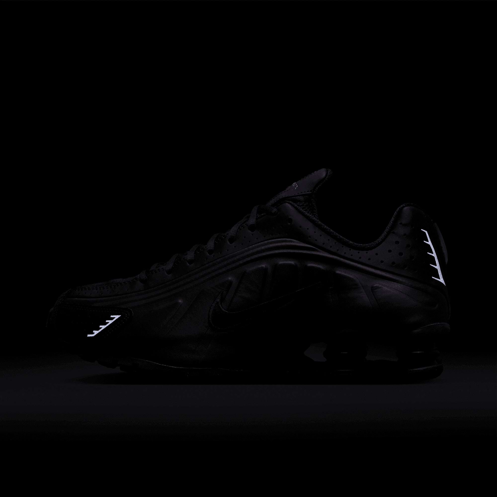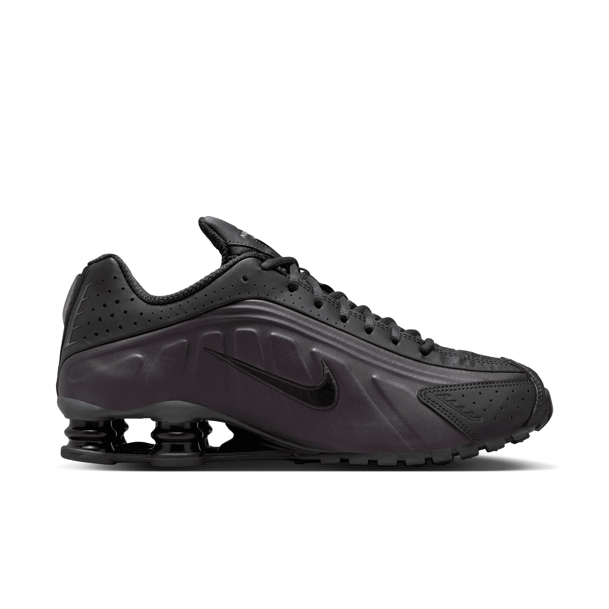 When Nike introduced the Shox R4 in 2001 it was hailed as a technological marvel and instantly became a cult classic, and now they're back again with the Shox R4 "Cave Purple/Off Noir". The classic silhouette is back in a black synthetic leather and mesh upper with a metallic purple textured overlay on the sides. An embroidered black swoosh, black laces and lining and four black Shox columns in the heel keep the look sporty. Perf detailing on the leather toe cap and heel wrap, reflective details, tonal Shox branding on the tongue and heel, and a black rubber outsole complete the design.