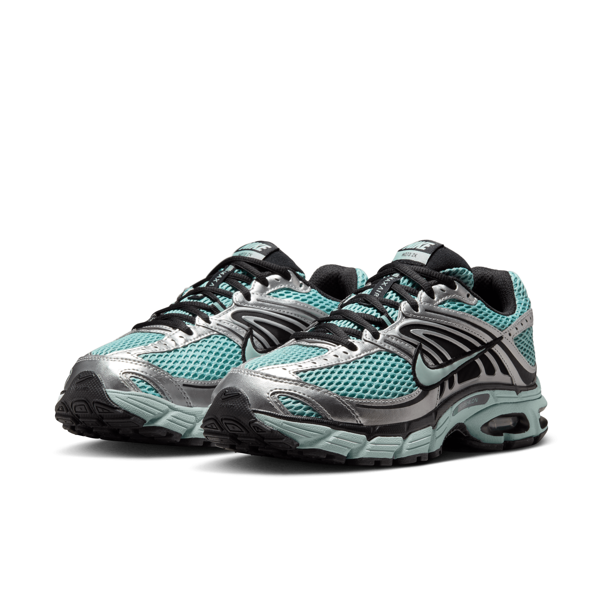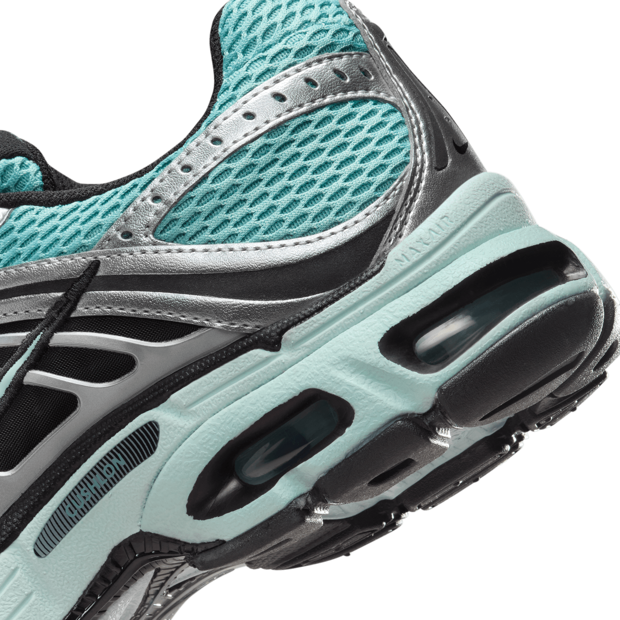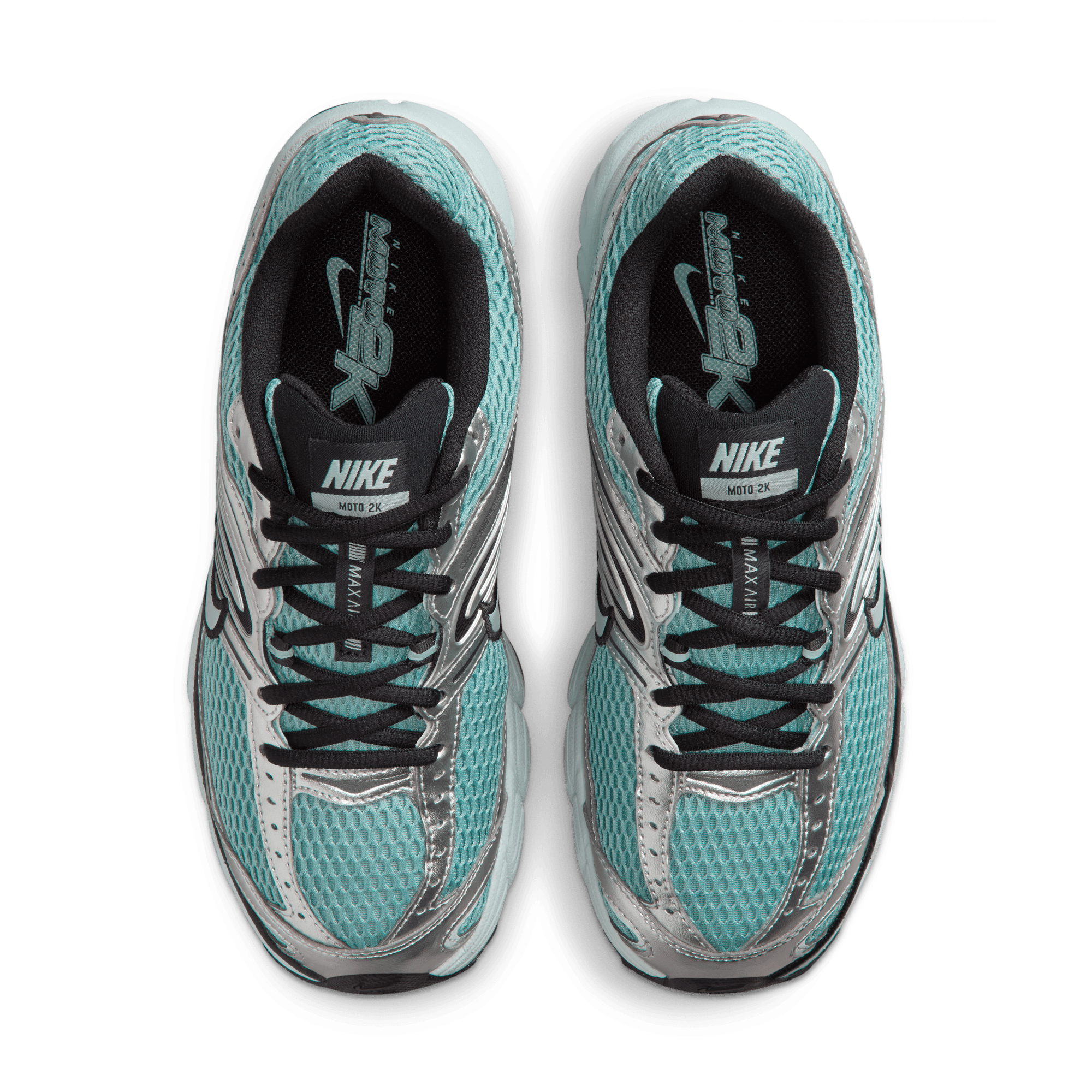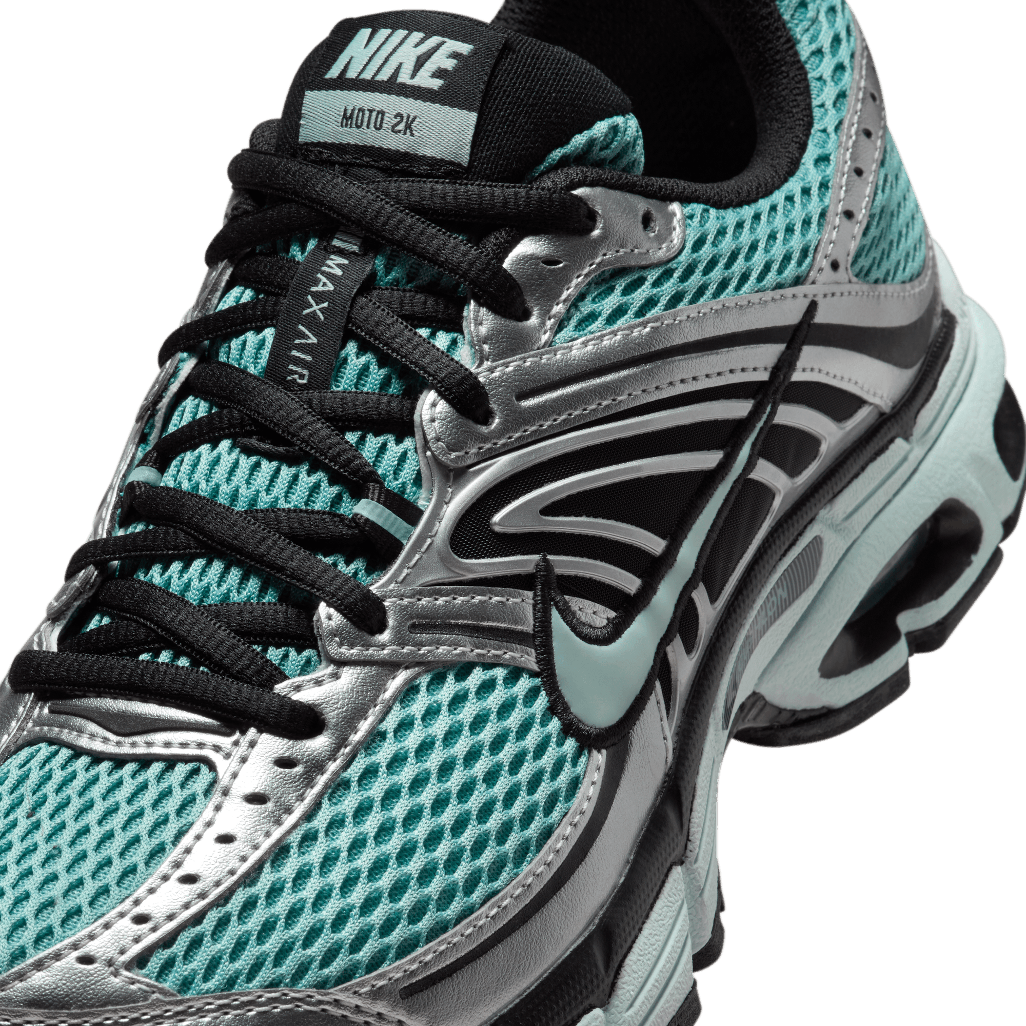 Nike's next tech runner for the masses is here with early-aughts style to spare on the WMNS Air Max Moto 2K. The familiar yet fresh design features a teal, open weave mesh upper layered in synthetic metallic silver panels, 3M reflective details, and a teal swoosh on top of a silver and black TPU side grill. A green Phylon midsole contains plush and comfortable Air Max cushioning, while a black and green rubber outsole completes the look.
