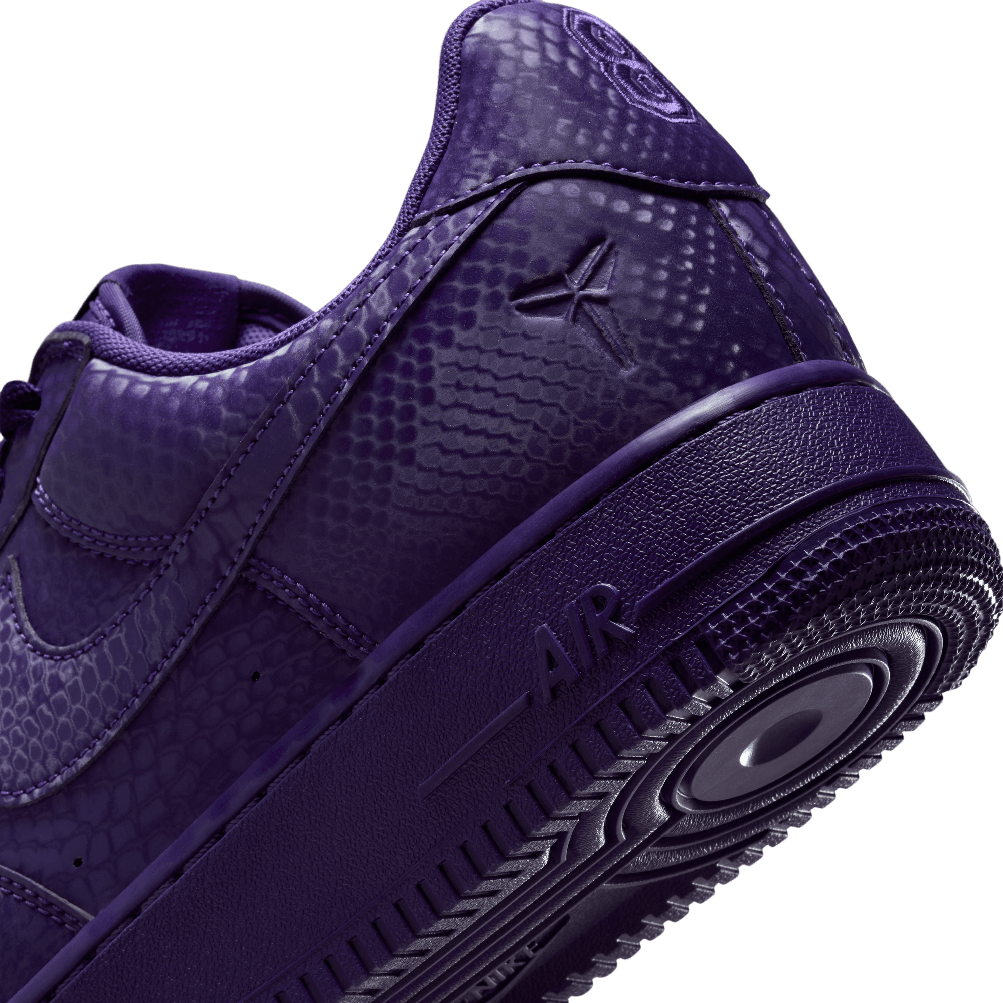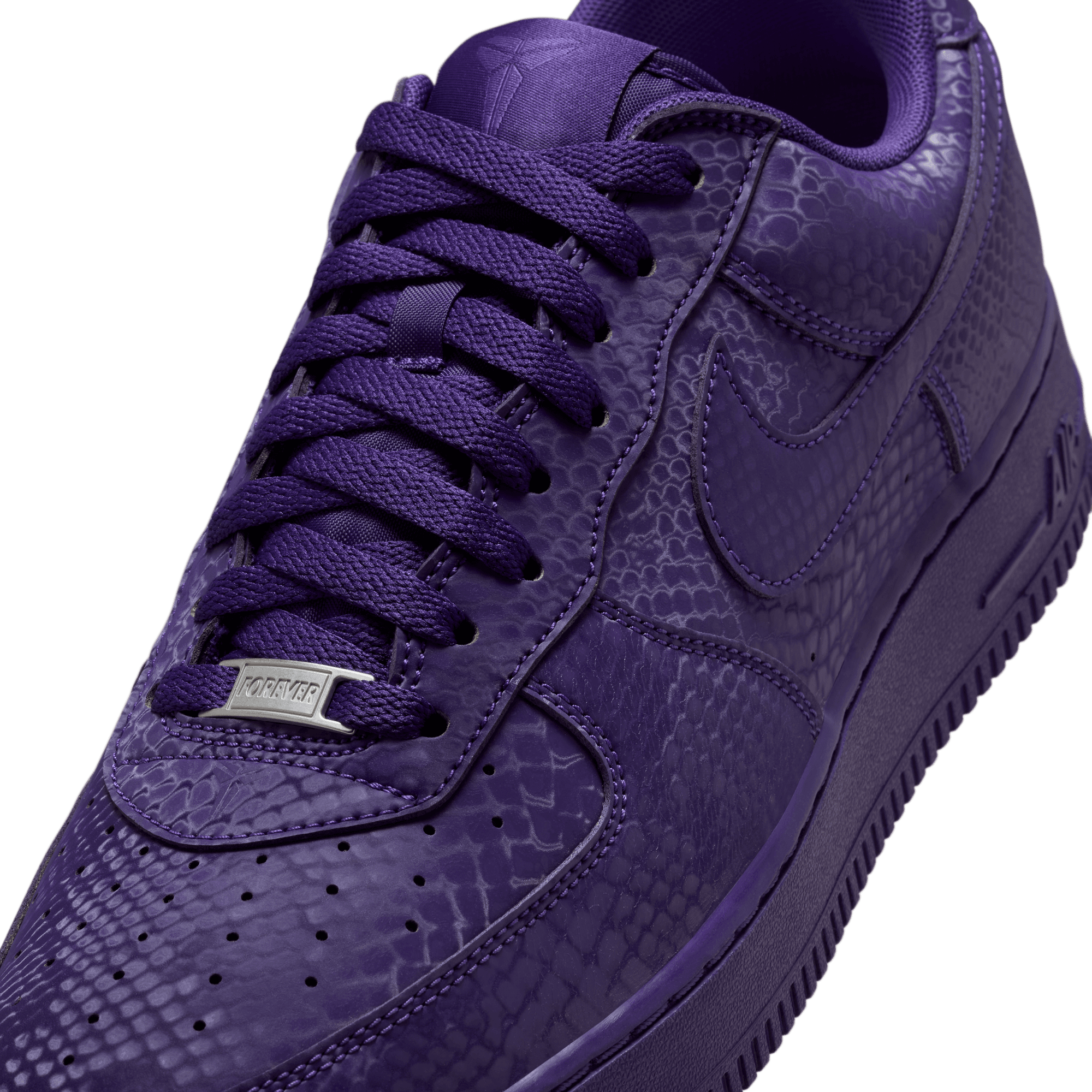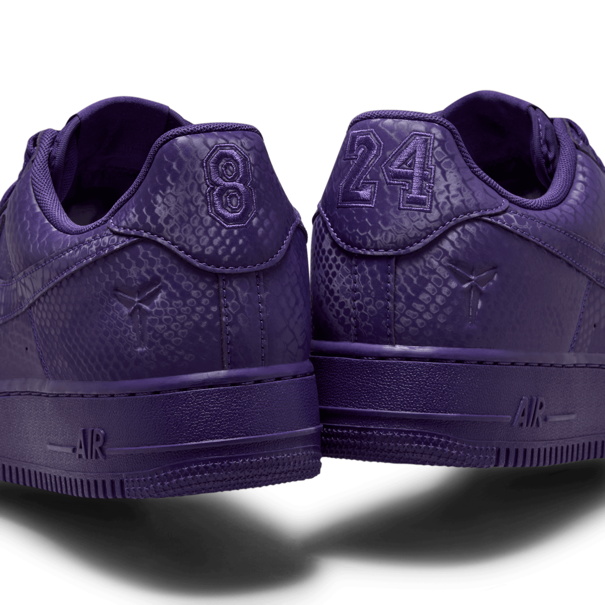 Kobe lends his spirit to another Air Force 1 as Nike follows up this summer's "Forever White" release with the Kobe Bryant x Nike Air Force 1 Low "Court Purple". Leaning into the Lakers' team colors, this AF 1 upgrades the monochromatic purple look with an allover snakeskin embossing on the premium leather upper. Sheath logos hit the tonal woven tongue tag, as well as being debossed on the on lateral heels, while heel tabs boast tonal embroidered 8 and 24. Finally, purple laces and lining, a purple sole unit and silver lace dubraes reading "Mamba" and "Forever" complete the design.