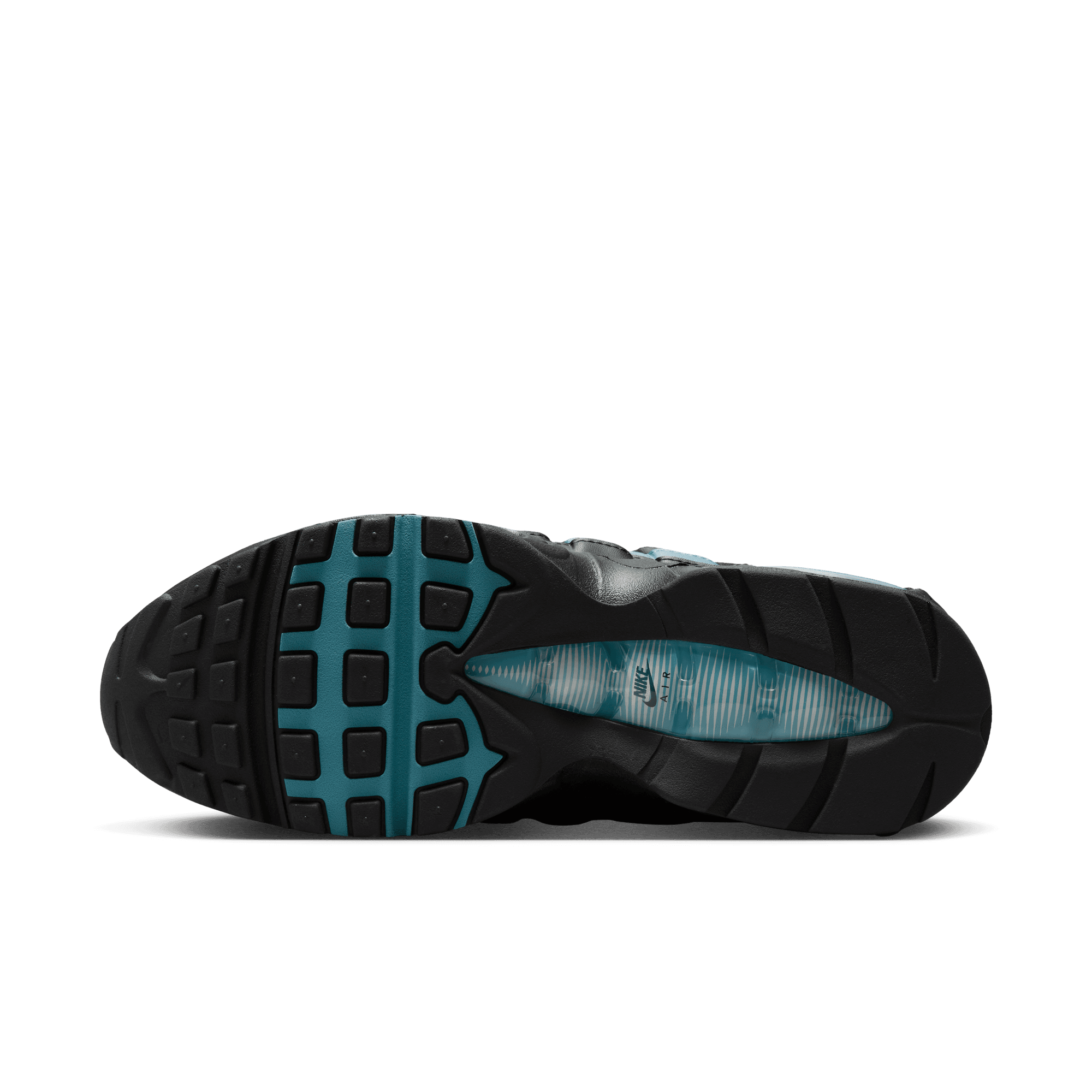 The Air Max 95 continues its 30th anniversary celebration with this dusky version of their OG "Big Bubble" design: the Air Max 95 OG "Smokey Blue". The multi-layered upper uses black as a base color, with tonal mesh and leather hitting the wavy stripes below the black mesh saddle, with a large smokey blue leather stripe right in the middle. Reflective silver accents hit the throat and heel tab, with a blue hue on the 'Big Bubble' Max Air units located in the forefoot and heel of the chunky black midsole. Like the previous Air Max 95 OG releases, the shoe's original PSI markings are listed on the bottom of the Max Air unit on the black rubber outsole, while embroidered blue branding hits the tongue and heel.