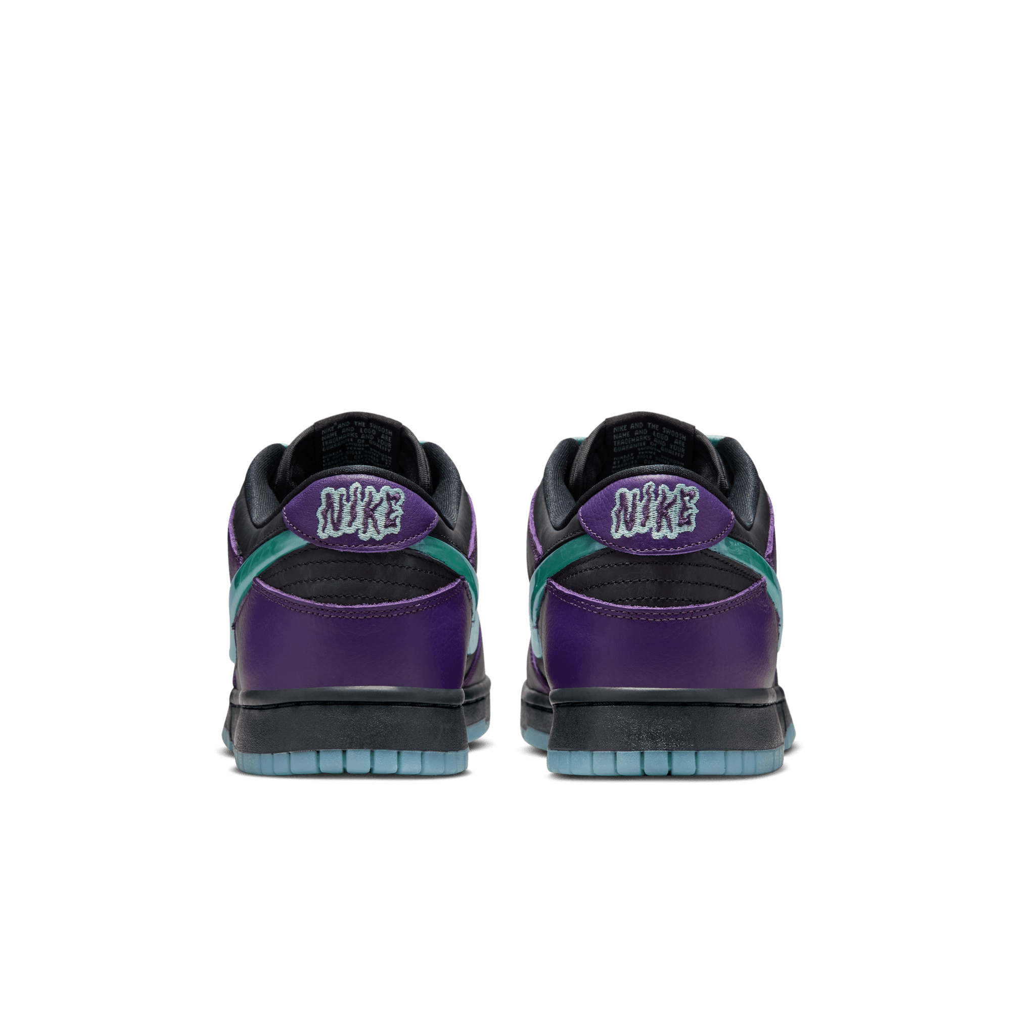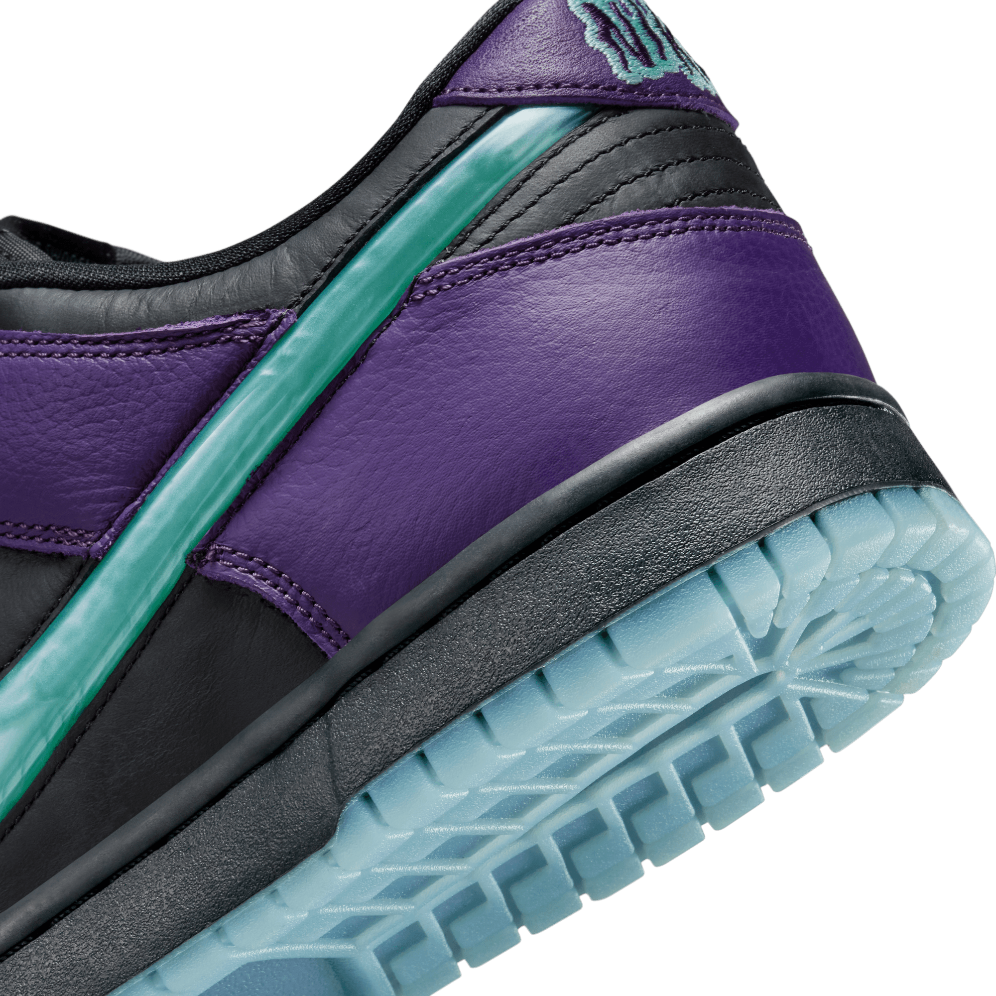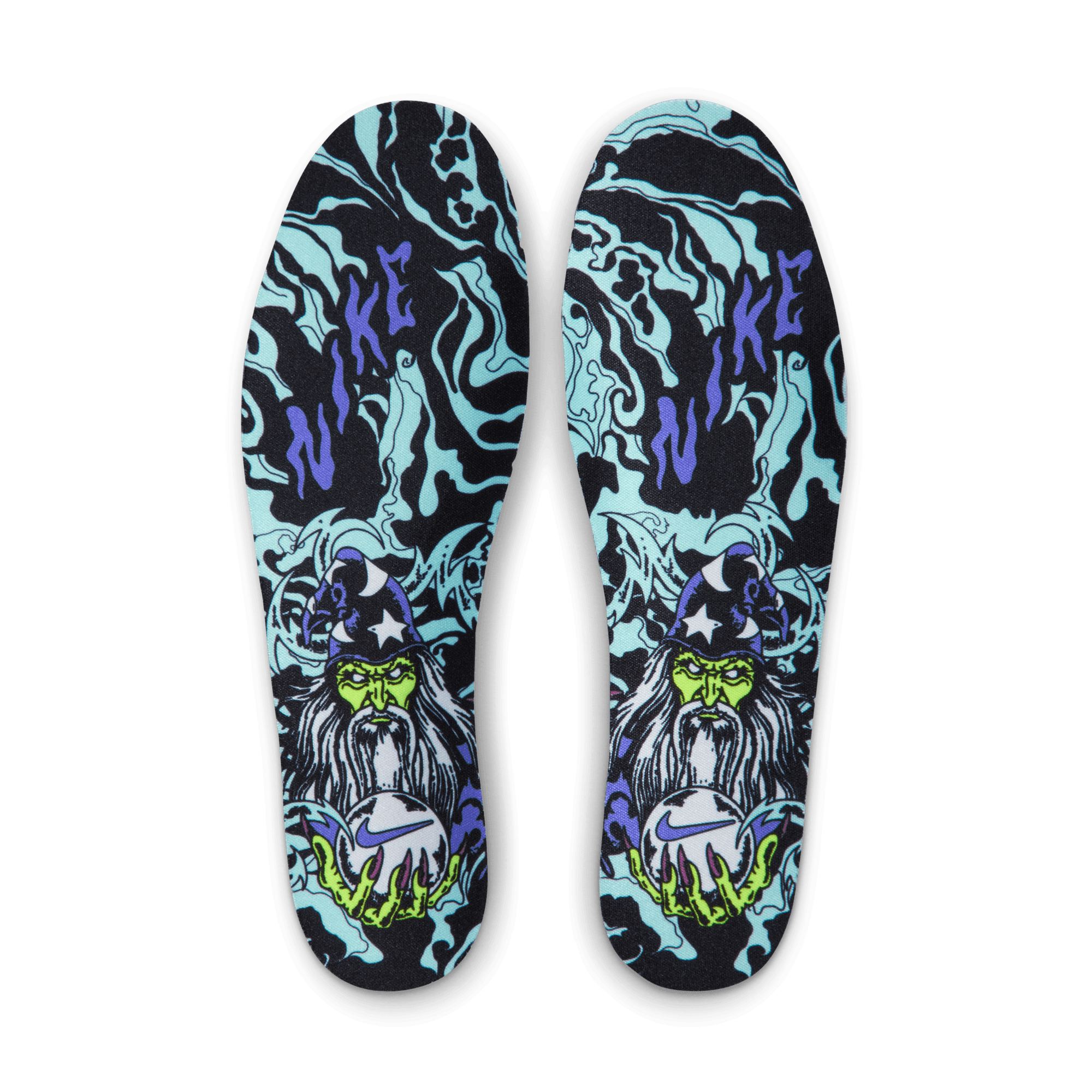 Nike's yearly Halloween tradition is back, but this year the Dunk trades in its usual ghoulish costume for something more mystical on the Dunk Low Retro LTD "Wizard". The iconic silhouette is dressed in a smooth black leather upper with purple tumbled leather overlays in the traditional Dunk color-blocking. The wizard theme really comes into play on the graphic insoles featuring a spooky green wizard, crystal ball woven tongue tags, and the signature detail - the crystal ball-like smokey blue molded swoosh. Ghostly Nike branding on the heel, blue laces that match the swoosh, black midsole and icy blue outsole finish off this frightfully good release.