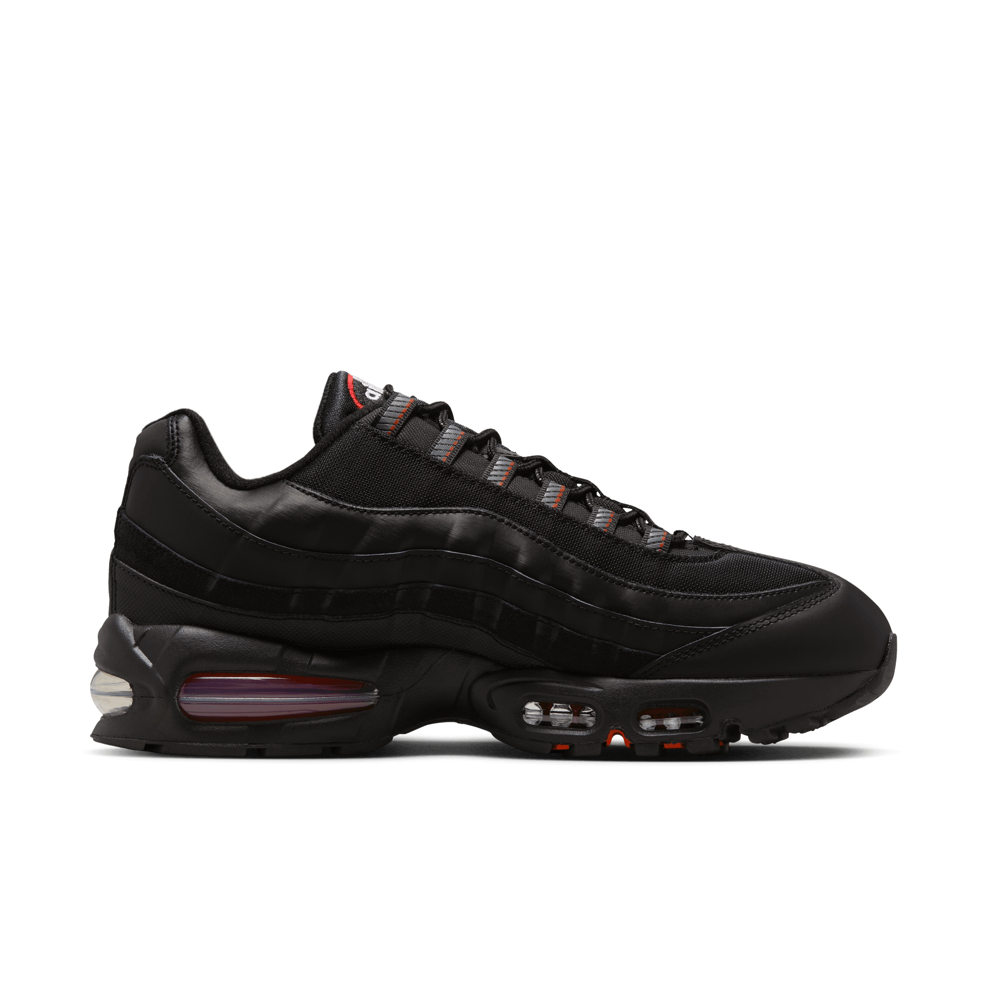 The Air Max 95 continues its 30th anniversary celebration with this race car-inspired version of their OG "Big Bubble" design: the Air Max 95 OG "Black/University Red". The multi-layered upper uses black as a base color, with tonal mesh, suede and leather hitting the wavy stripes below the black mesh saddle. Red and grey accents the lace loops, embroidered branding on the tongue and heel, and racing-style graphic on the insole. Red 'Big Bubble' Max Air units located in the forefoot and heel of the chunky black midsole, and a red black rubber outsole complete the design.