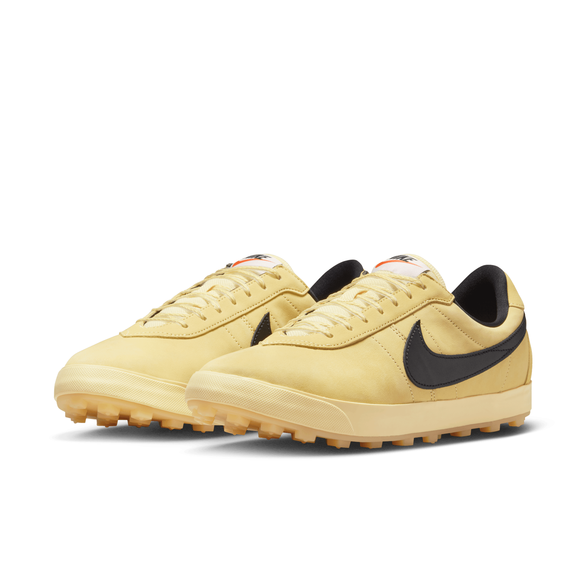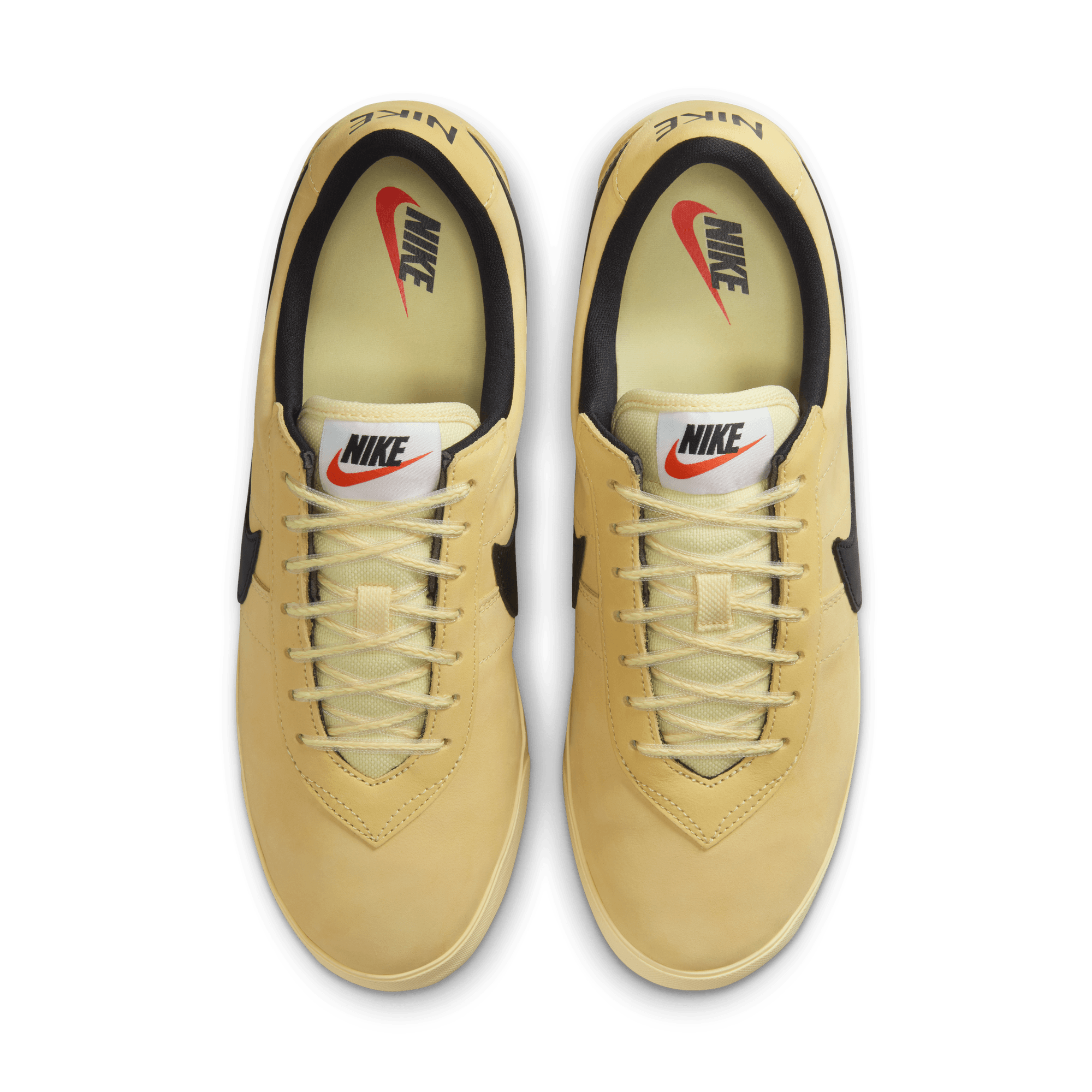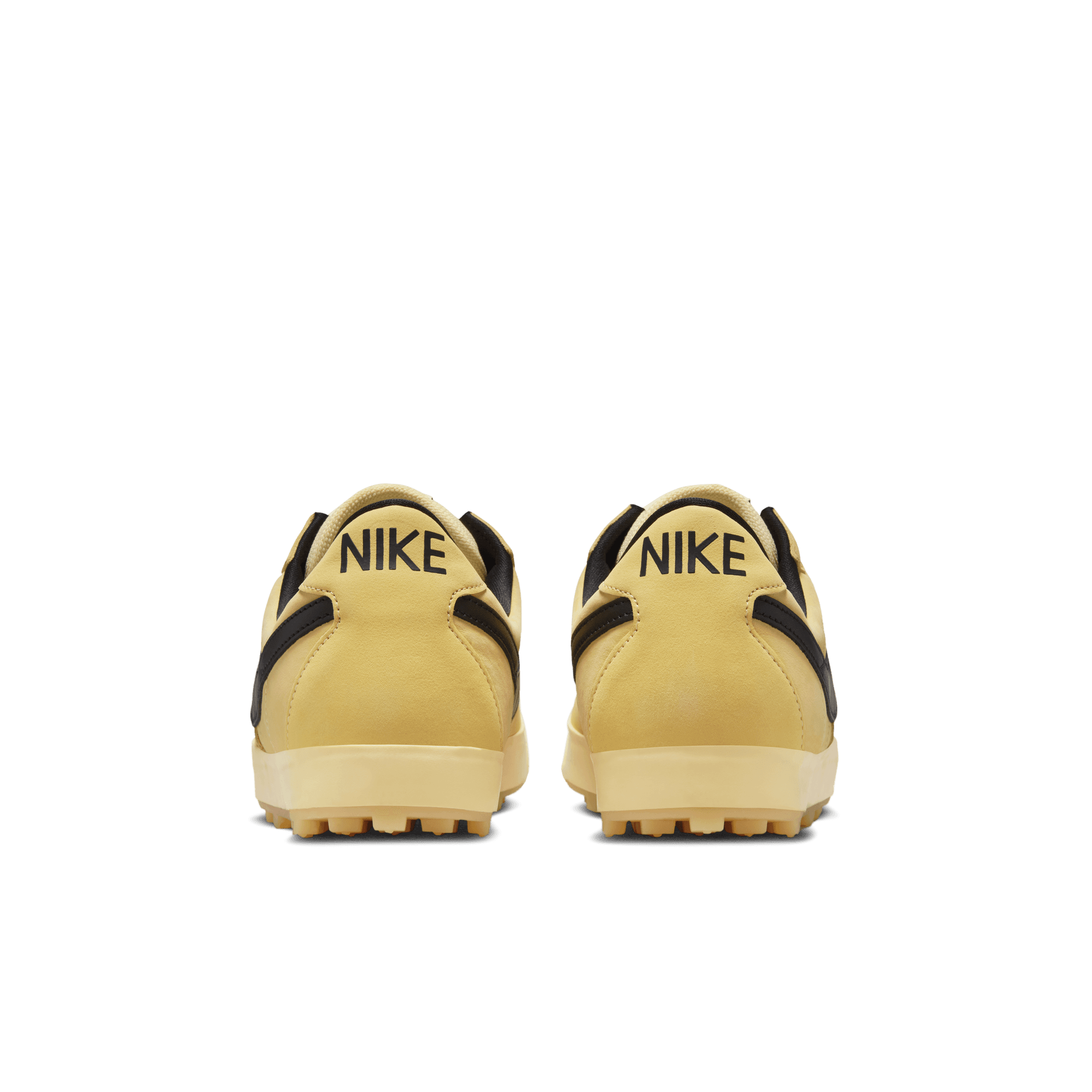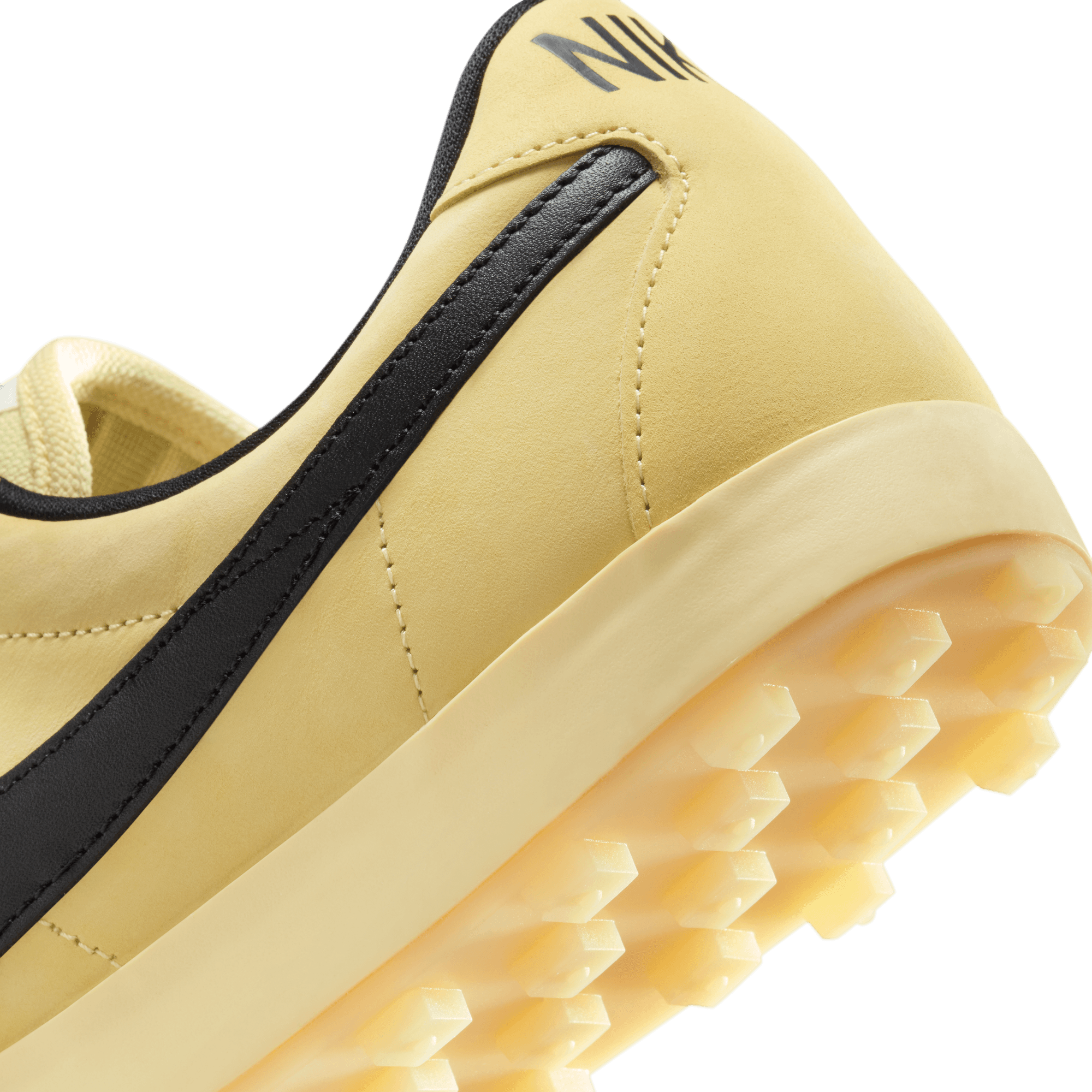 Nike earliest football shoe is resurrected as a streetwear staple over fifty years after its debut with the Astrograbber QS "Soft Yellow". Debuting on the heels of Nike's Waffle Trainer, the state-of-the-art Astrograbber was designed to better grip the old school (astro) turf on American football fields. Now, the iconic football shoe from '74 returns in an updated construction of a light yellow premium leather upper accented by a black leather swoosh, black laces and lining. A white tongue tag and embroidered black vintage Nike logo on the heel, and yellow rubber sole dotted with square lugs completes the design.