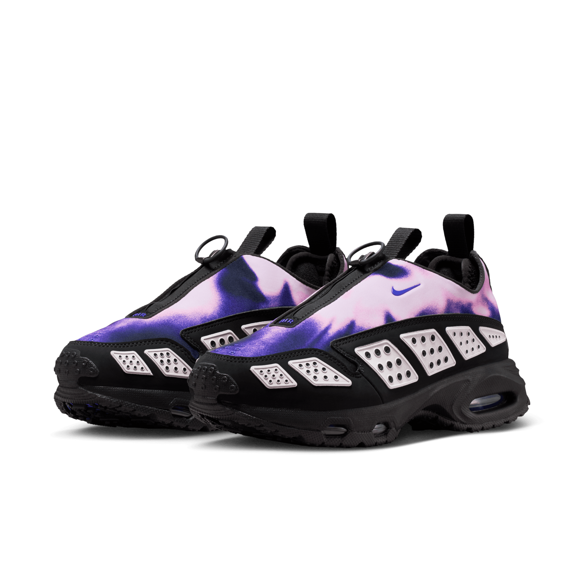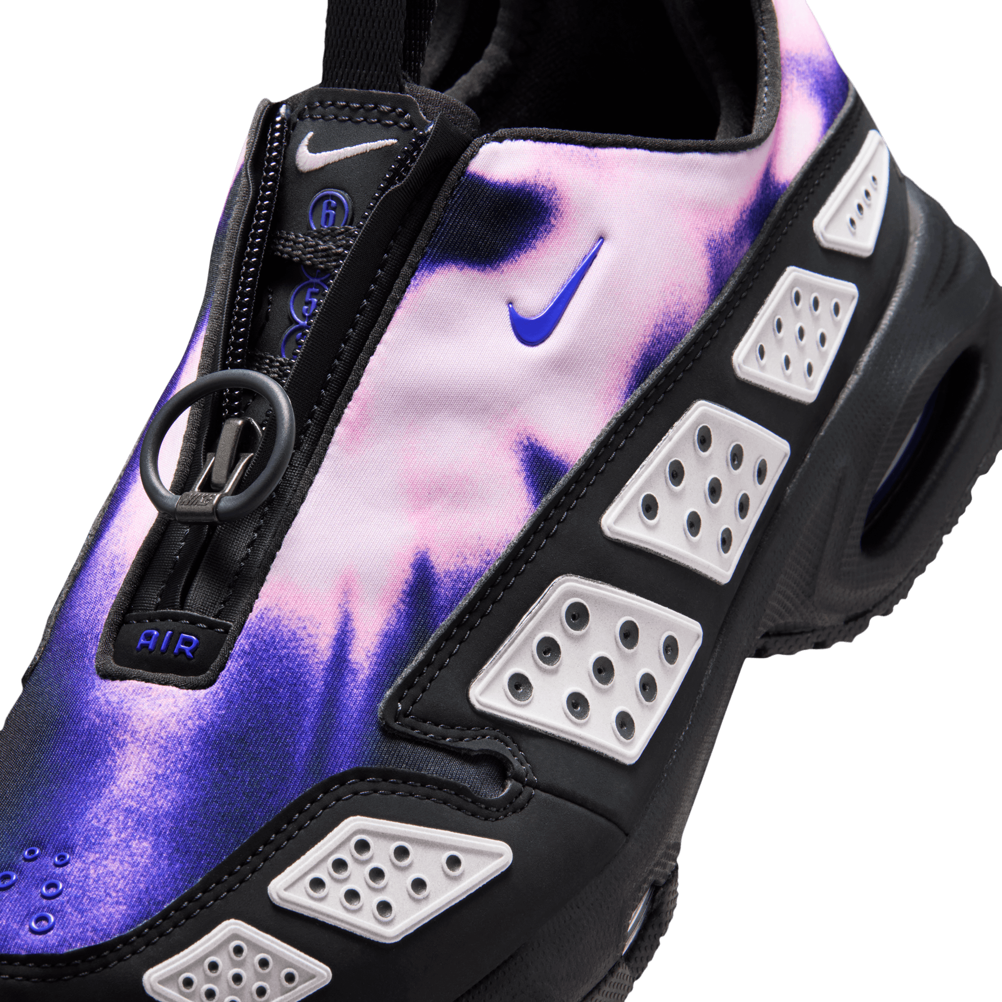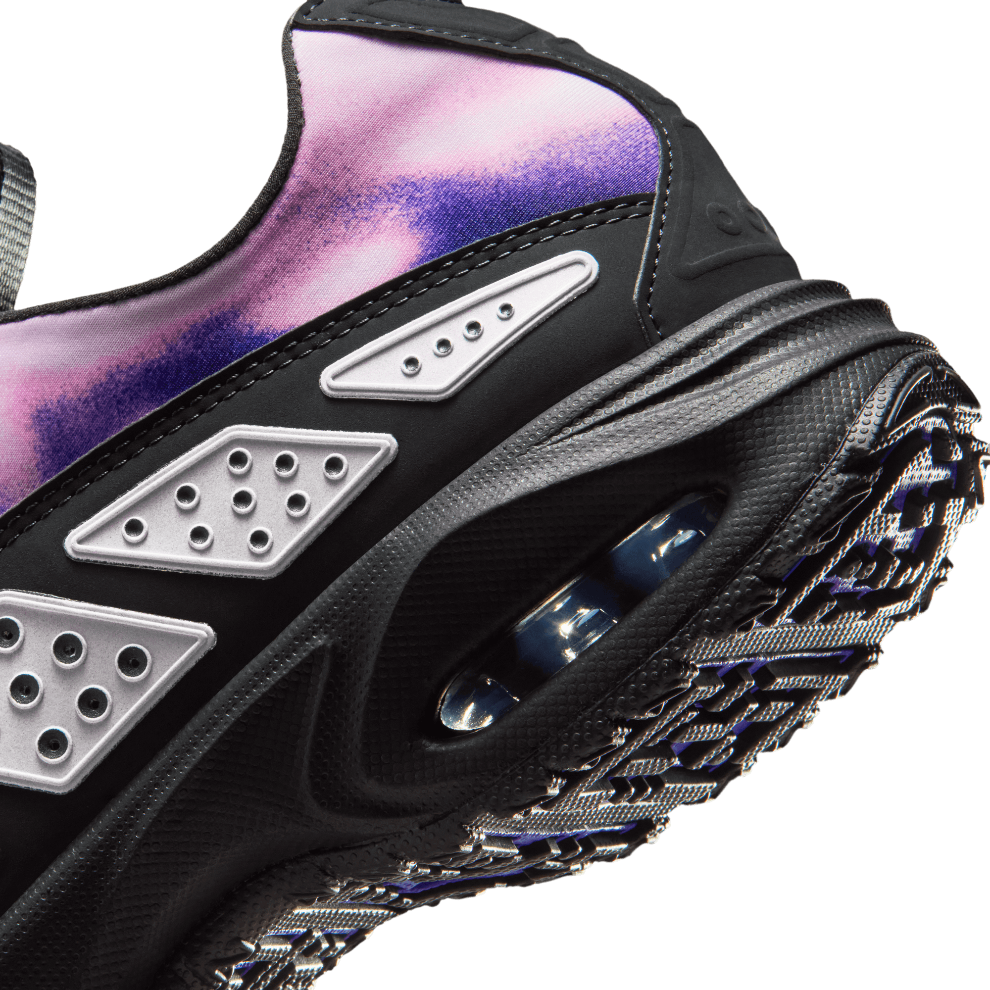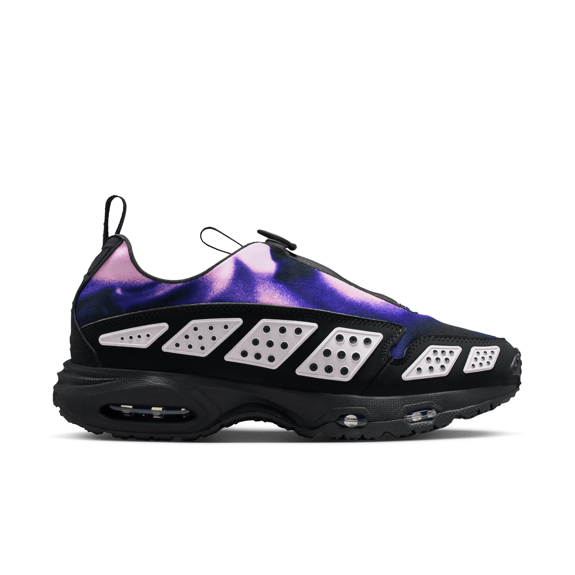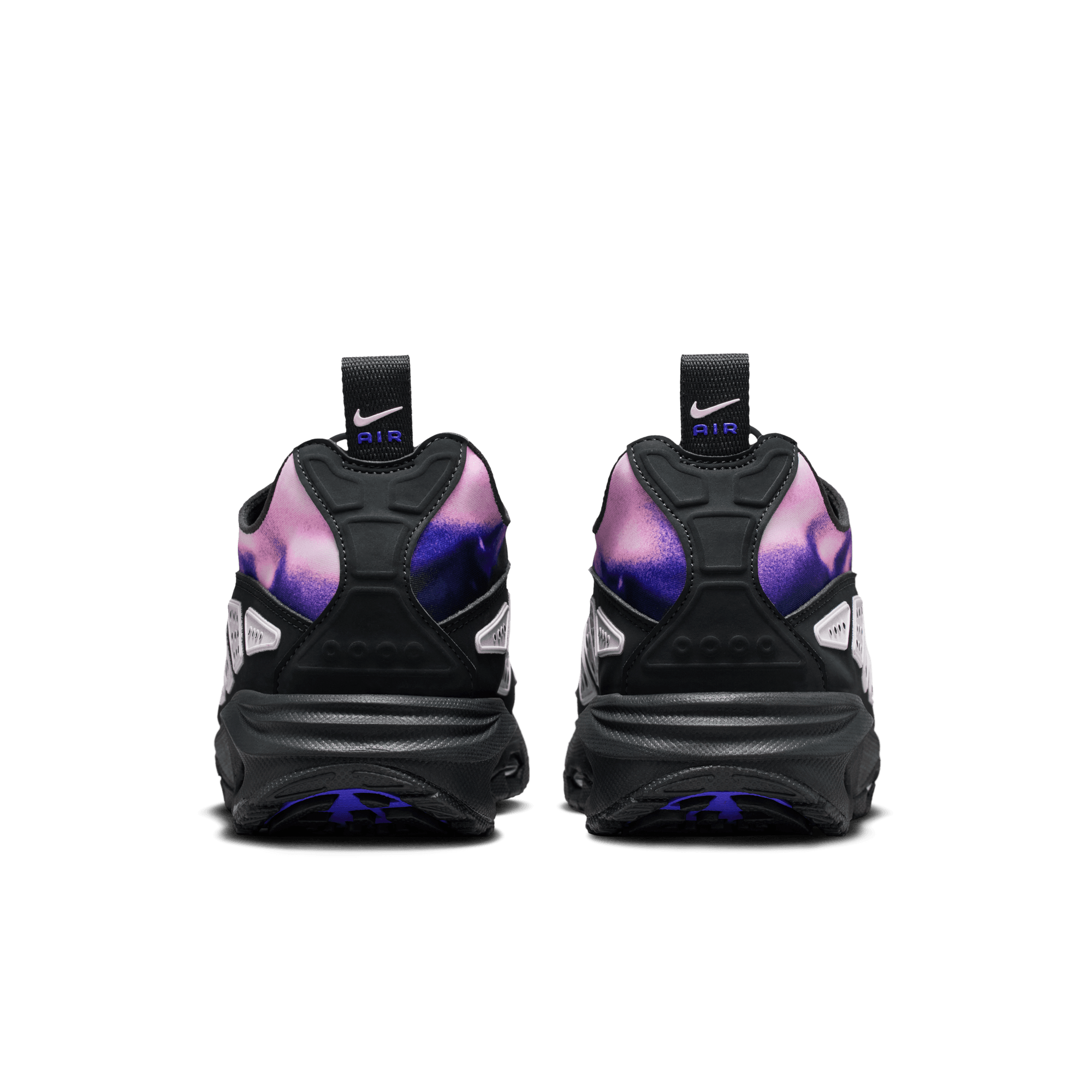 An innovative Air Max release from 1999 deemed ahead of its time has finally come of age with the reintroduction of the WMNS Air Max SNDR "Off Noir/Pink Foam". This new retro release recreates the original construction of a gradient purple to pink neoprene upper overlaid with a black nubuck mudguard that is covered in the model's signature silver reflective panels. A zippered shroud conceals the lace bed and the 6453 branding on the throat, a nod to the last four digits of Nike's office phone number. Small, low key Nike branding hits the tongue, toe, upper side and heel tab. It sits on a black phylon midsole with exposed Air units in the forefoot and heel, and finished off with a black rubber outsole.