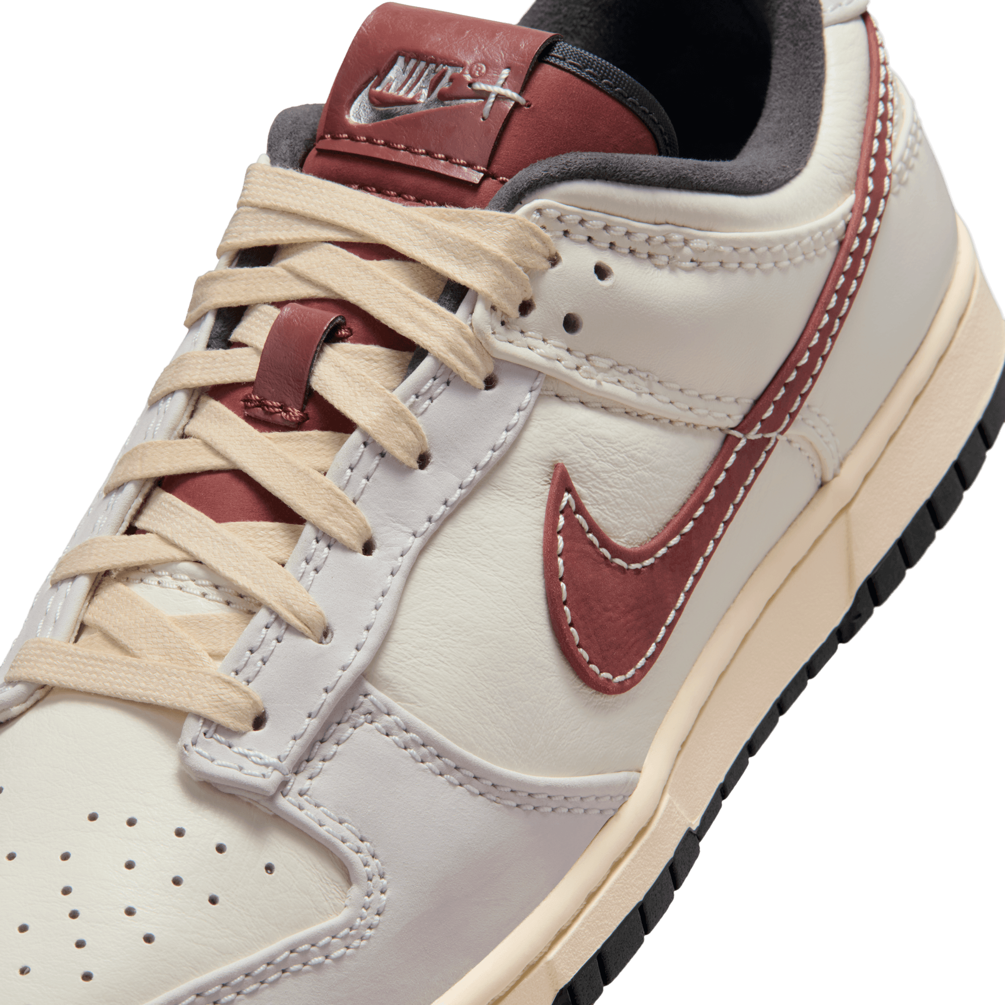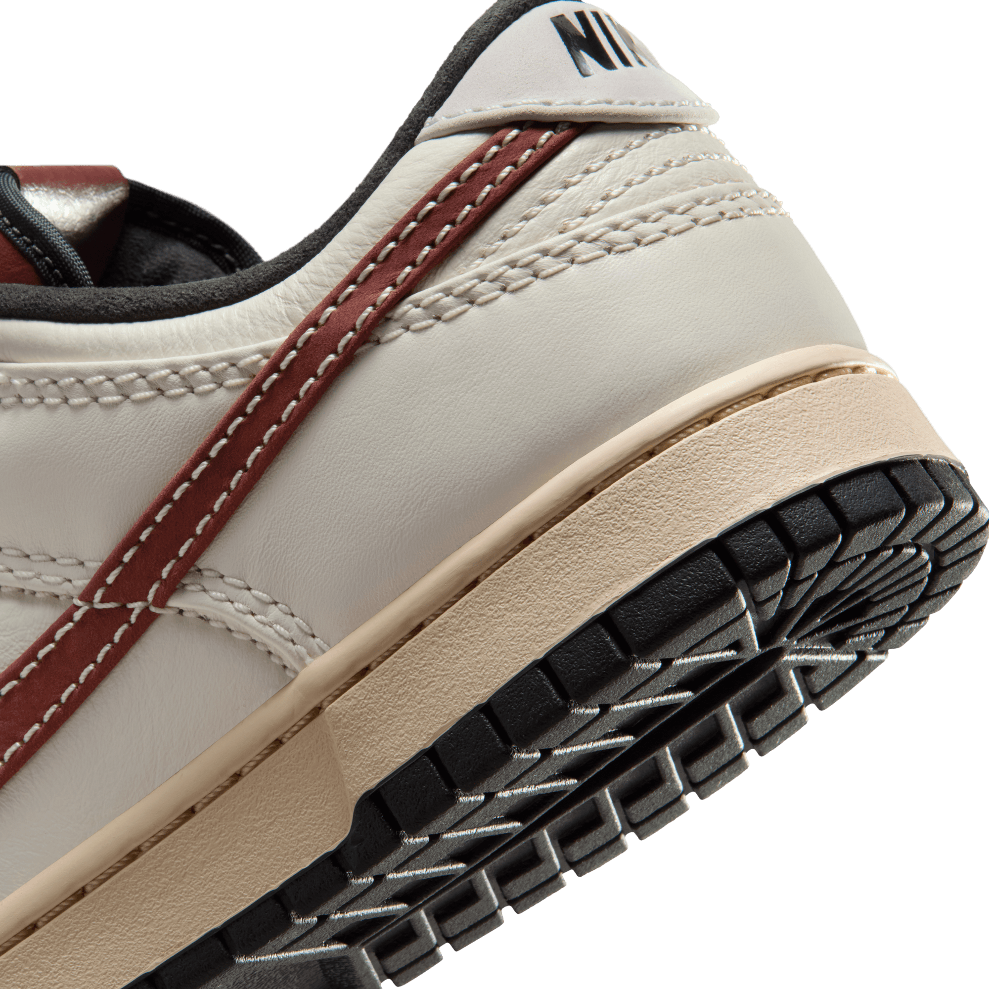 The Dunk Low goes for a luxe and earthy look on the Dunk Low "Dark Pony/Pearl White". This shoe dresses the classic silhouette in a premium luminescent leather upper overlaid with smooth grey leather panels on the toe, heel tab and eyestay, tonal heel wrap, and reddish brown leather swoosh and tongue. A debossed leather tongue tag replaces the normal woven one, and boasts a pearl stitch detail. Off-white laces, black lining, and pearlized heel branding fill in the rest of the details up top. An off white midsole and black rubber outsole complete the package.