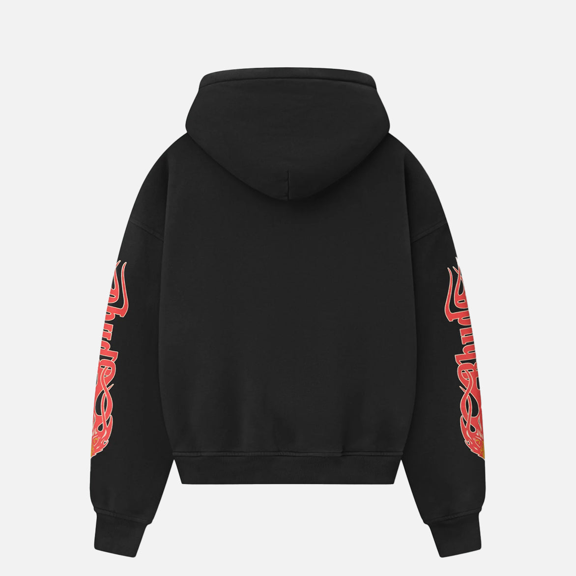 Long sleeve cotton heavyweight hoodie with Rhude "Mesa Stallion" graphic designs printed on the front and sleeves, with a clean back. Featuring a kangaroo front pocket and dropped shoulders. Each piece is unique and print distressing my vary per style.  100% cotton.