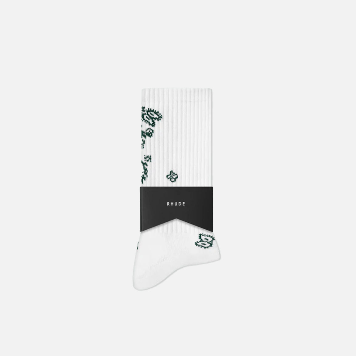 Ribbed poly sock features Rhude bandana all over motif pattern. Designed for athletics and leisure activities. 60% COTTON / 40% POLYESTER. One size fits all.