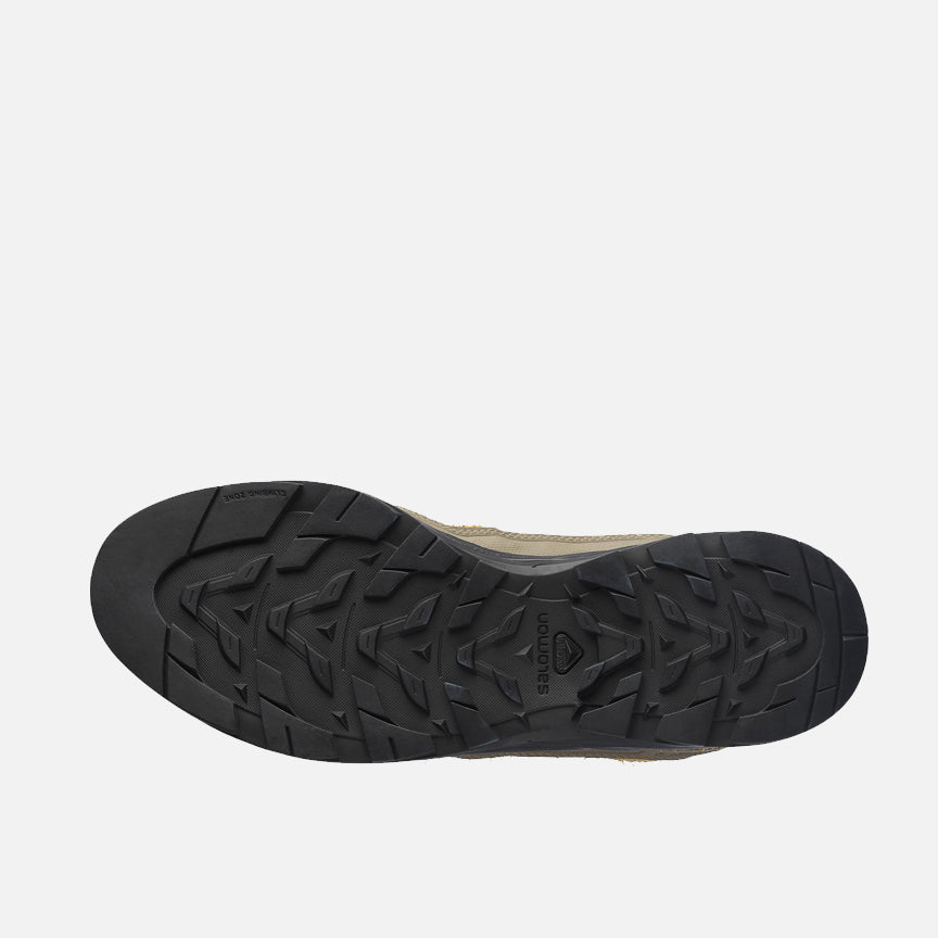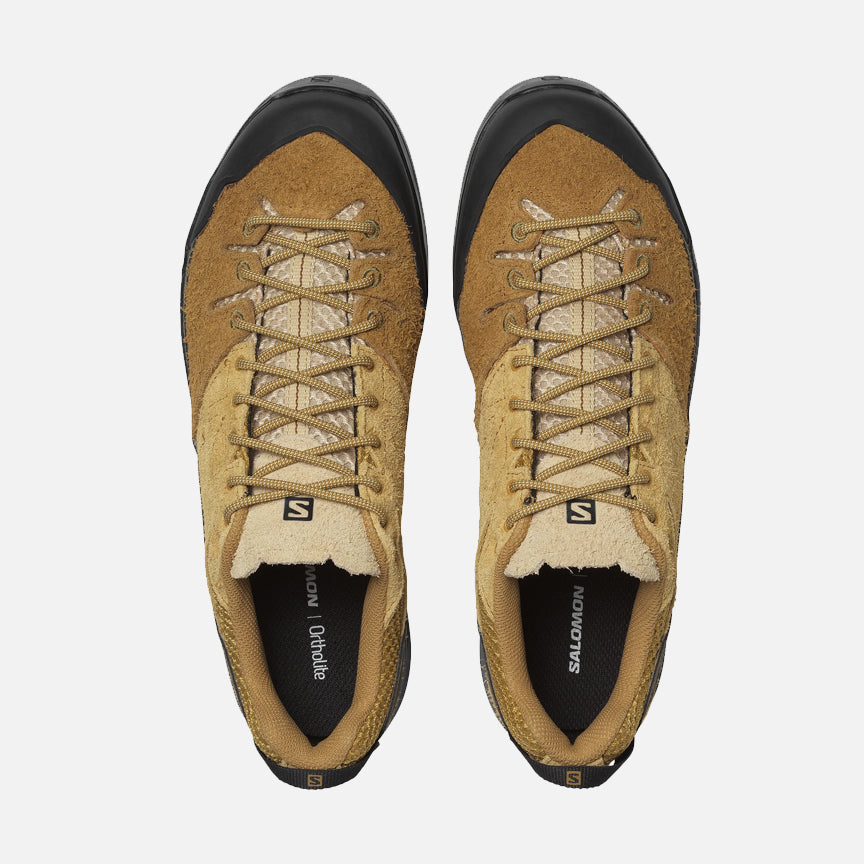 Salomon's X-ALP SUEDE is rooted in Salomon’s mountaineering history and inspired by technical approach footwear. This hybrid design blends protective detailing with functional cues to alpinism through a premium lens of rich materials and subtle, impactful details. It features a hairy suede and 3D open mesh upper atop full-length Edging Chassis, dual density EVA-cushioned midsole, and rubber lug Mud Contragrip outsole designed to tackle loose, soft, rugged or uneven surfaces . A rubberized toe box and arcing wraparound mudguard, branding on the side, tongue and insole, and speckled rope laces finish off the details.