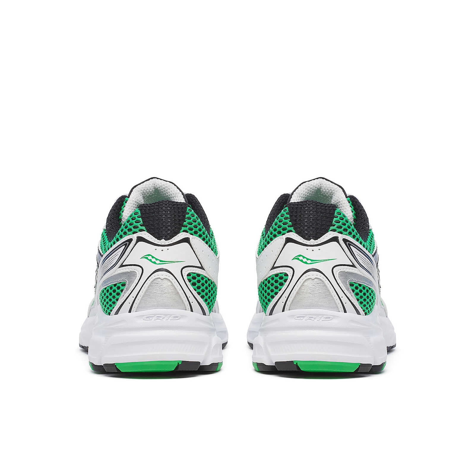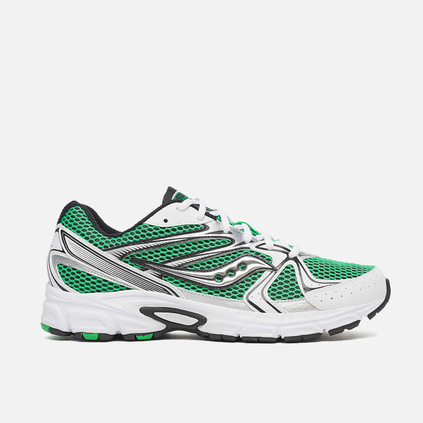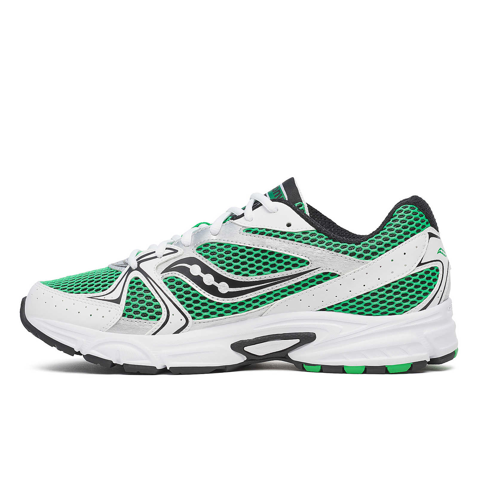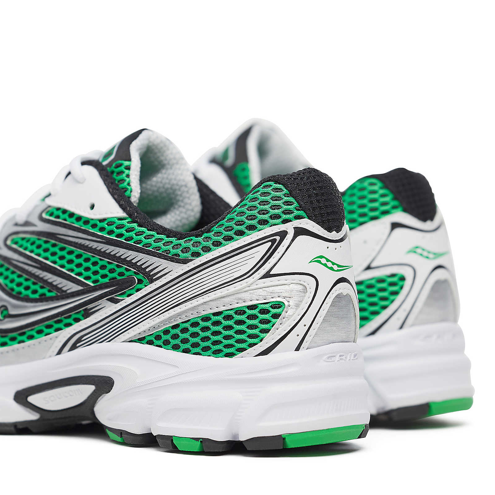 The Saucony Ride Millennium adopts the fervor and iconic details of some of the brand's classic Y2K-era models while incorporating today's most innovative tech. The sleek aesthetic features silver and white synthetic leather over green mesh on top of a white Grid cushioned midsole. Black branding, white laces and black lining, and metallic details finish off the look.