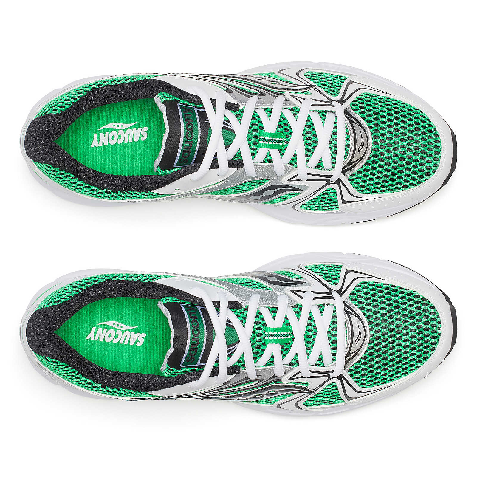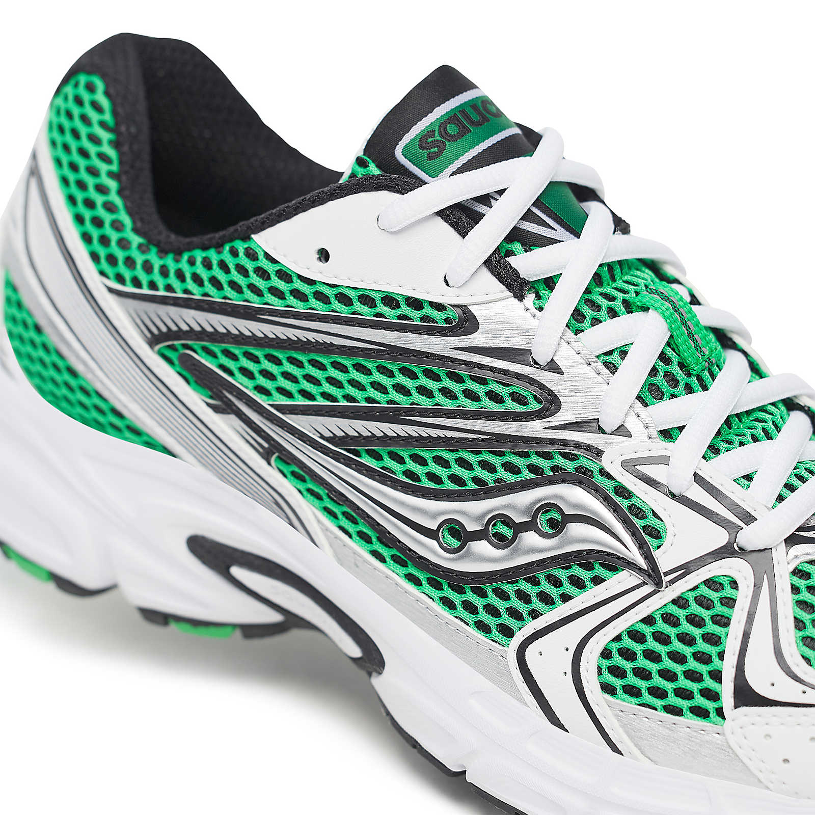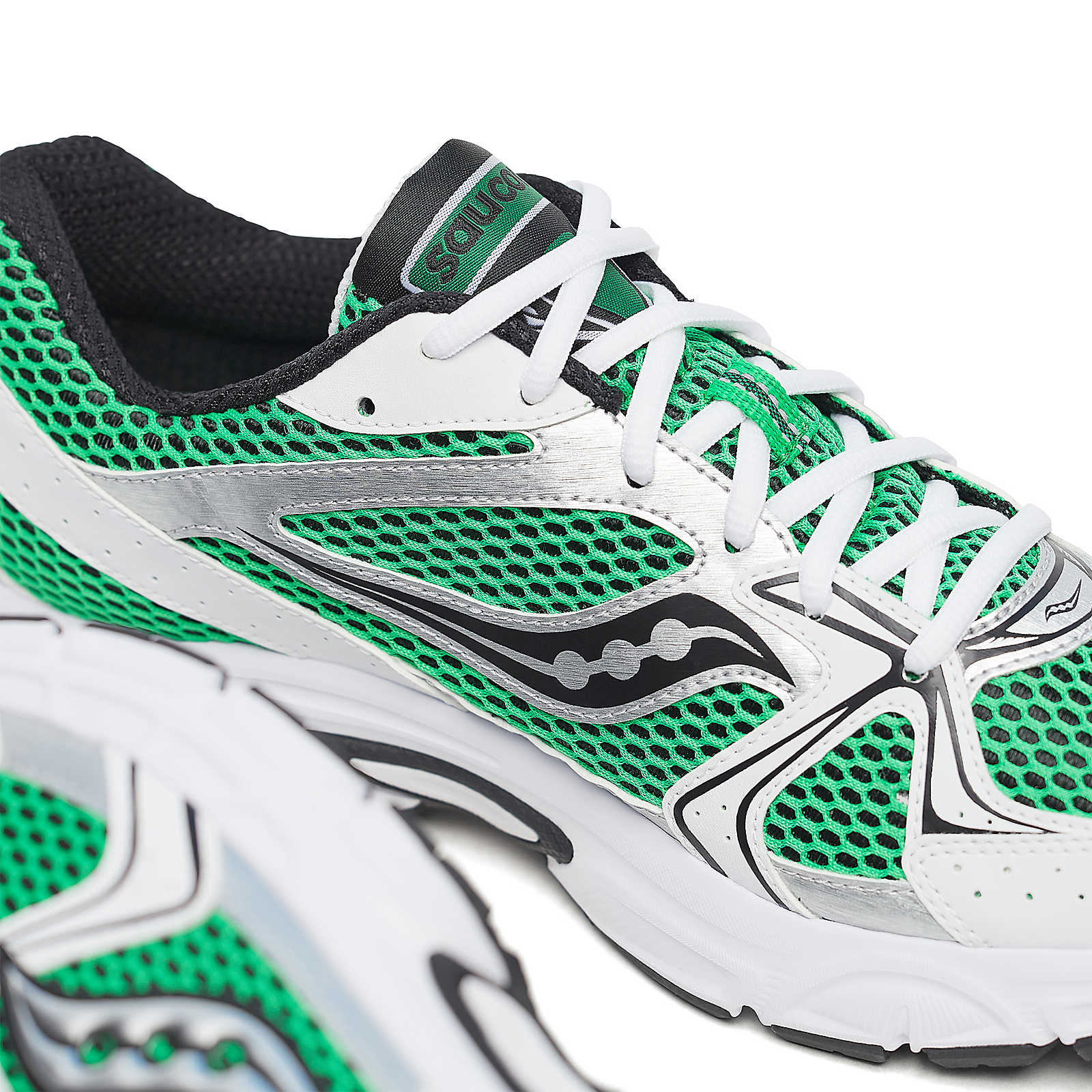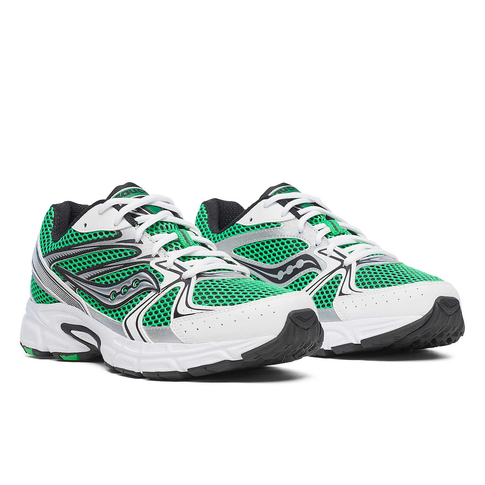 The Saucony Ride Millennium adopts the fervor and iconic details of some of the brand's classic Y2K-era models while incorporating today's most innovative tech. The sleek aesthetic features silver and white synthetic leather over green mesh on top of a white Grid cushioned midsole. Black branding, white laces and black lining, and metallic details finish off the look.