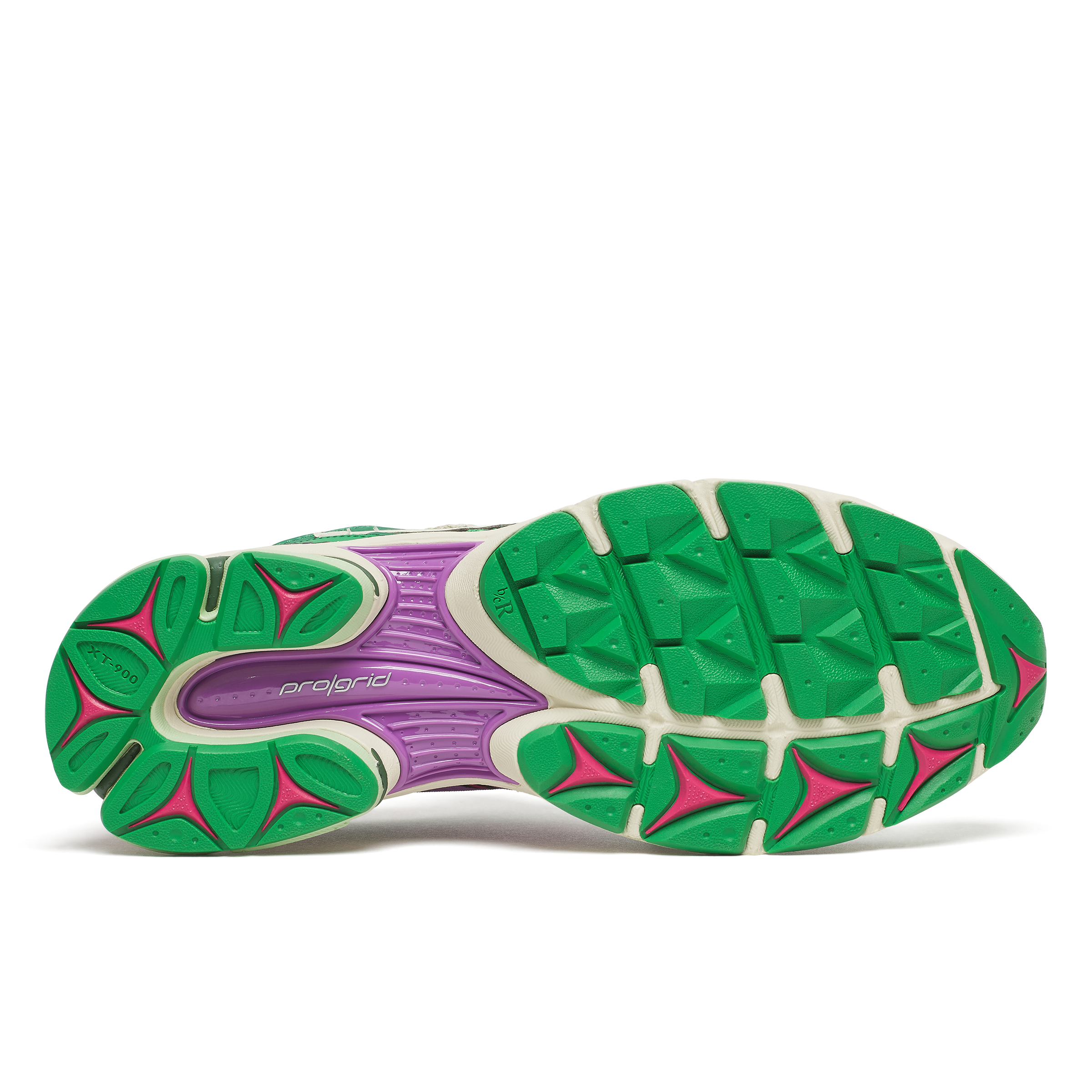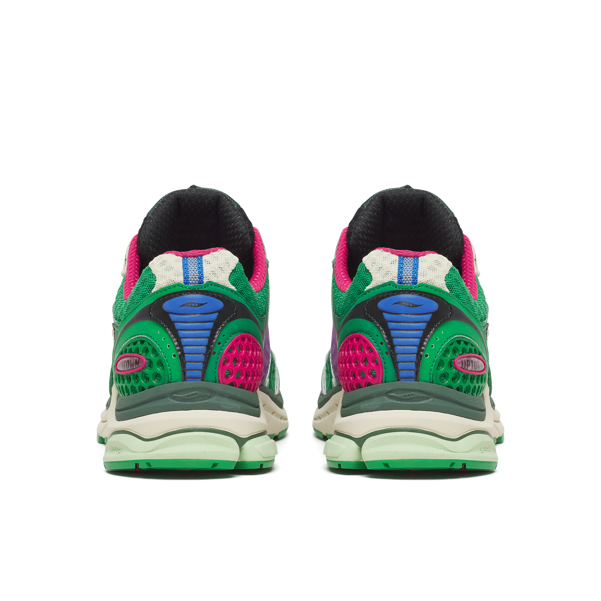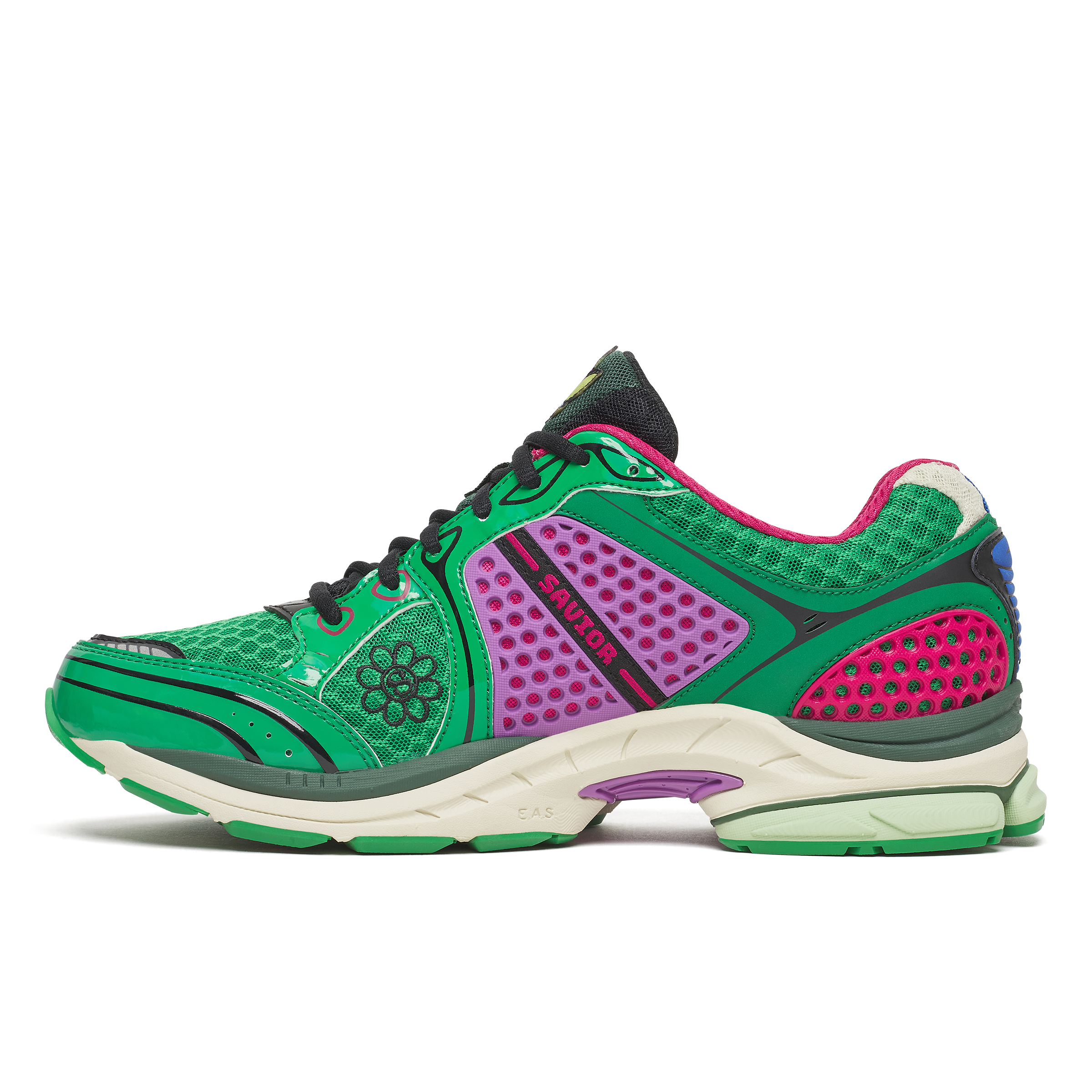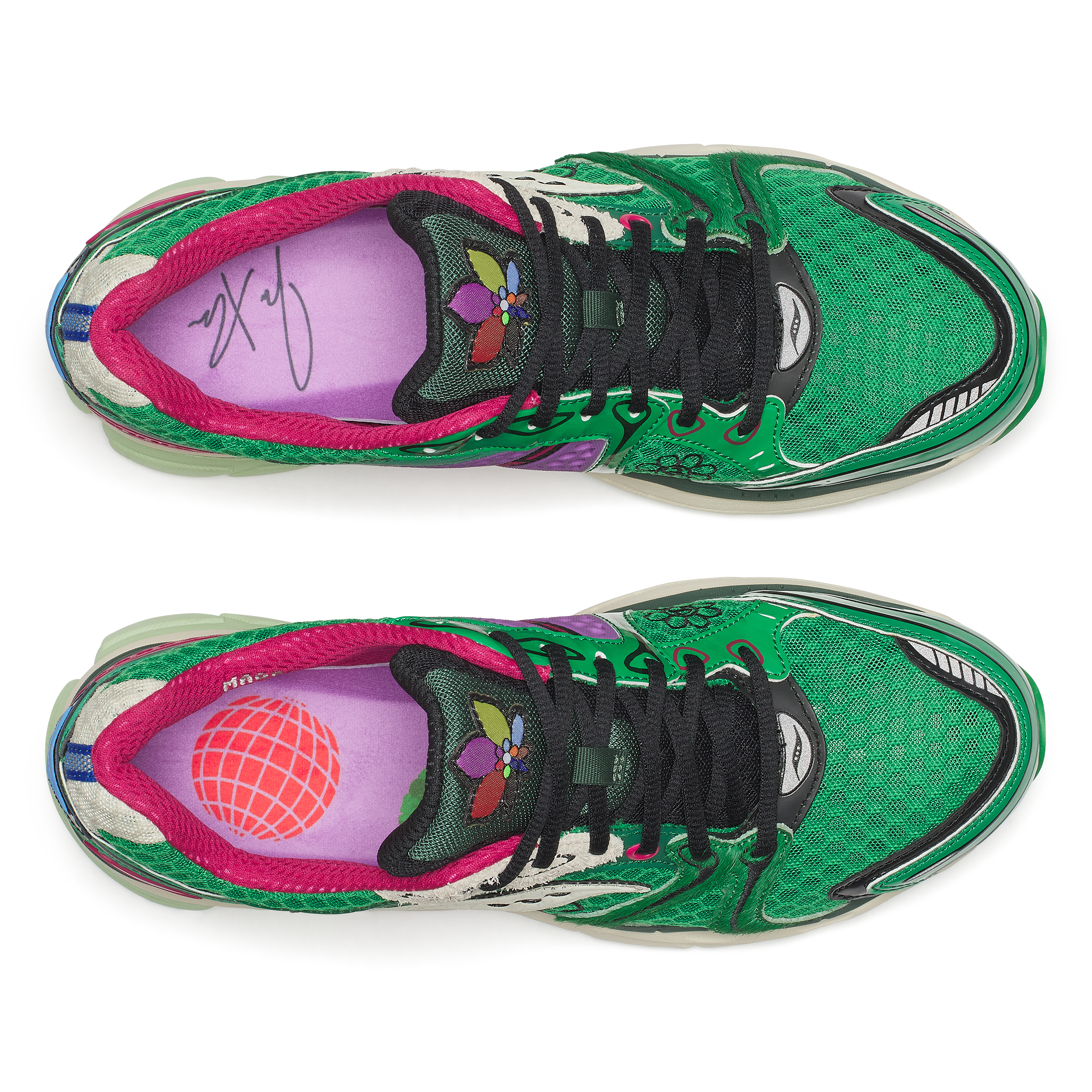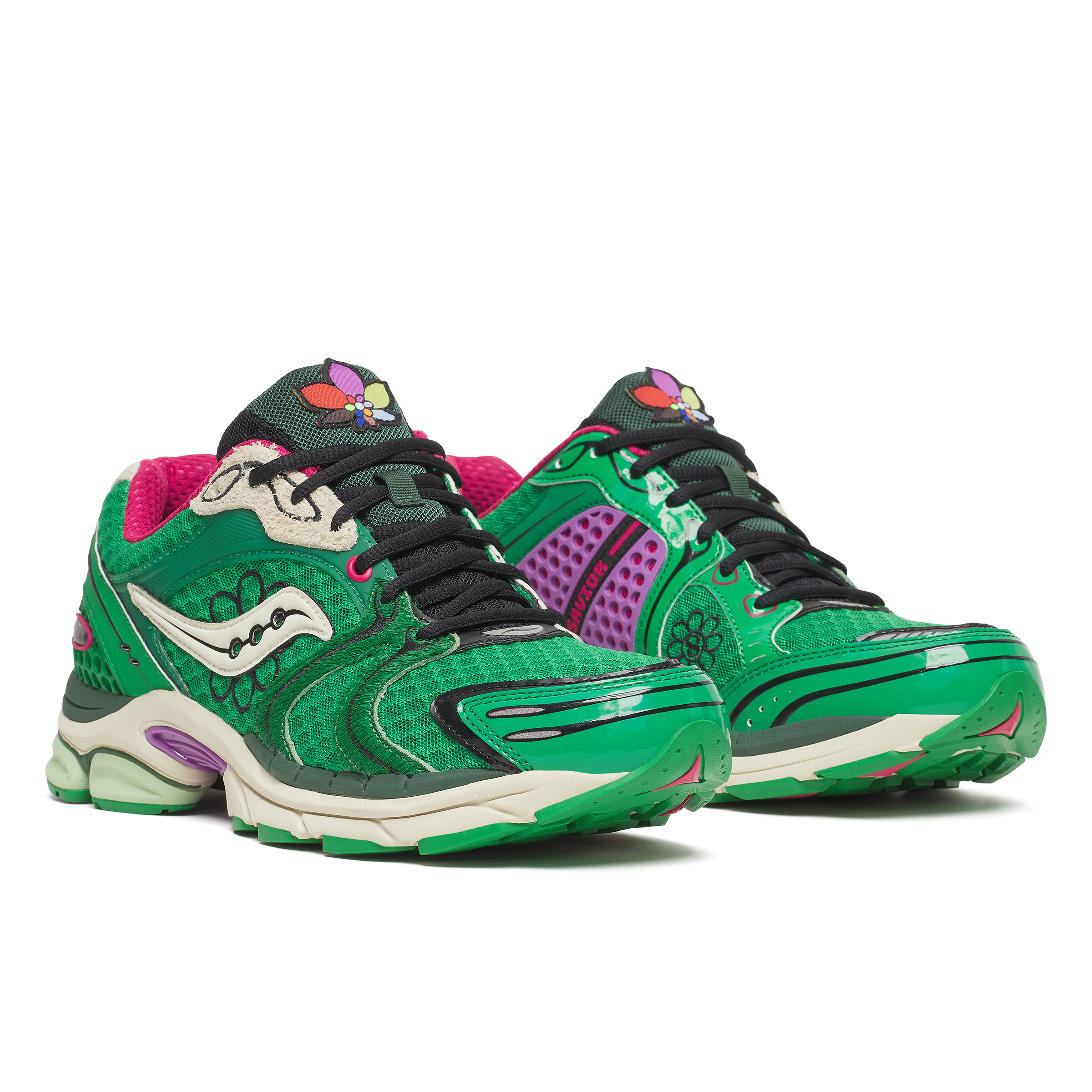 For their largest project together yet, Jae Tips and Saucony bring his story of growth in the Bronx to the Saucony ProGrid Triumph 4 with the “Flowers Grow Uptown” collection. Drawing inspiration from plant life as a metaphor for the resilience, beauty, and opportunity found in the Bronx, the collection celebrates Jae Tips’ neighborhood with deep personal meaning. It features this striking Sugar Maple colorway, named after foliage native to the Bronx, which covers the retro runner in a bright green, breathable open mesh upper overlaid with glossy leather panels on the toe and heel, hairy sued on the collar, perf TPU panels on the heel and horsehair detailing at the midfoot. Signature flower logos hit the tongue and sides, while SAVIOR and UPTOWN branding, graphic insoles and a ProGrid XT-900 sole unit complete the design.