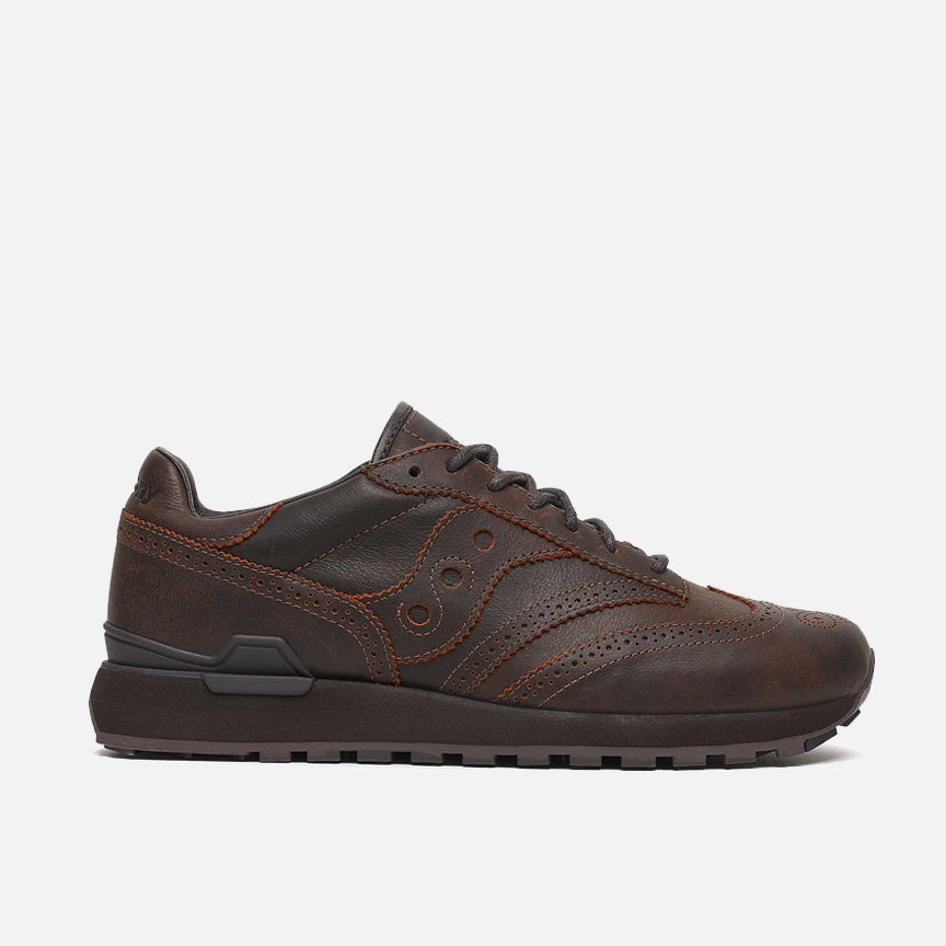 New York's Engineered Garments brings a suit-inspired reimagining to an iconic Saucony silhouette on the Engineered Garments x Saucony Shadow Original Wingtip. Heritage running meets modern tailoring as Daiki Suzuki's brand fuses a classic American business shoe onto the Shadow, building the upper from premium full-grain leather with brogue detailing on the toebox in classic wingtip fashion. Waxed cotton laces and contrast stitching, co-branded pigskin leather insoles and debossed Saucony branding on the leather tongue tag and heel tab complete the refined take on this classic runner.