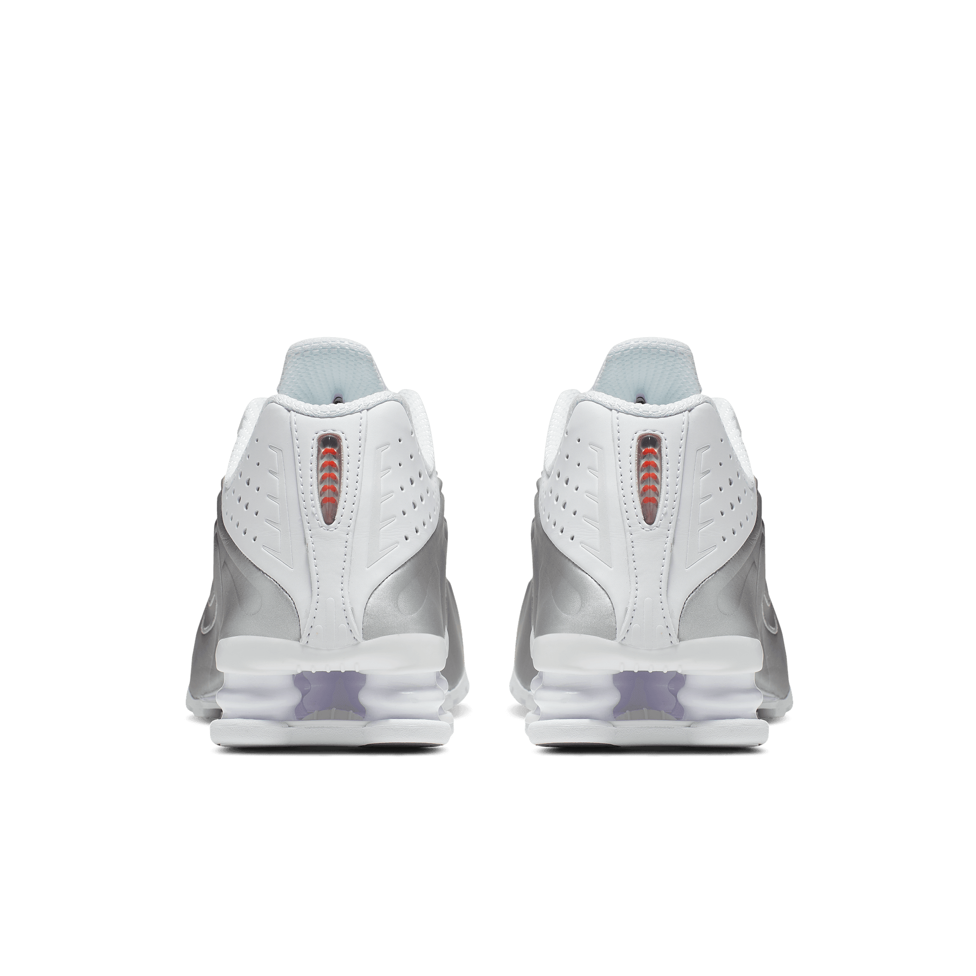 When Nike introduced the Shox R4 in 2000 it was hailed as a technological marvel and instantly became a cult classic, and now they're back again with the WMNS Shox R4 "White Metallic". First released in 2019, the "White Metallic" returns with a spacesuit-inspired white synthetic leather upper with a textured 3M reflective silver overlay on the sides. An embroidered silver swoosh, white laces and lining and four white Shox columns in the heel keep the look ultra sporty. Perf detailing on the leather toe cap and heel wrap, red Shox branding on the tongue and heel and a white rubber outsole complete the design.