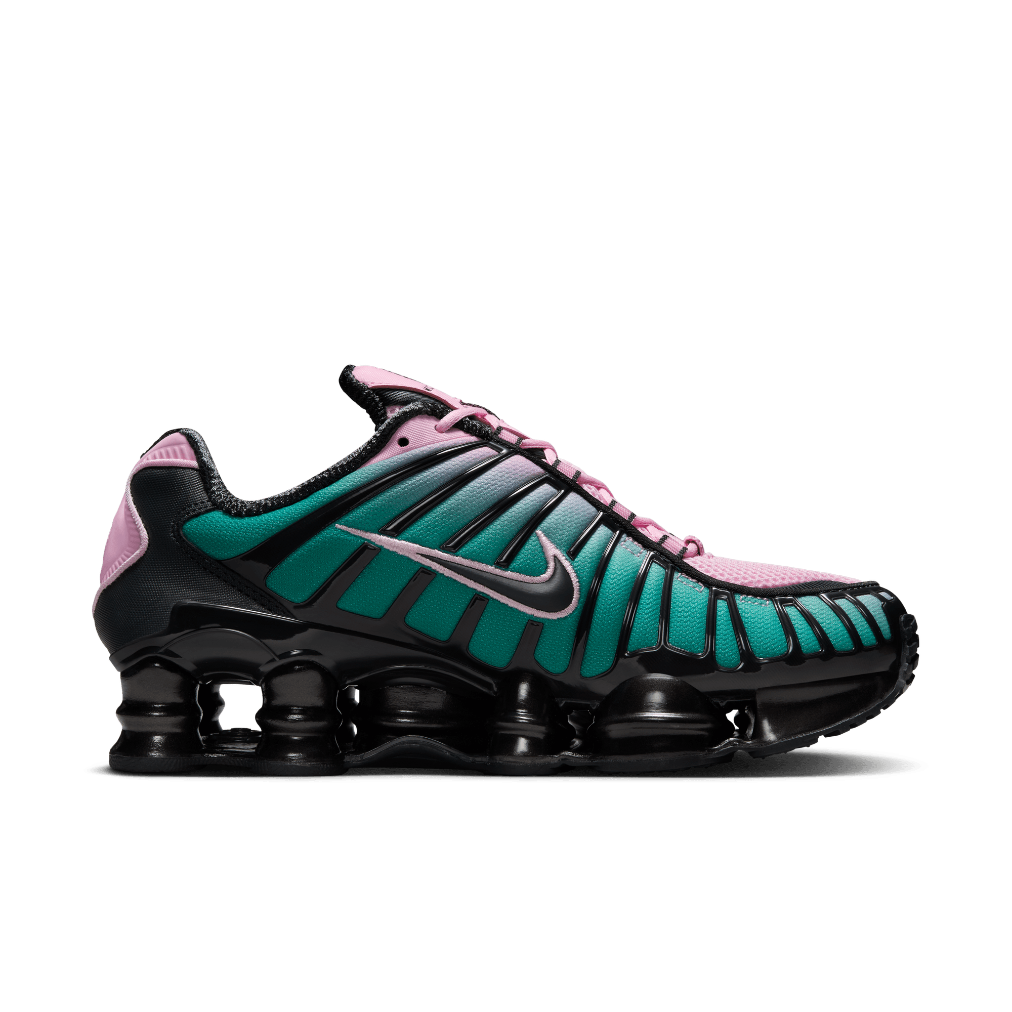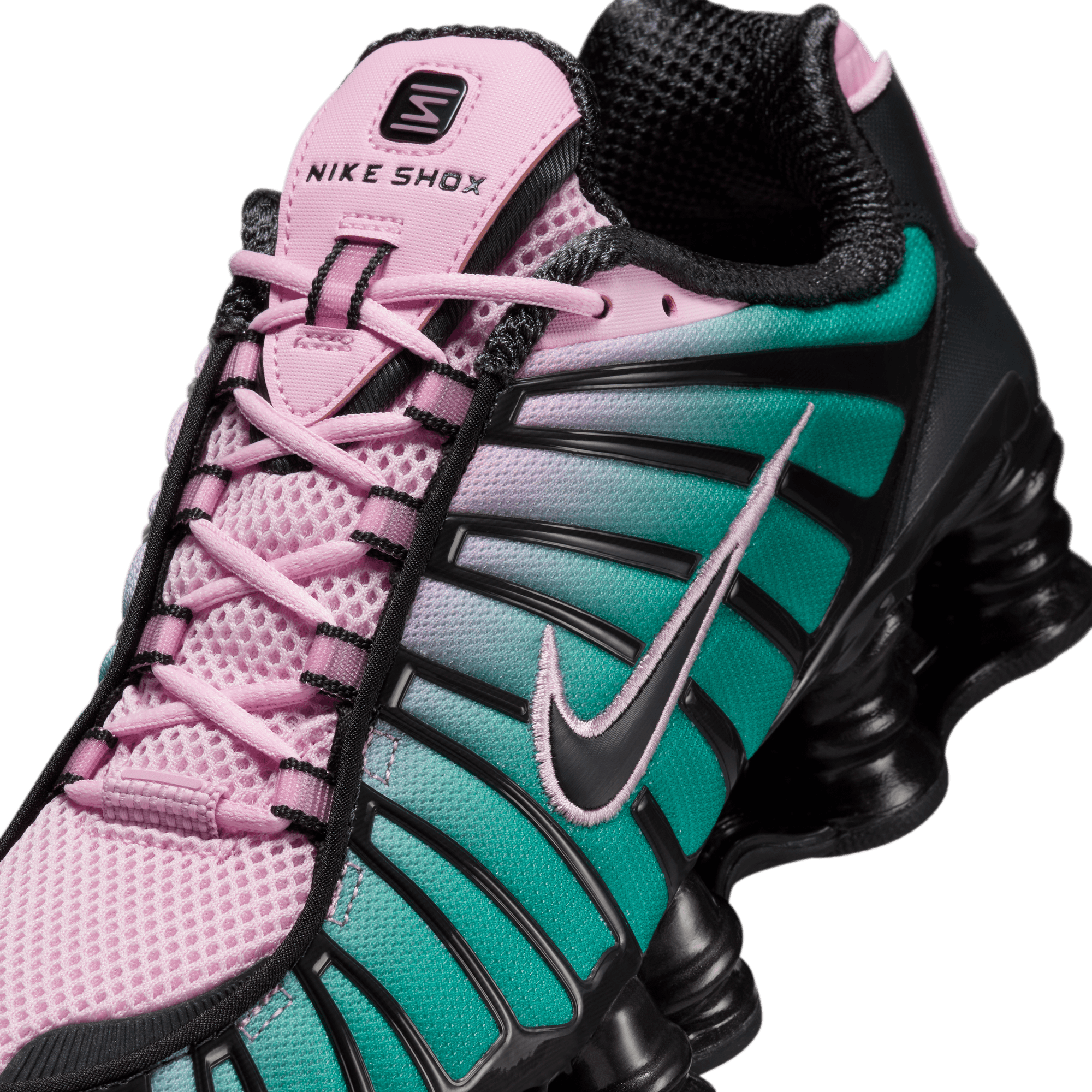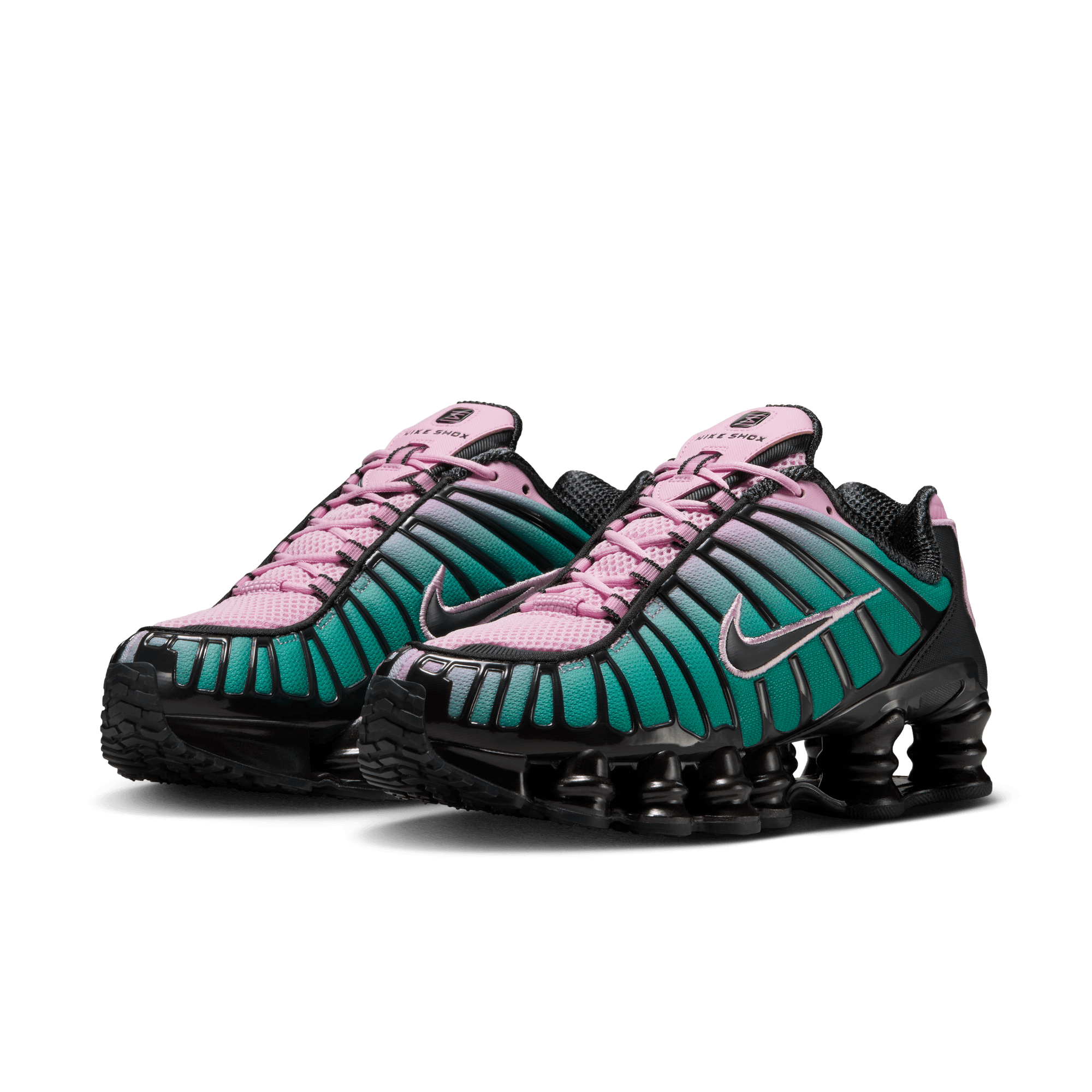 The shoe that took "Shox" cushioning to the extreme is back in a South Beach-esque gradient colorway on the Shox TL Fade "Watermelon". Best known for extending the spring-like cushioning columns the full length of the sole, this version of the Shox TL features a pink-to-teal mesh and synthetic upper surrounded by black plastic overlays, along with pink laces, black lining and the aforementioned black shox unit. Pink accents surrounding the black swoosh and the leather heel cap provide a bright infusion of color, while reflective accents throughout and the massive 12-column sole unit finishes off the build.