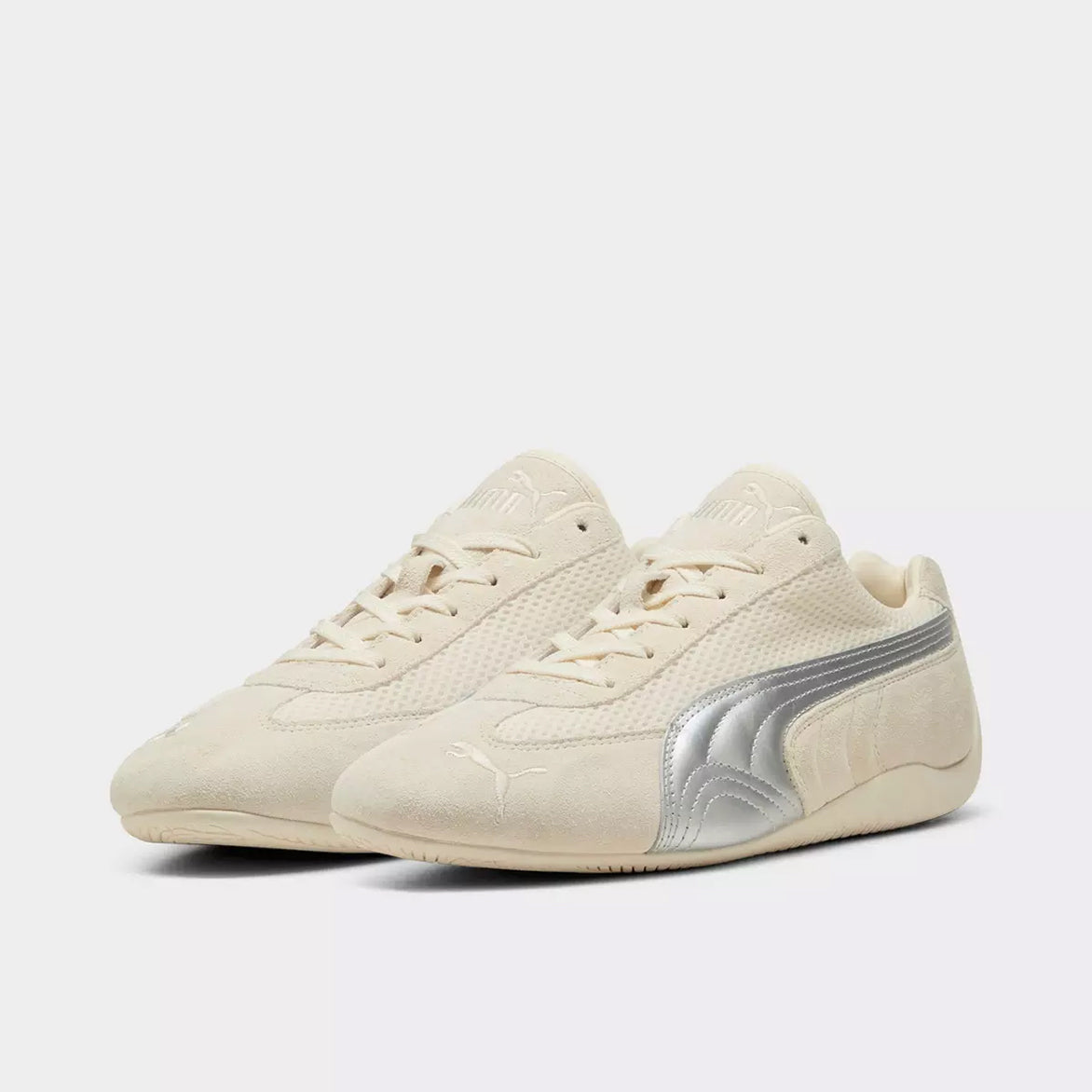 For over two decades, the PUMA Speedcat has been a streetwear and racing culture icon. Originally engineered as an ultra-slim driving shoe designed to cut milliseconds off lap times, it later made its mark on the streets of global fashion capitals. This Premium Women's version features an ivory suede and mesh upper with tonal branding, a metallic silver formstripe and an ivory rubber outsole to complete the design.
