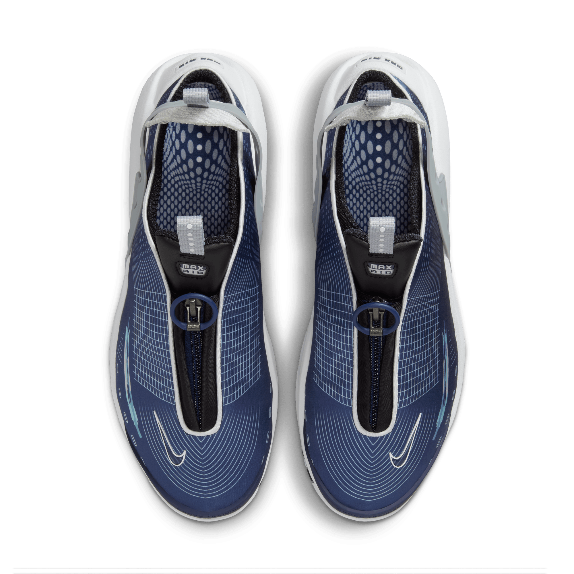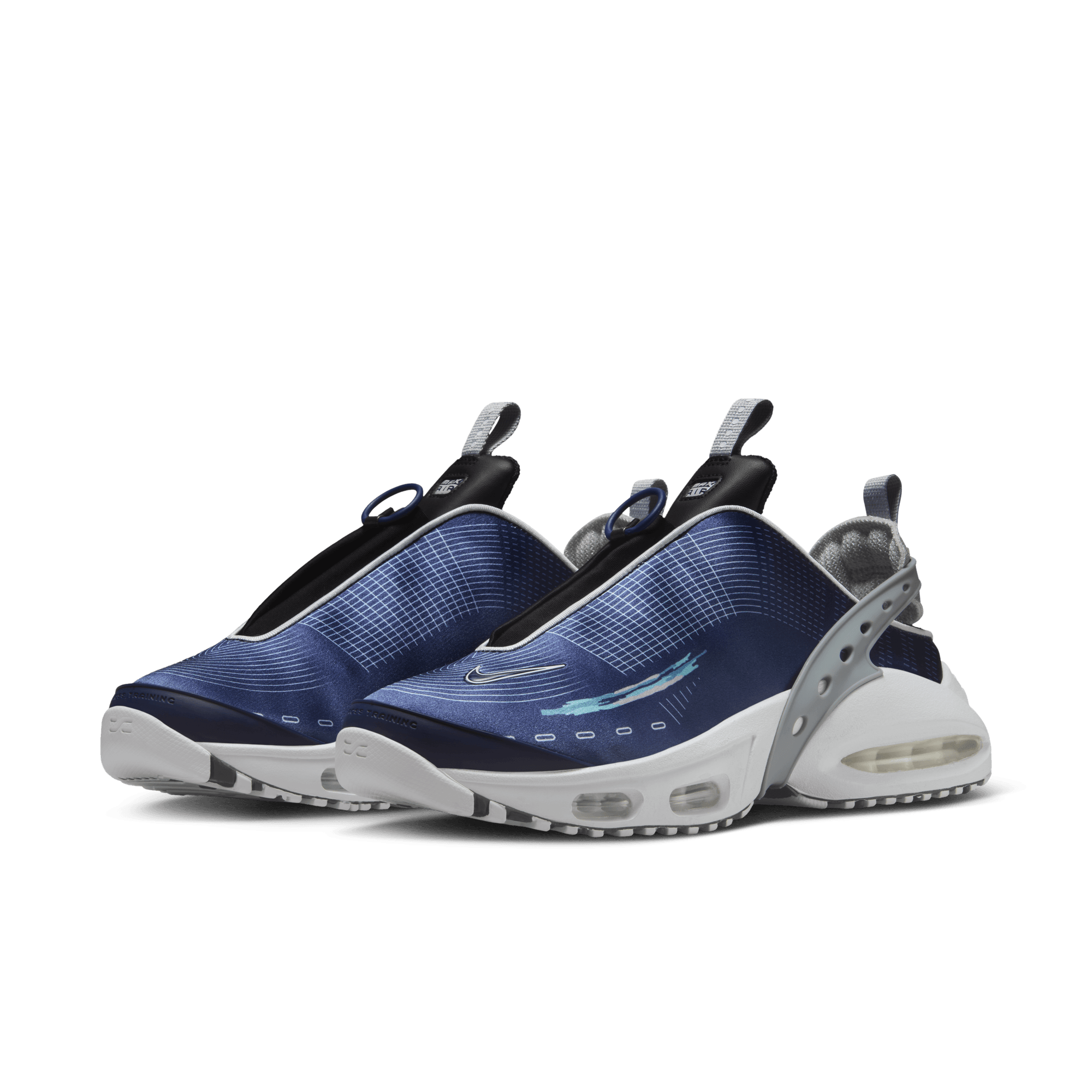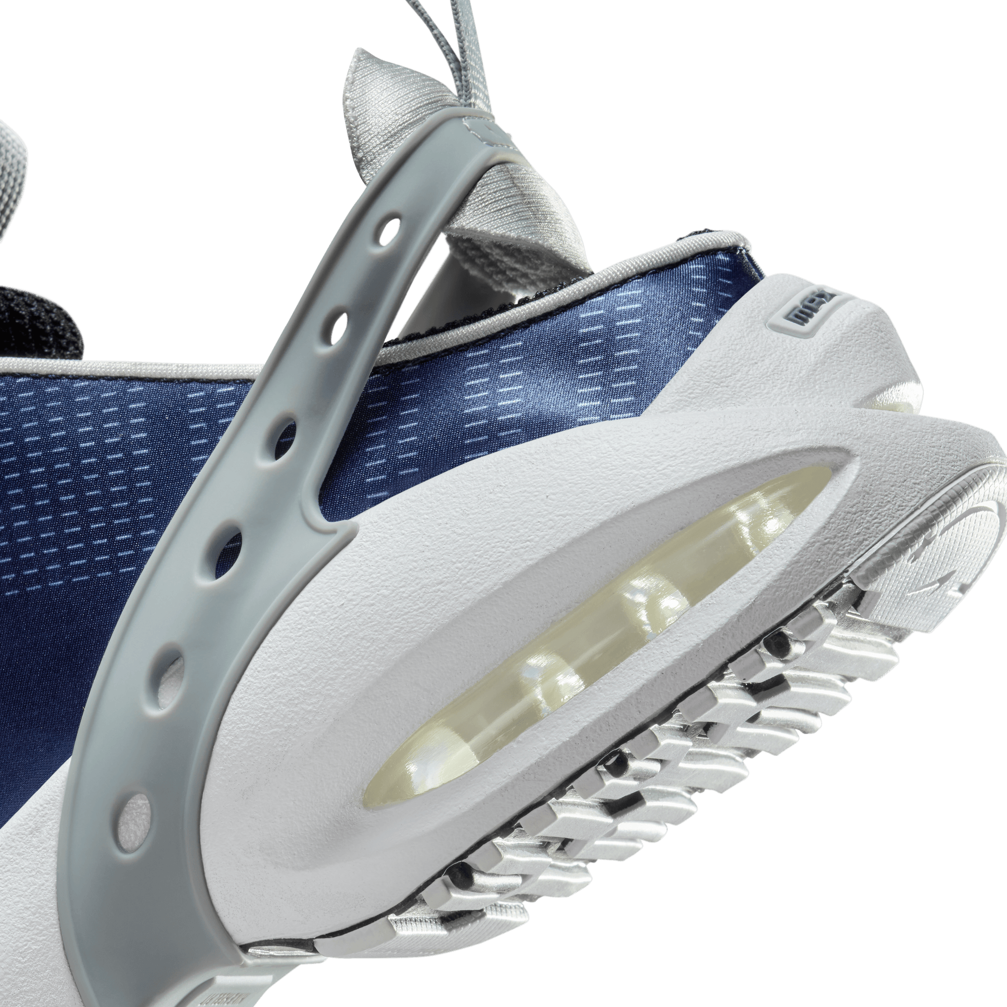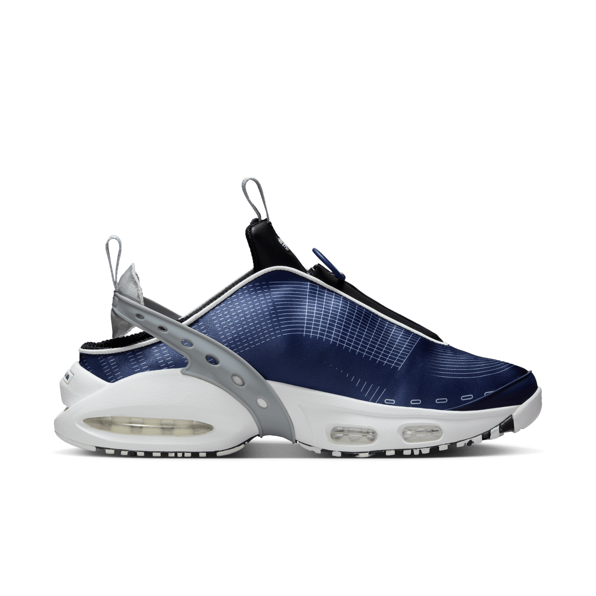 Nike's craziest silhouette is back from its early aughts heyday to bring some much needed joy to 2025 with the return of the WMNS Air Max Craze. Originally released in 2001 as part of Nike's Alpha Project division, the Craze remains as revolutionary now as it was back then. This Midnight Navy/Wolf Grey edition features a mule-like construction with a stretchy navy neoprene upper with a front zippered closure and a grey TPU slingback strap. Printed grid-like graphics, black branding, black pull tabs and a white midsole with clear Air bags in the forefoot and heel finish off the design.