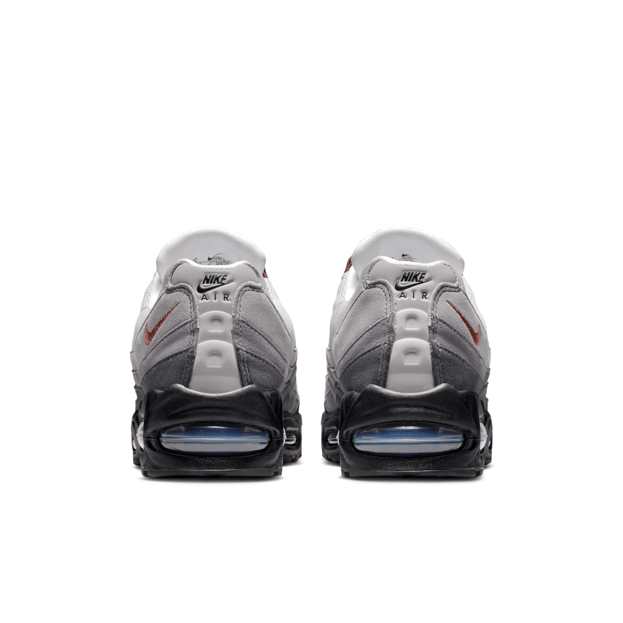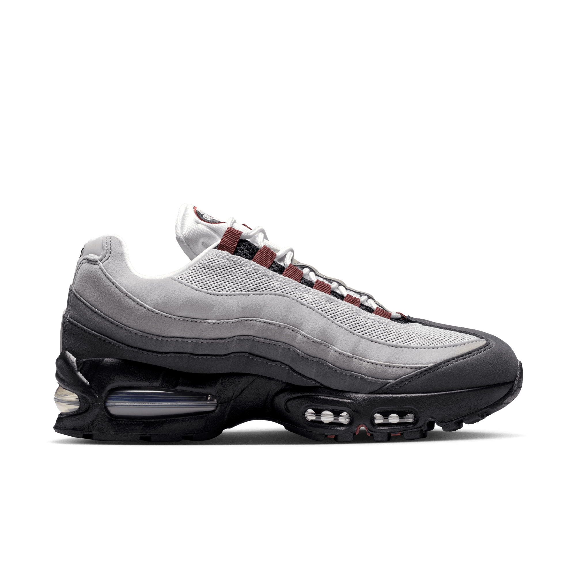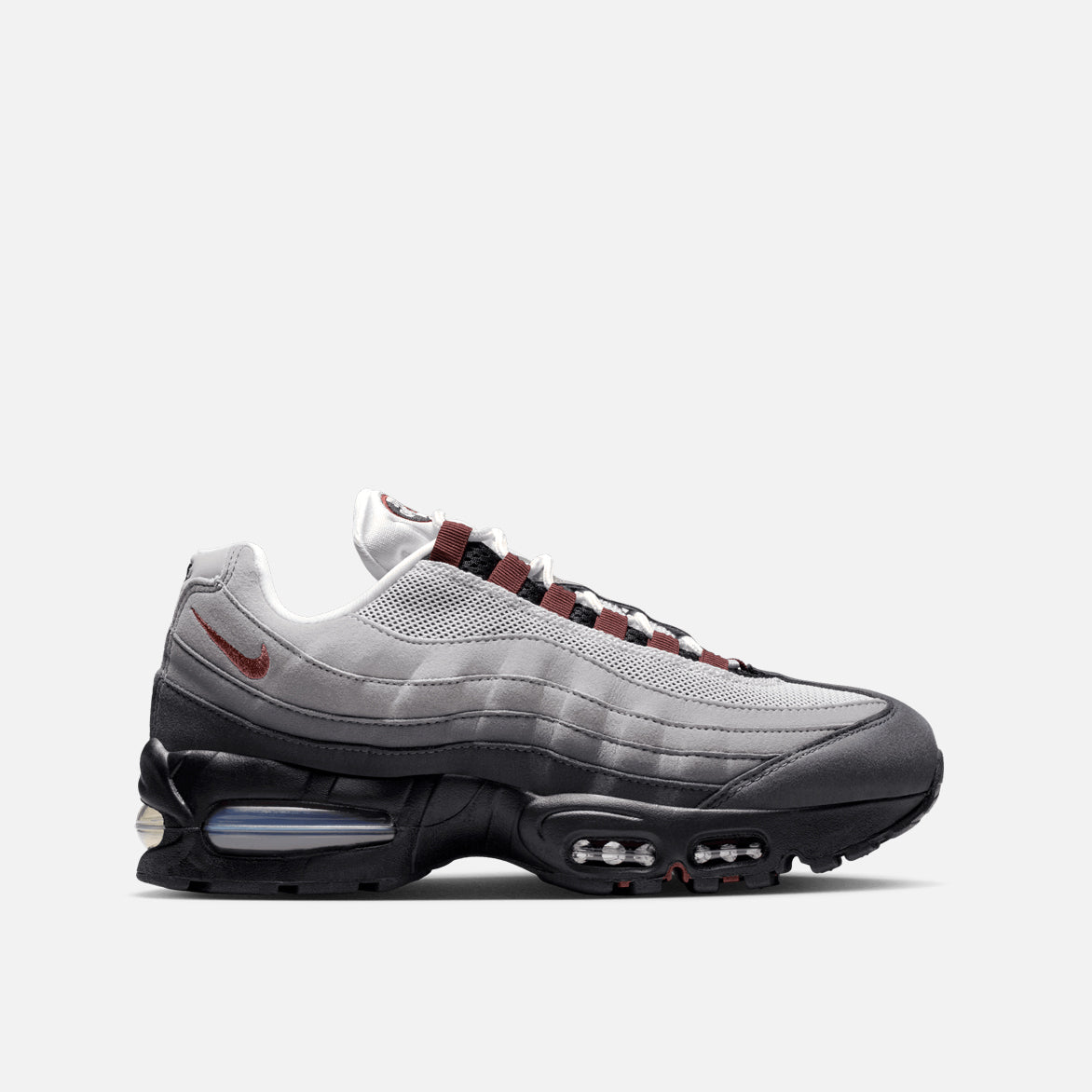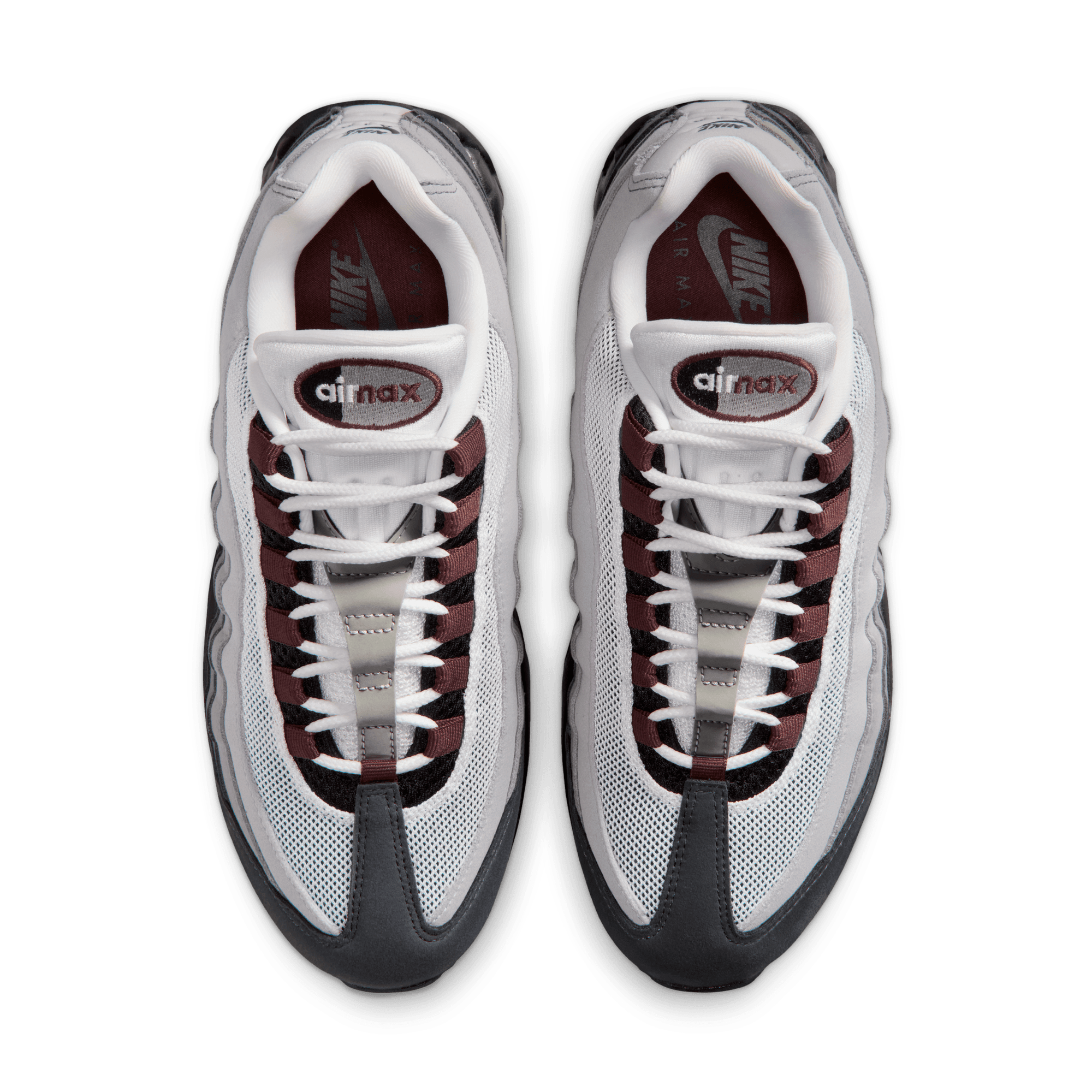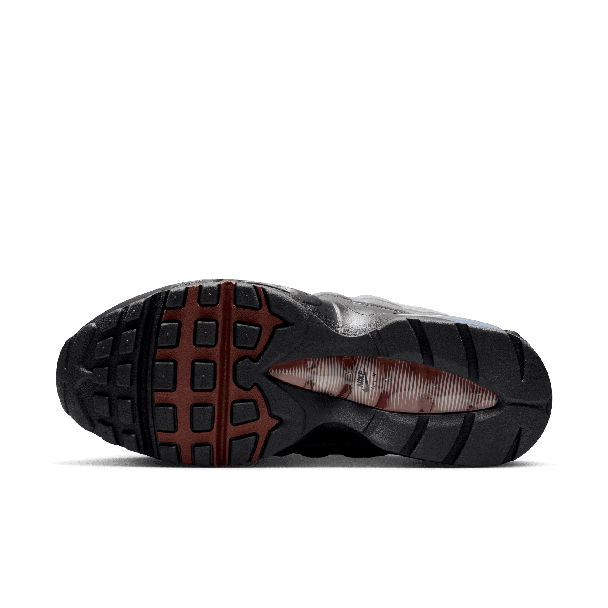 The Air Max 95 winds up its 30th anniversary celebration with this earthy women's version of their OG "Big Bubble" design: the Air Max 95 OG "Fauna Brown". The multi-layered upper moves from grey to navy suede on the wavy stripes below the white mesh saddle. Brown accents the lace loops, embroidered branding on the tongue, heel and insole. White laces and lining, blue 'Big Bubble' Max Air units located in the forefoot and heel of the chunky black midsole, and a brown and black rubber outsole complete the design.