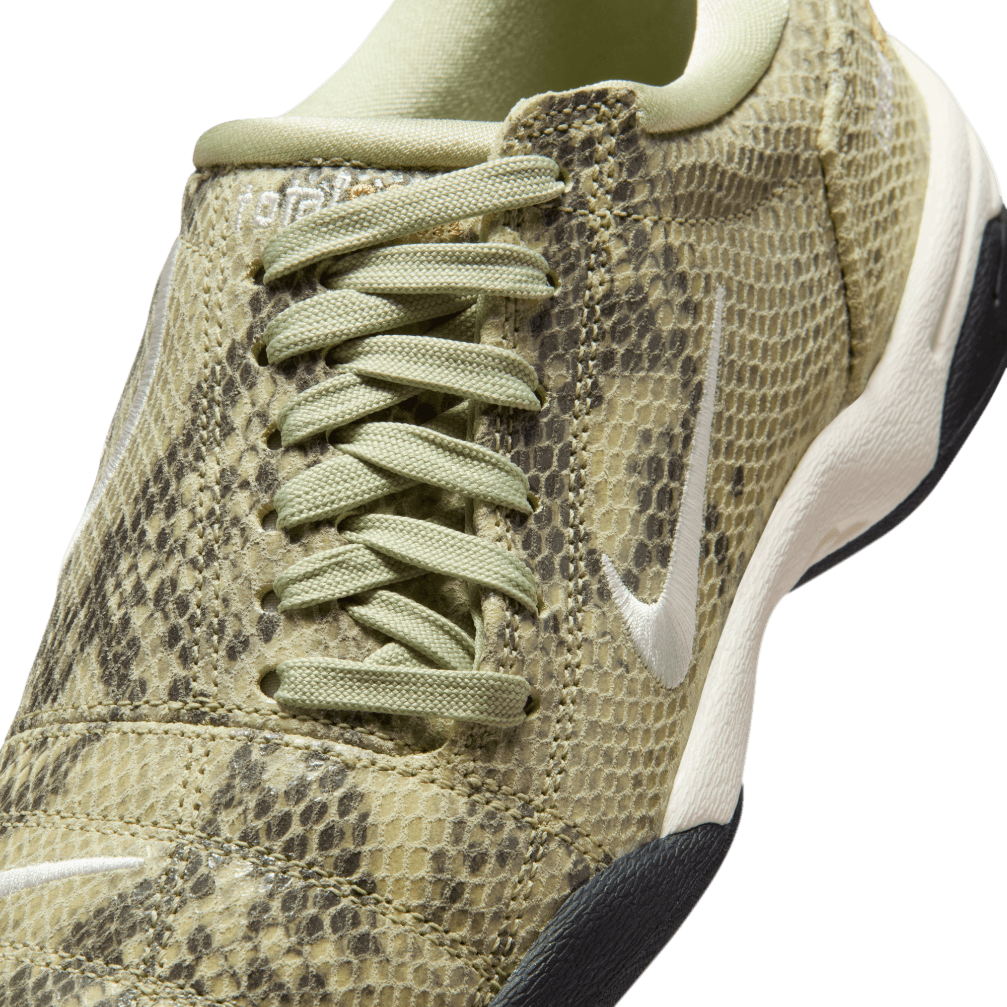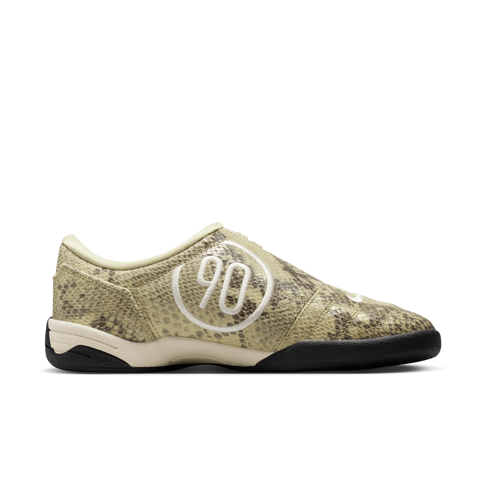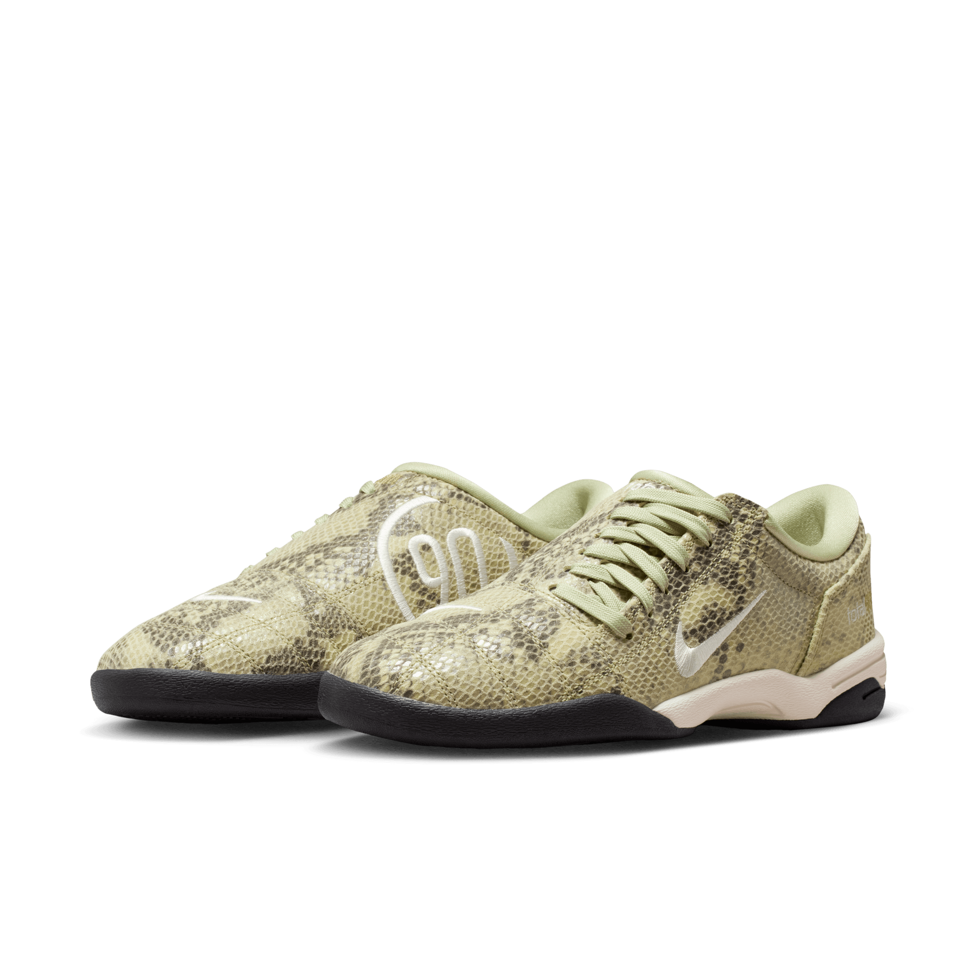 Nike remakes a Y2K soccer superstar into a lifestyle option with the WMNS Total 90 SE "Olive Aura/Pale Ivory". Born on the pitch in 2000, the Total 90 left a lasting legacy on the beautiful game. Now it's back and ready for the street with authentic soccer style, reloaded for today. This upgraded edition swaps out the cleats for a flat, black rubber sole and embossed faux-snakeskin on the olive green leather upper. The asymmetrical lacing of the original remains intact, as does the large 90 embroidery on the medial side. Swooshes on the lateral side and heel, Total 90 branding on the tongue and heel, tonal laces and a white foam midsole complete the design.