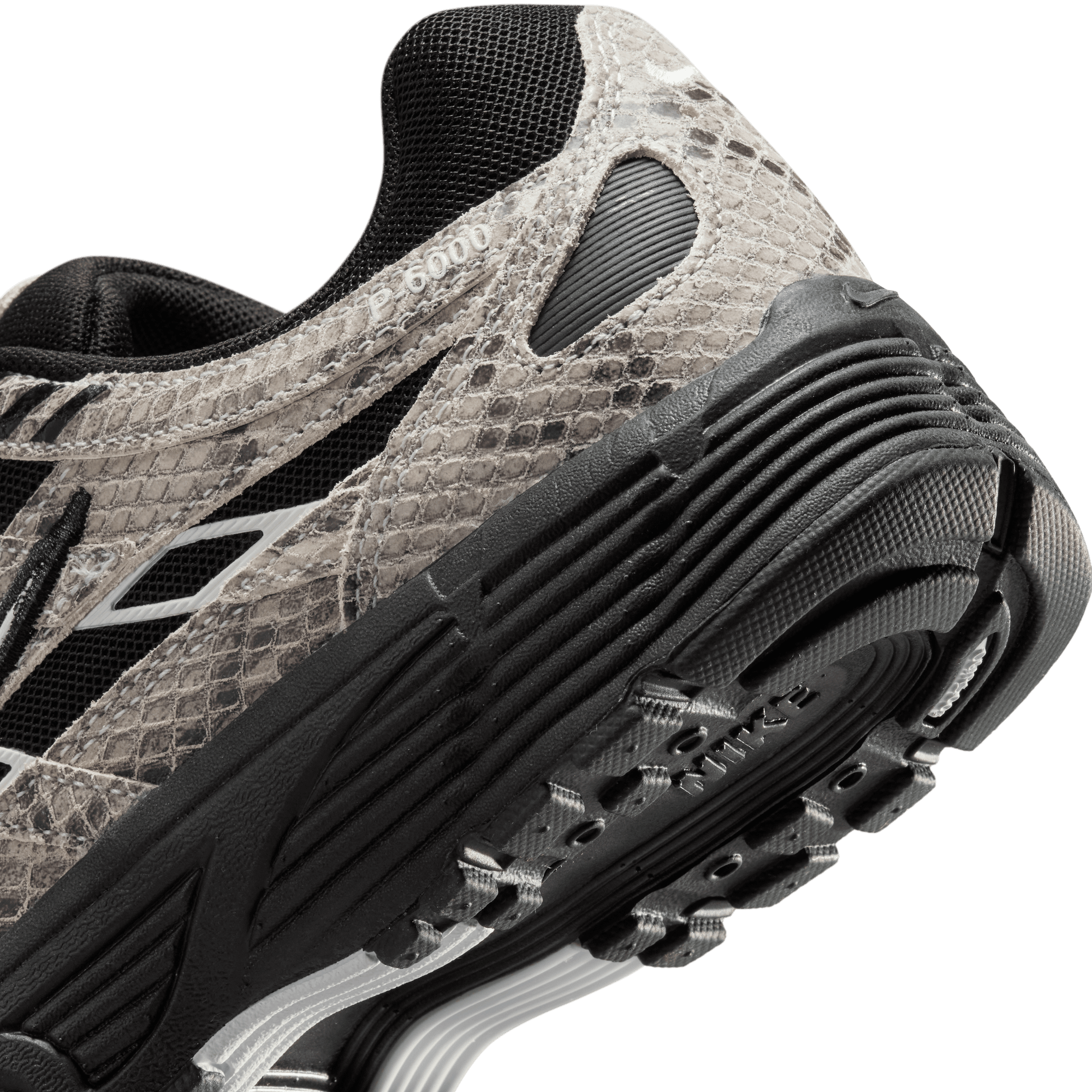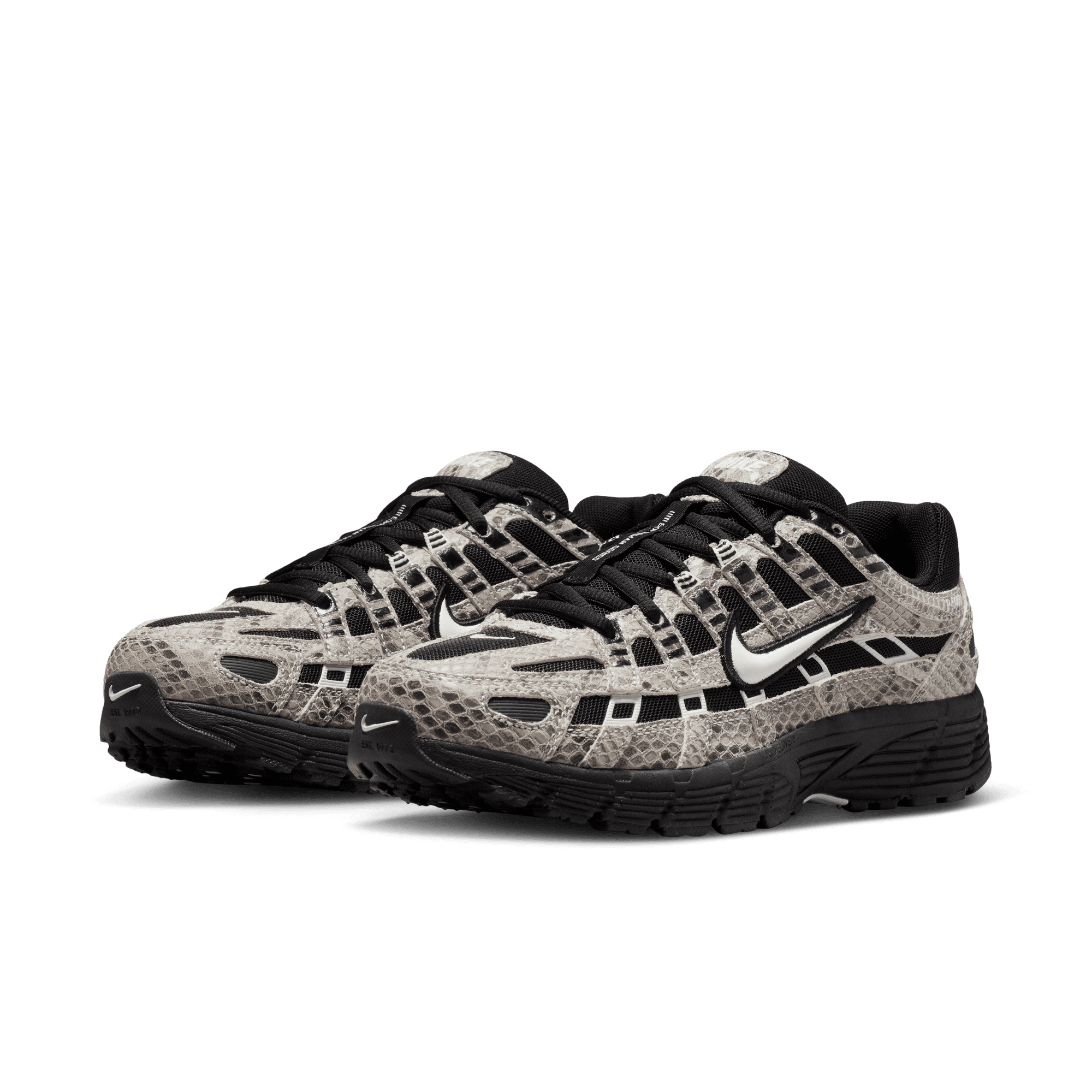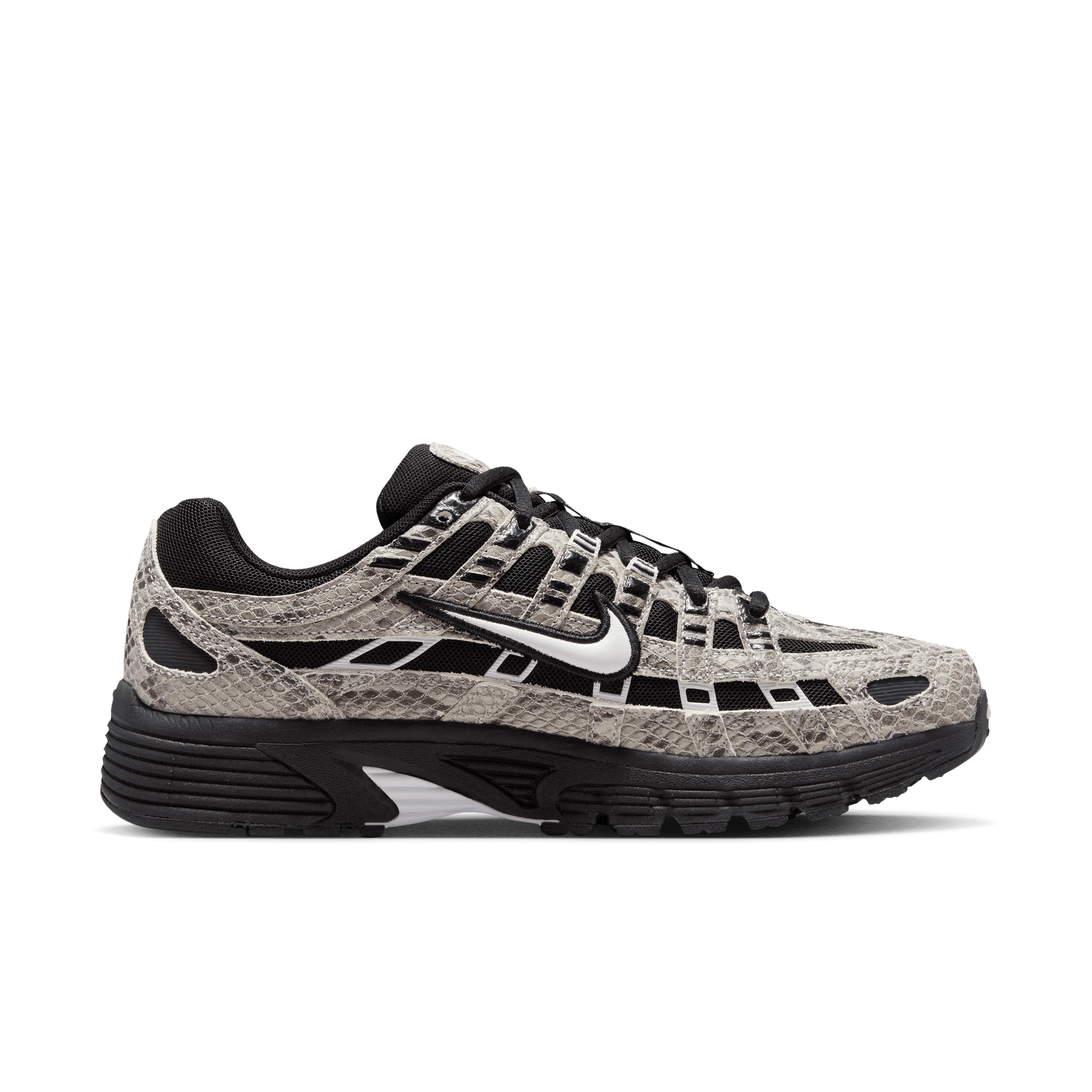Nike adds to its recent spate of early 2000s retro runners with a mashup of Pegasus styles that evokes the aesthetic of the time on the WMNS P-6000. This "Snakeskin" version of the shoe sports a black mesh upper overlaid with crisscrossing snakeskin embossed leather panels, black and white accents and a bold puffy white midfoot swoosh. A Nike-branded leather tongue tag and low key swoosh branding on heel finish off the details, while a Cushlon midsole and rubber waffle outsole complete the design.