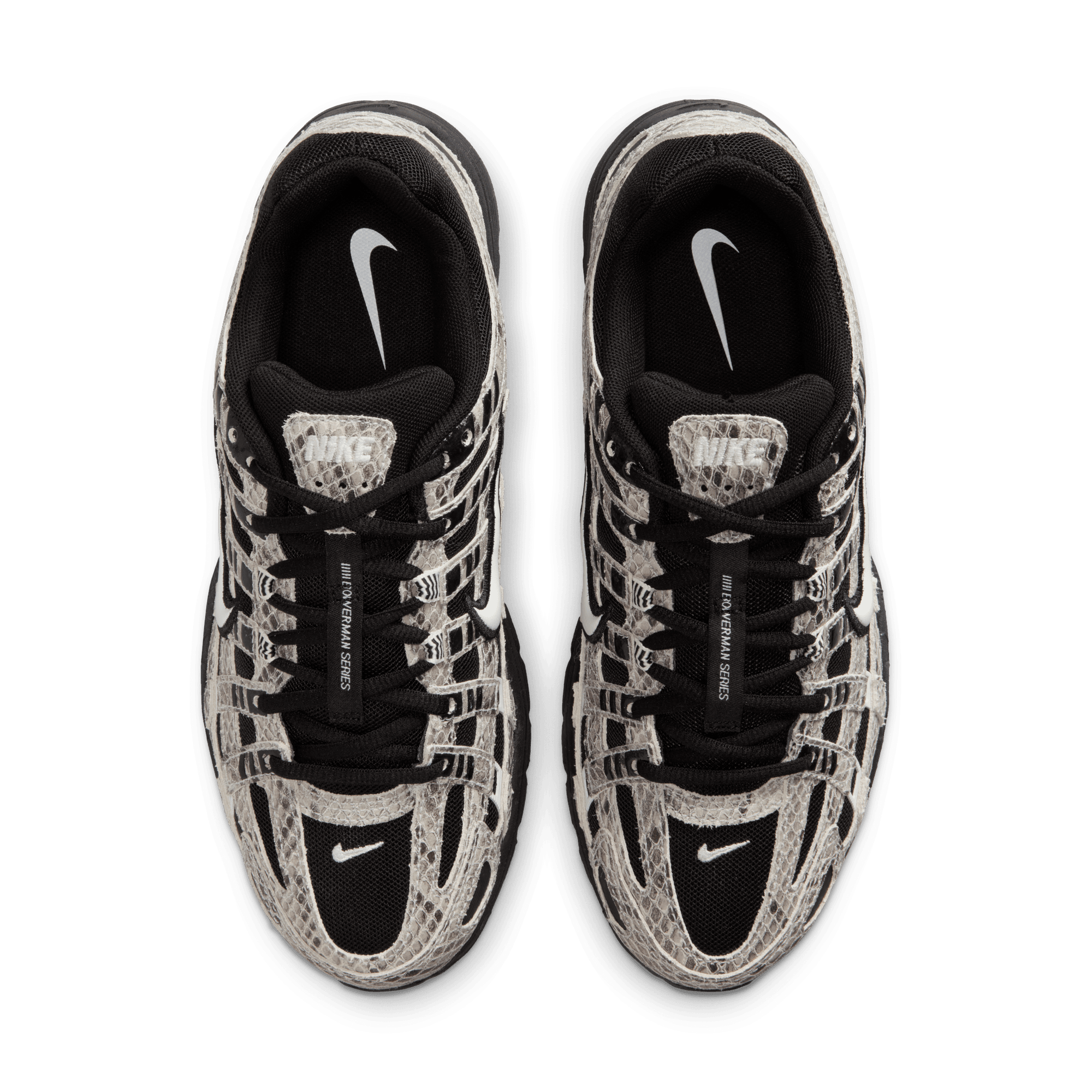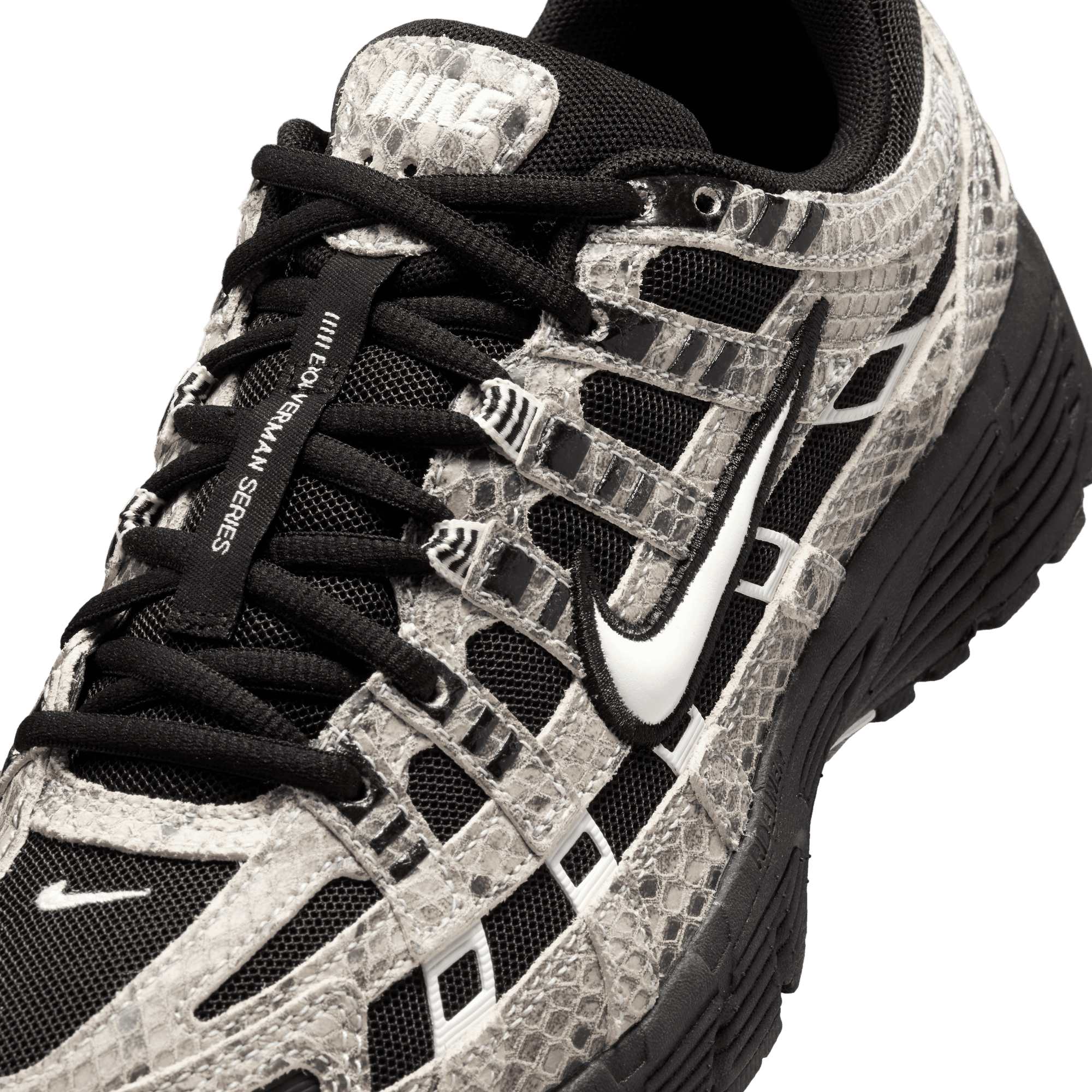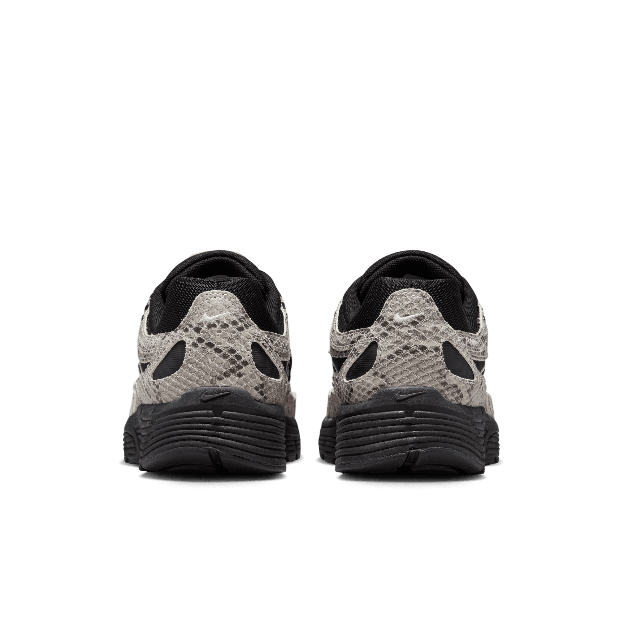 Nike adds to its recent spate of early 2000s retro runners with a mashup of Pegasus styles that evokes the aesthetic of the time on the WMNS P-6000. This "Snakeskin" version of the shoe sports a black mesh upper overlaid with crisscrossing snakeskin embossed leather panels, black and white accents and a bold puffy white midfoot swoosh. A Nike-branded leather tongue tag and low key swoosh branding on heel finish off the details, while a Cushlon midsole and rubber waffle outsole complete the design.