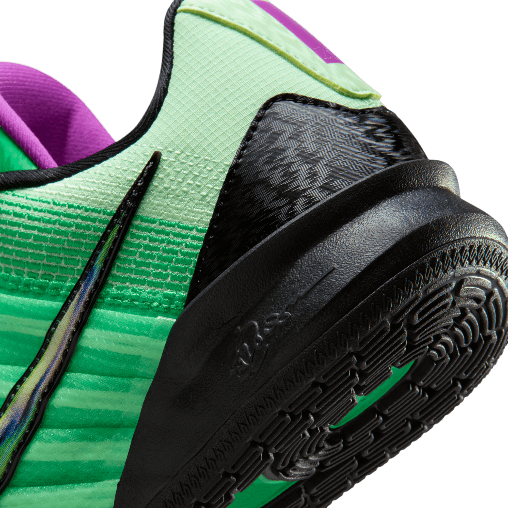 WNBA superstar Sabrina Ionescu celebrates her status as the cover athlete for NBA 2K24's WNBA Edition with this new version of her latest signature, the Sabrina 3 "Gamer". Taking design cues from the background of the game's cover, the lightweight engineered mesh upper rocks a vivid two-tone green look, with pleats around the midfoot containing cables for optimal lockdown, purple trim around the tongue and heel tab, and a marbled, multi-color swoosh on the sides. The black Cushlon midsole contains a Zoom Air unit in the forefoot, while Sabrina's 'S' logo on the tongue and insole, and number 20 on the heel take care of the branding. Green laces, black textile accents on the tongue and heel, and Sabrina's embossed signature on the midsole heel completes the design.