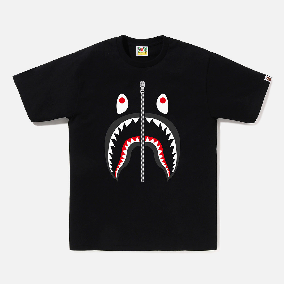 The classic BAPE Shark Tee tee is crafted from 100% cotton and showcases a striking rubber-printed SHARK design complemented by a delicate foil-printed zipper accent on the front. A WGM print on the back and an APE HEAD classic sleeve tag finishes the design.