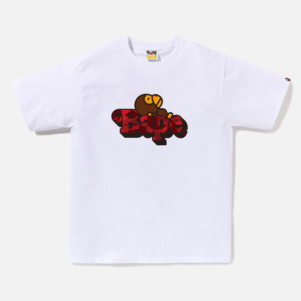 The COLOR CAMO MILO ON BAPE tee is crafted from 100% cotton and showcases a rubber-printed Milo reclining on a camo BAPE logo on the front. With a regular fit, it functions equally well as a primary shirt or a layering piece.