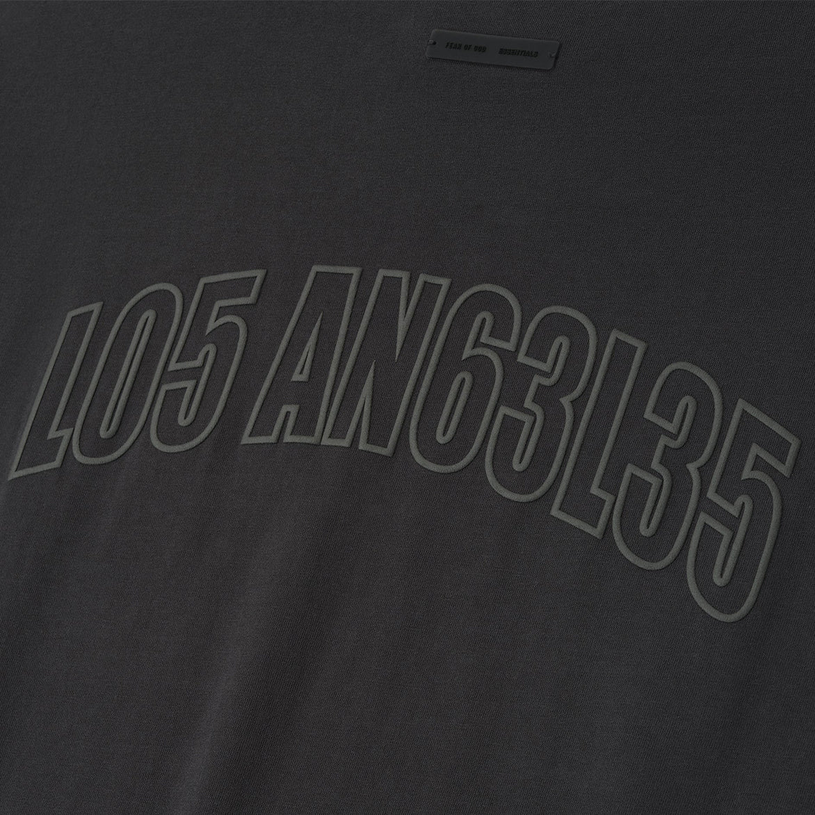 The City Exclusive Los Angeles 90s Tee is cut from 100% cotton jersey, offering a soft yet substantial hand feel. Designed in an oversized 90s-inspired silhouette, it features exaggerated proportions with dropped shoulders for a relaxed drape. The front is defined by a puff-print application of the alpha-numeric Essentials logo "3553NT1AL5", and on the back "L05 ANG63L35" graphic. The signature rubberized Fear of God Essentials label at the collar.