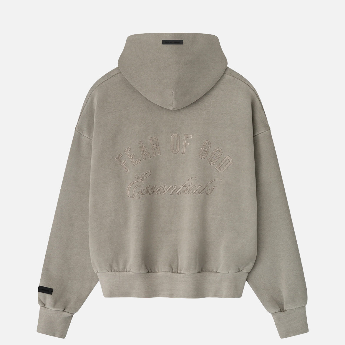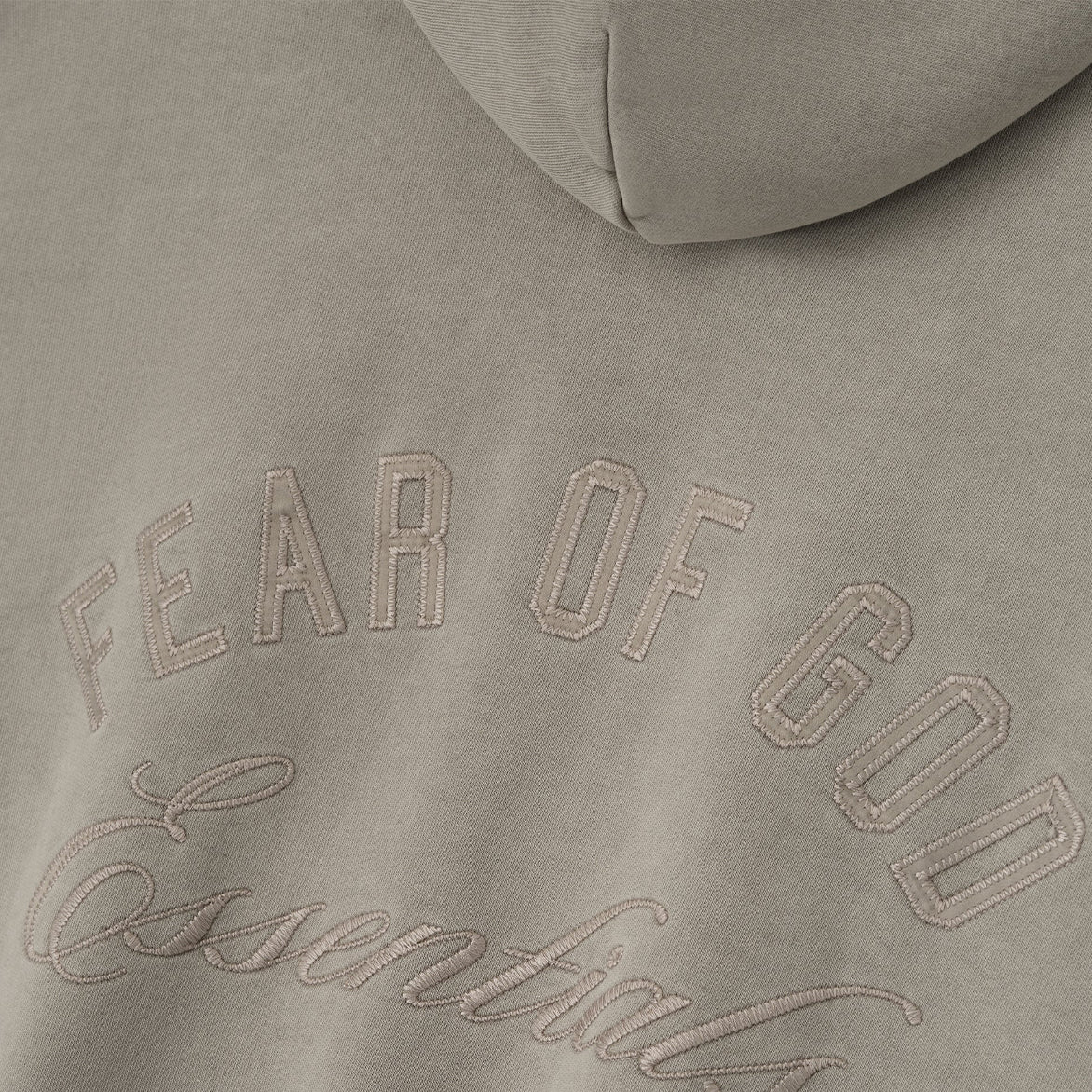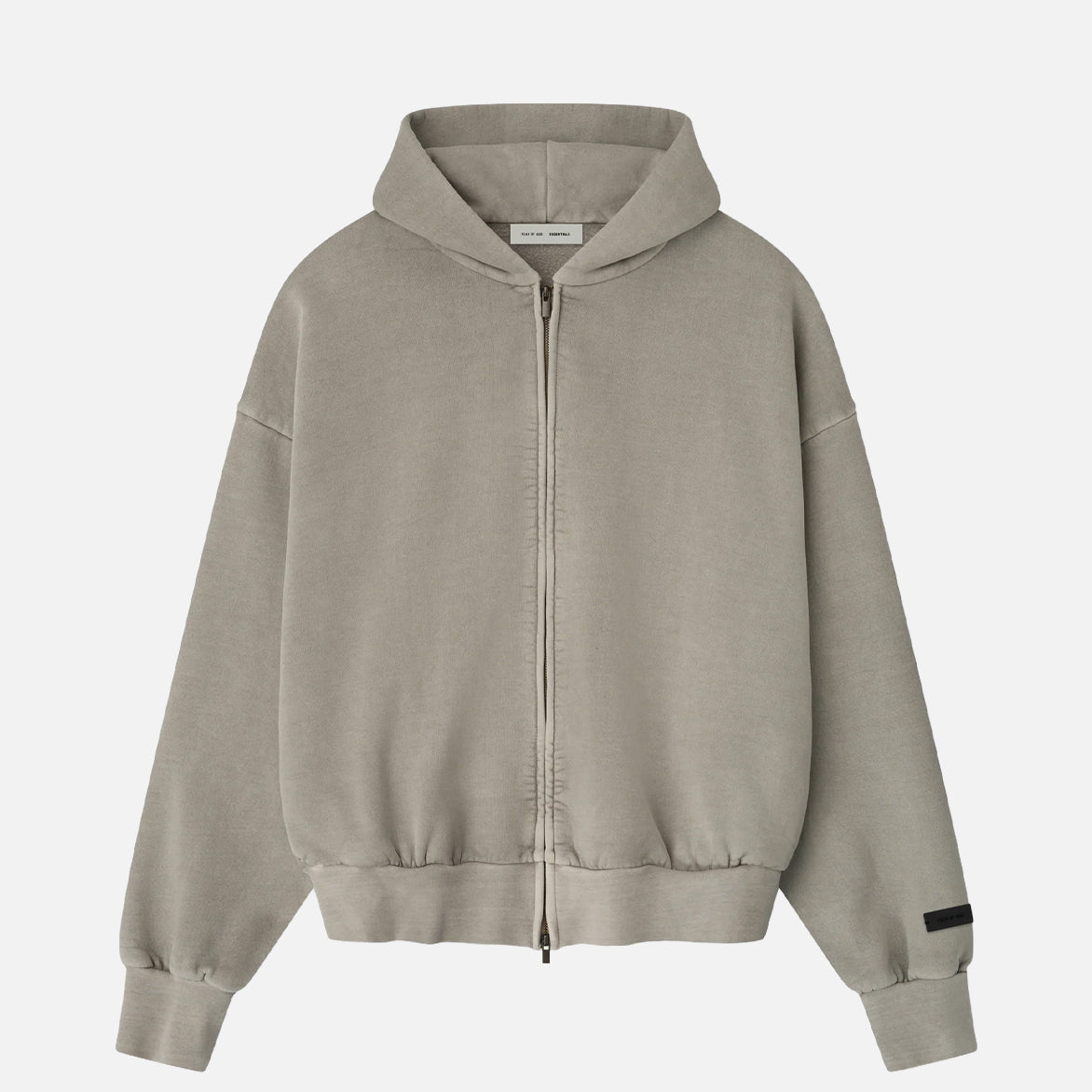 The Classic Fleece Full Zip Hoodie is crafted from 520gsm heavy fleece and treated with a pigment dye to create rich depth of color. Its classic silhouette is defined by an embroidered Fear of God Essentials logo on the back. Details include side pockets, rib-knit cuffs, and waist-hem. A Fear of God Essentials rubberized label stitched at the back collar.