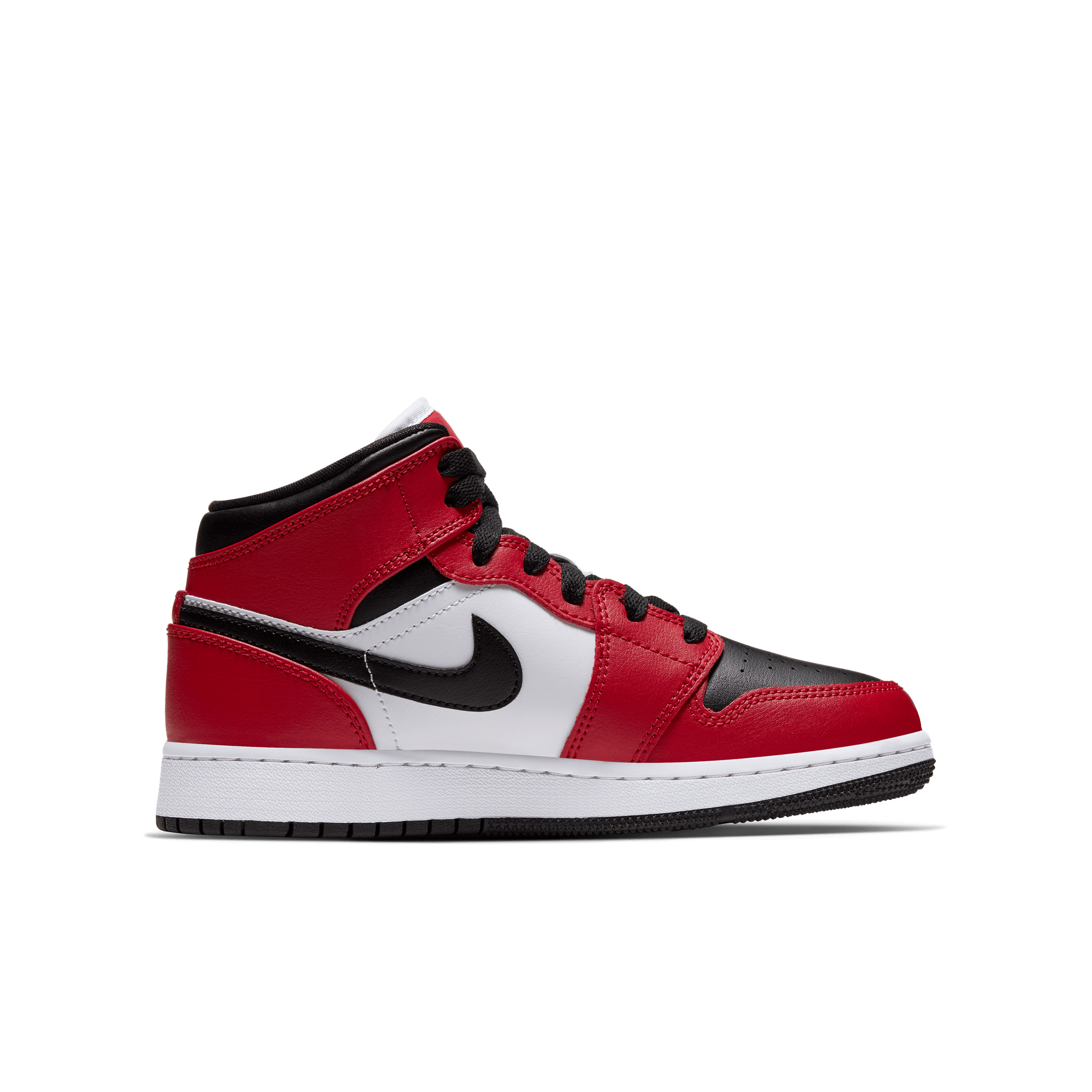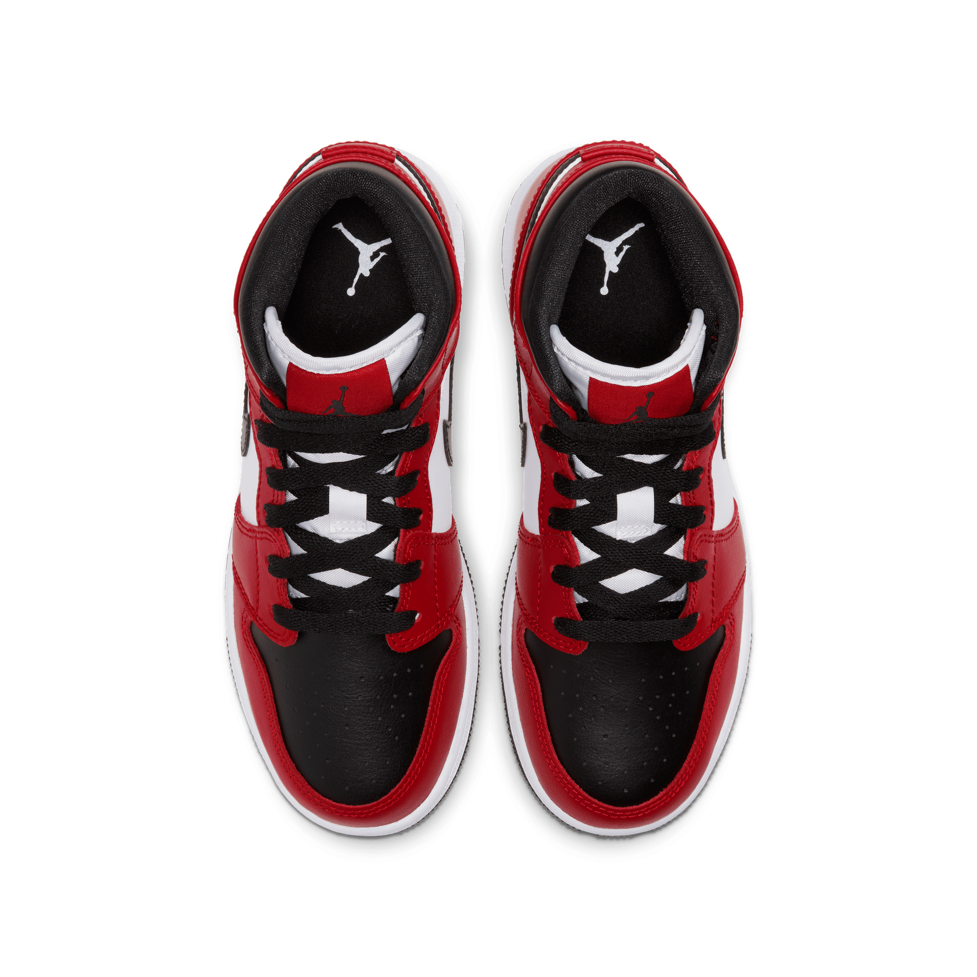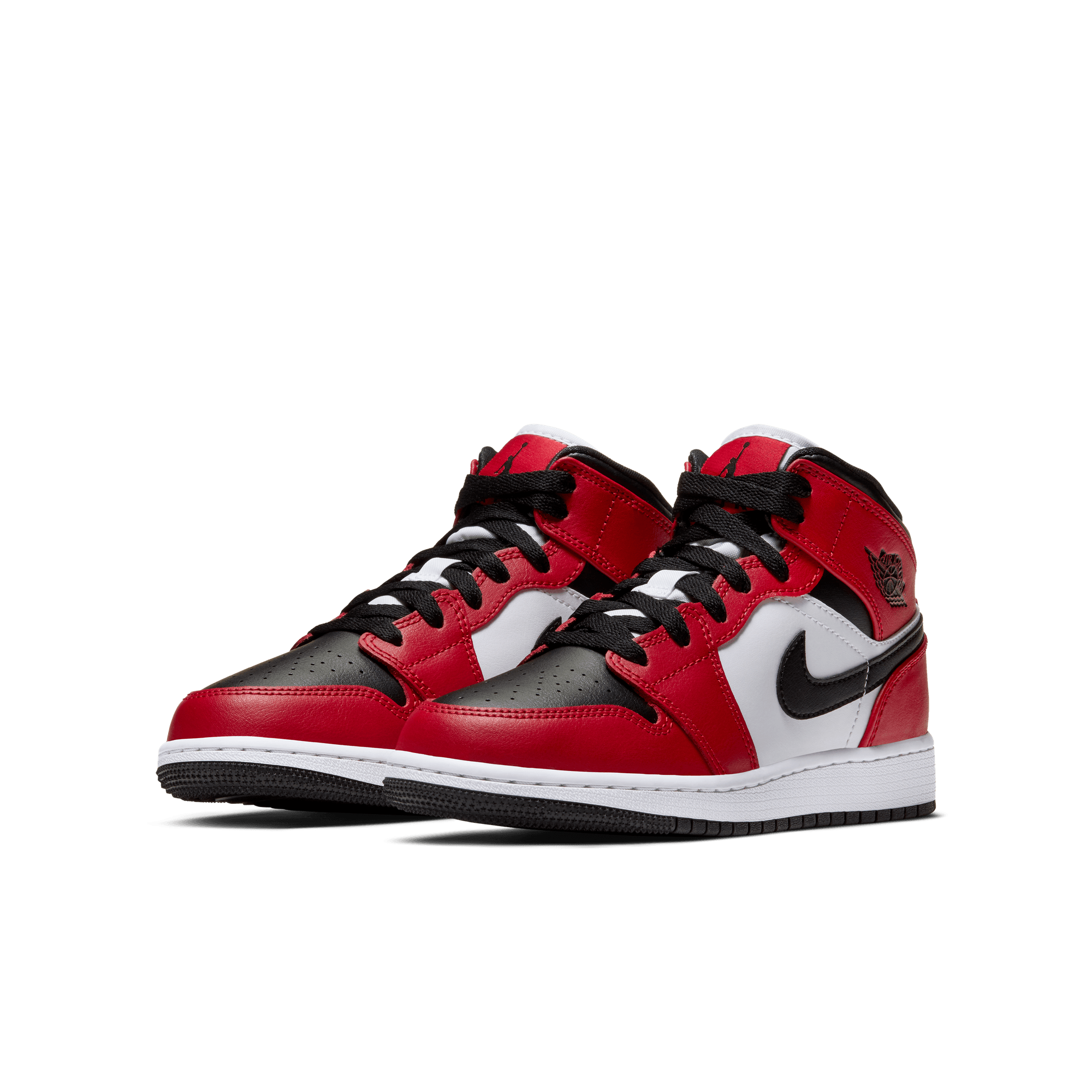 Two iconic OG colorways of the original Air Jordan combine to form another classic Bulls-inspired look on the Air Jordan 1 Mid "Chicago Black Toe". This mid top version of the classic silhouette takes the classic "Chicago" blocking of red overlays on smooth white leather with a black swoosh and collar, and adds the the signature "Black Toe" of a black toe box and red cap. Black branding on the red tongue tag and Wings logo, black laces, and lining, white midsole and black rubber outsole finish off the historic look.