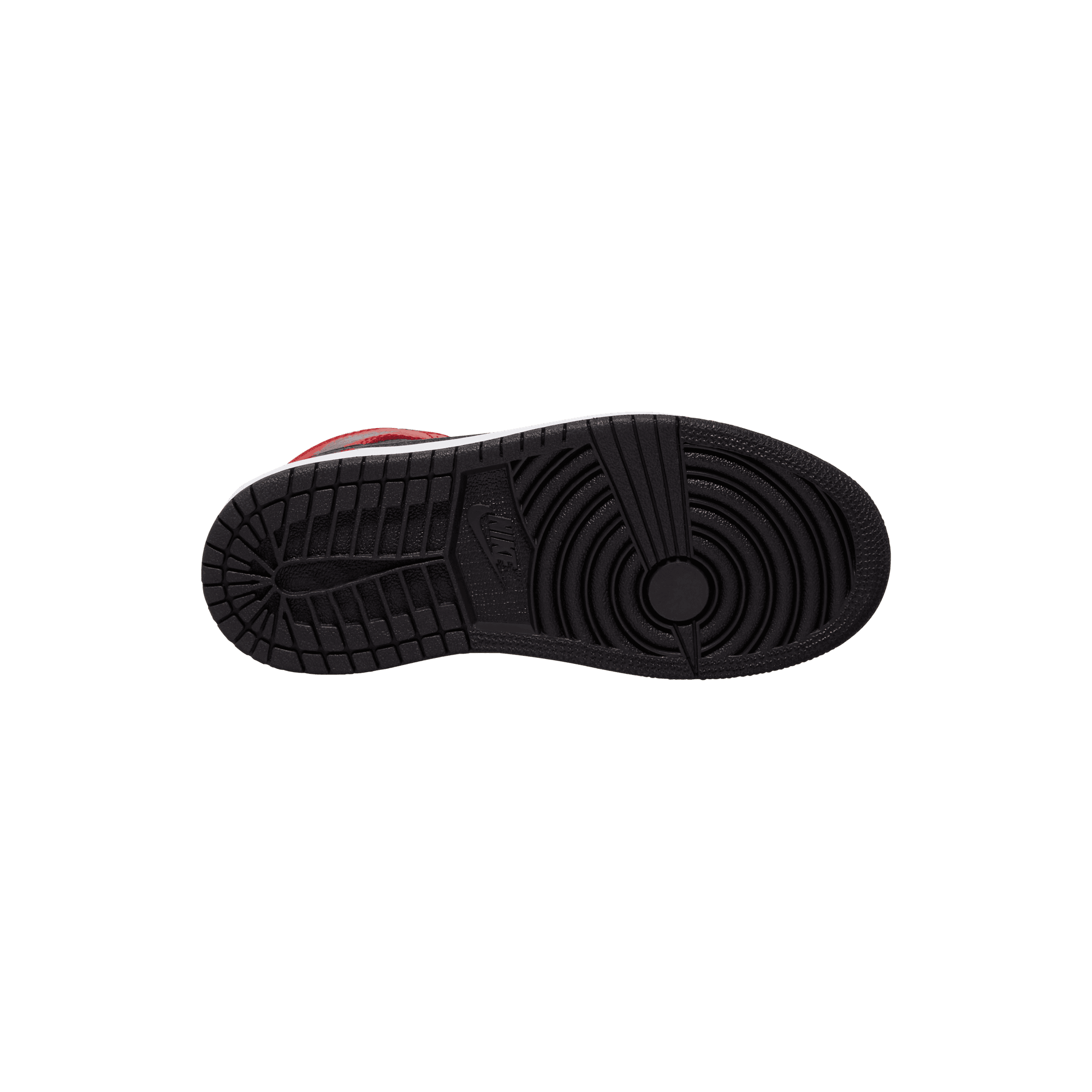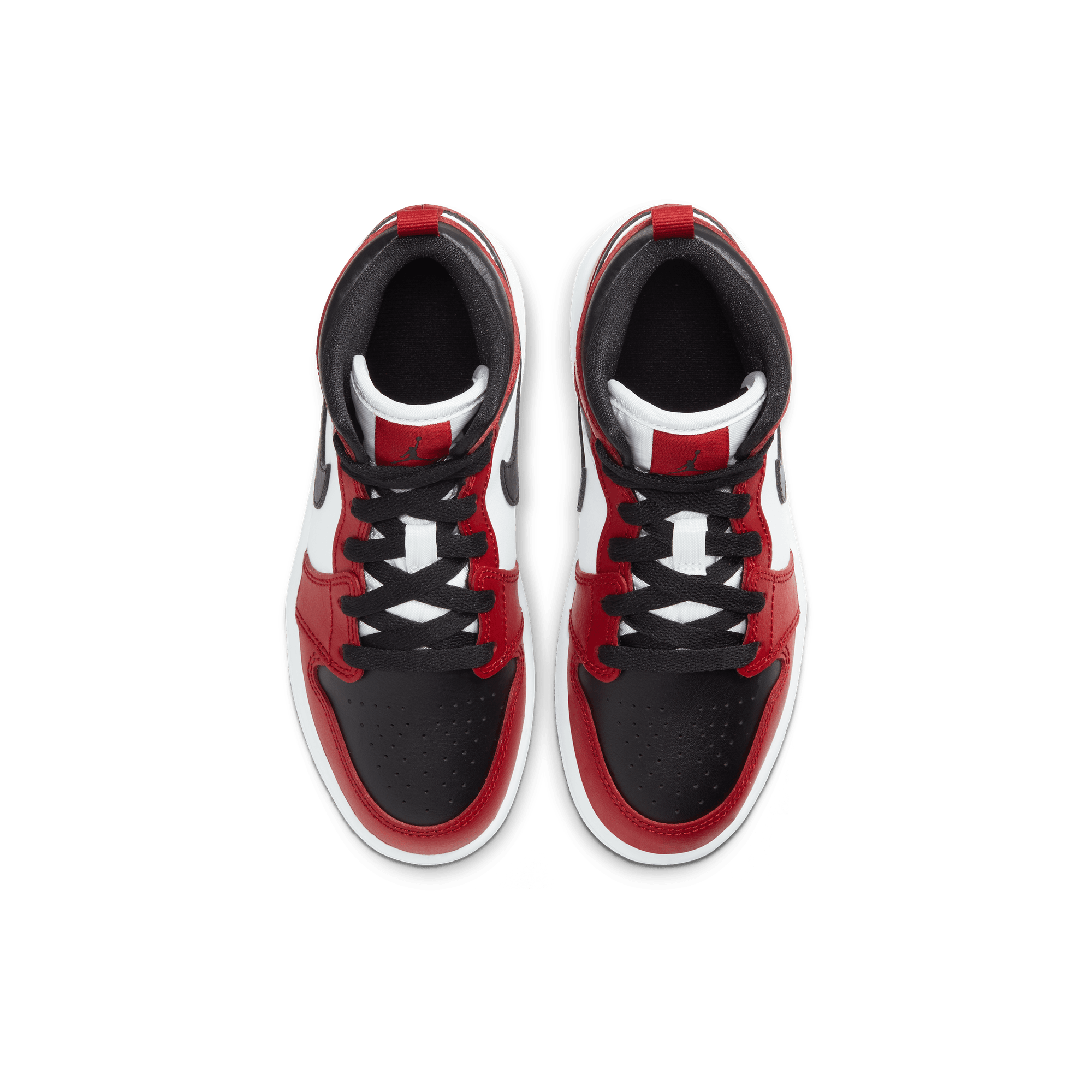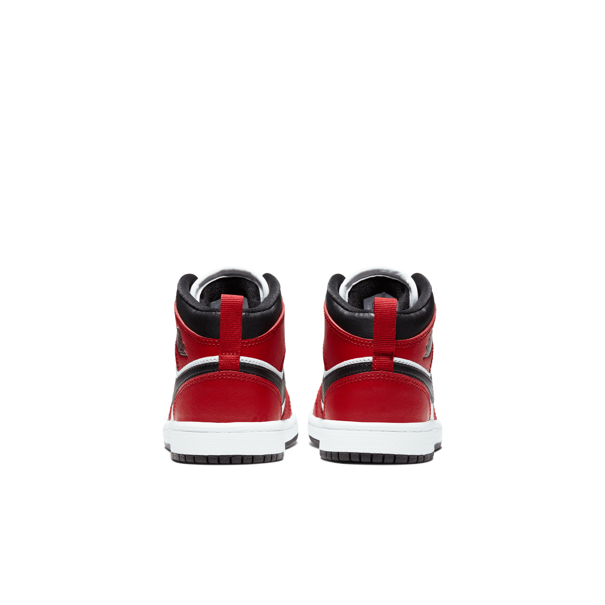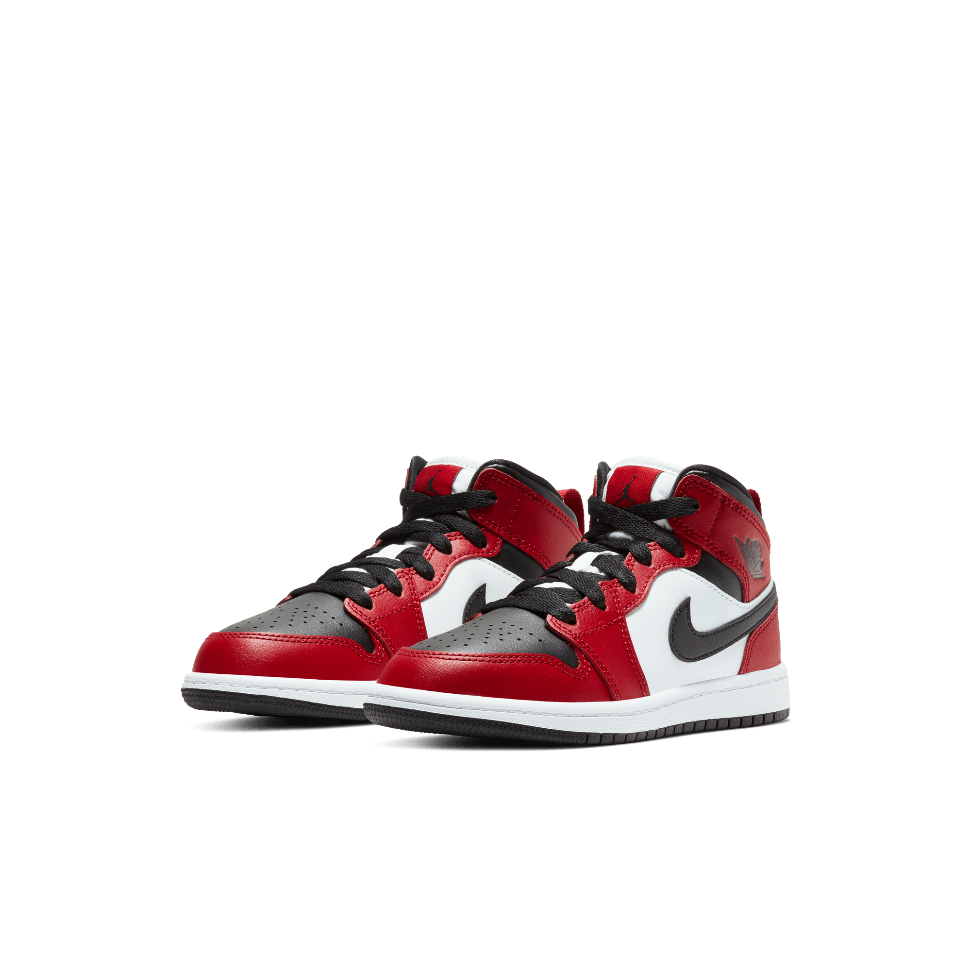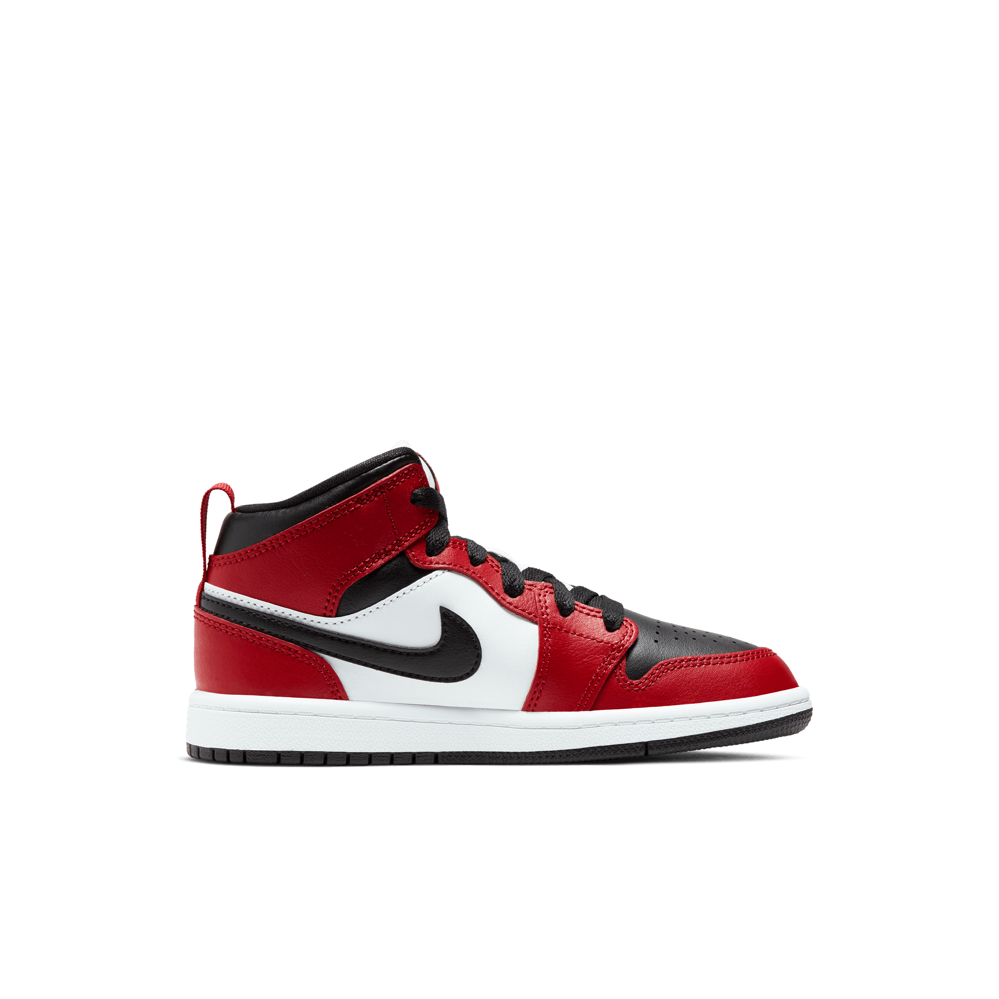 Two iconic OG colorways of the original Air Jordan combine to form another classic Bulls-inspired look on the Air Jordan 1 Mid "Chicago Black Toe". This mid top version of the classic silhouette takes the classic "Chicago" blocking of red overlays on smooth white leather with a black swoosh and collar, and adds the the signature "Black Toe" of a black toe box and red cap. Black branding on the red tongue tag and Wings logo, black laces, and lining, white midsole and black rubber outsole finish off the historic look.
