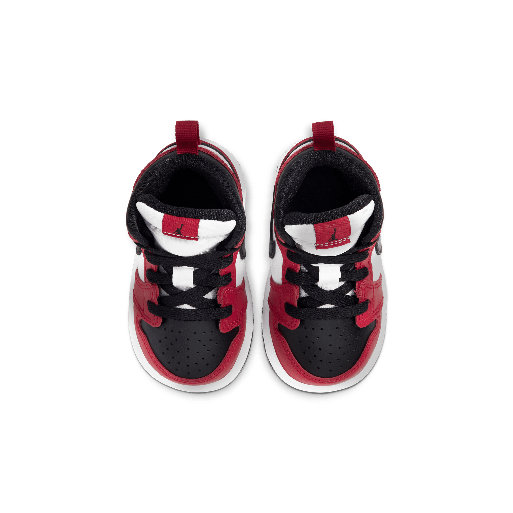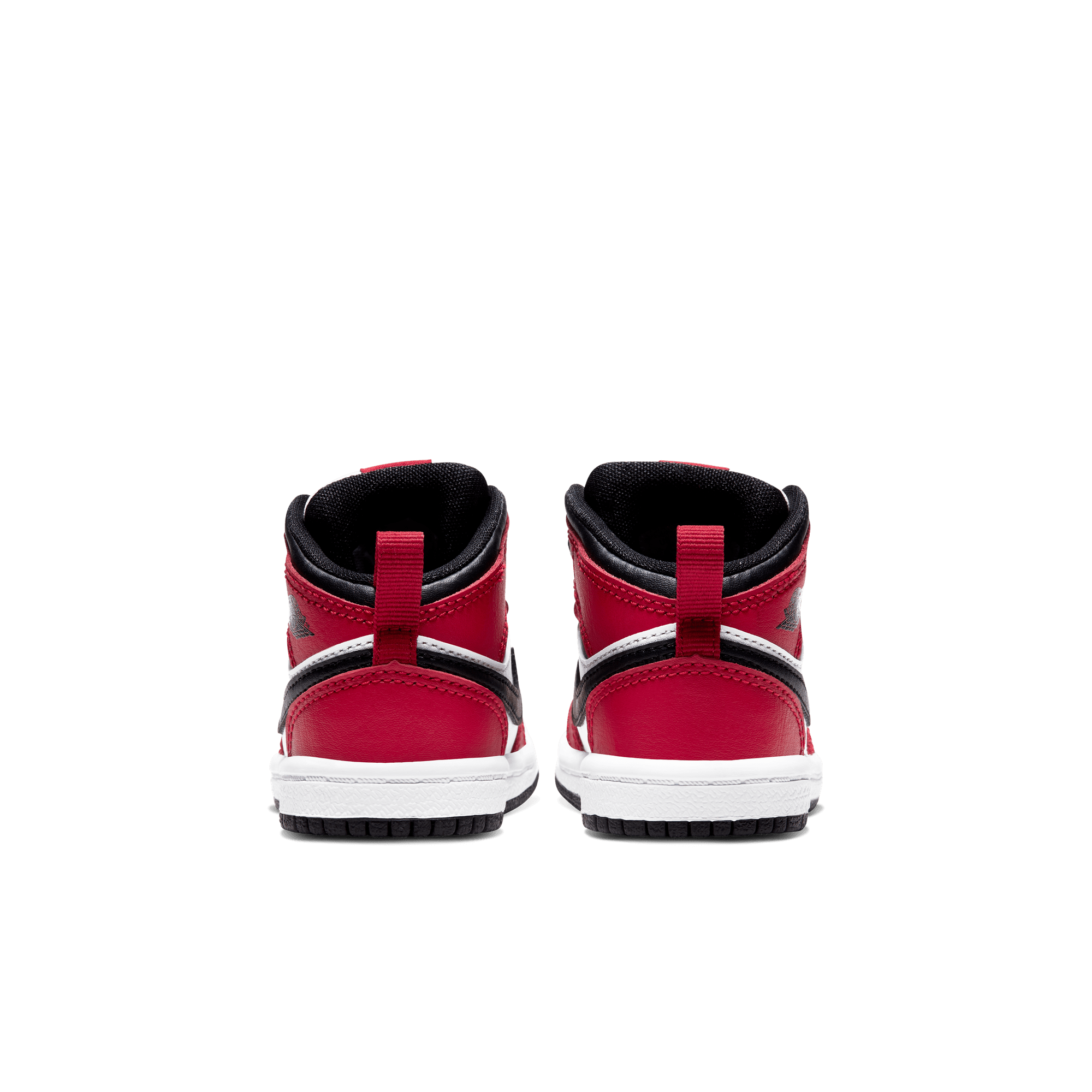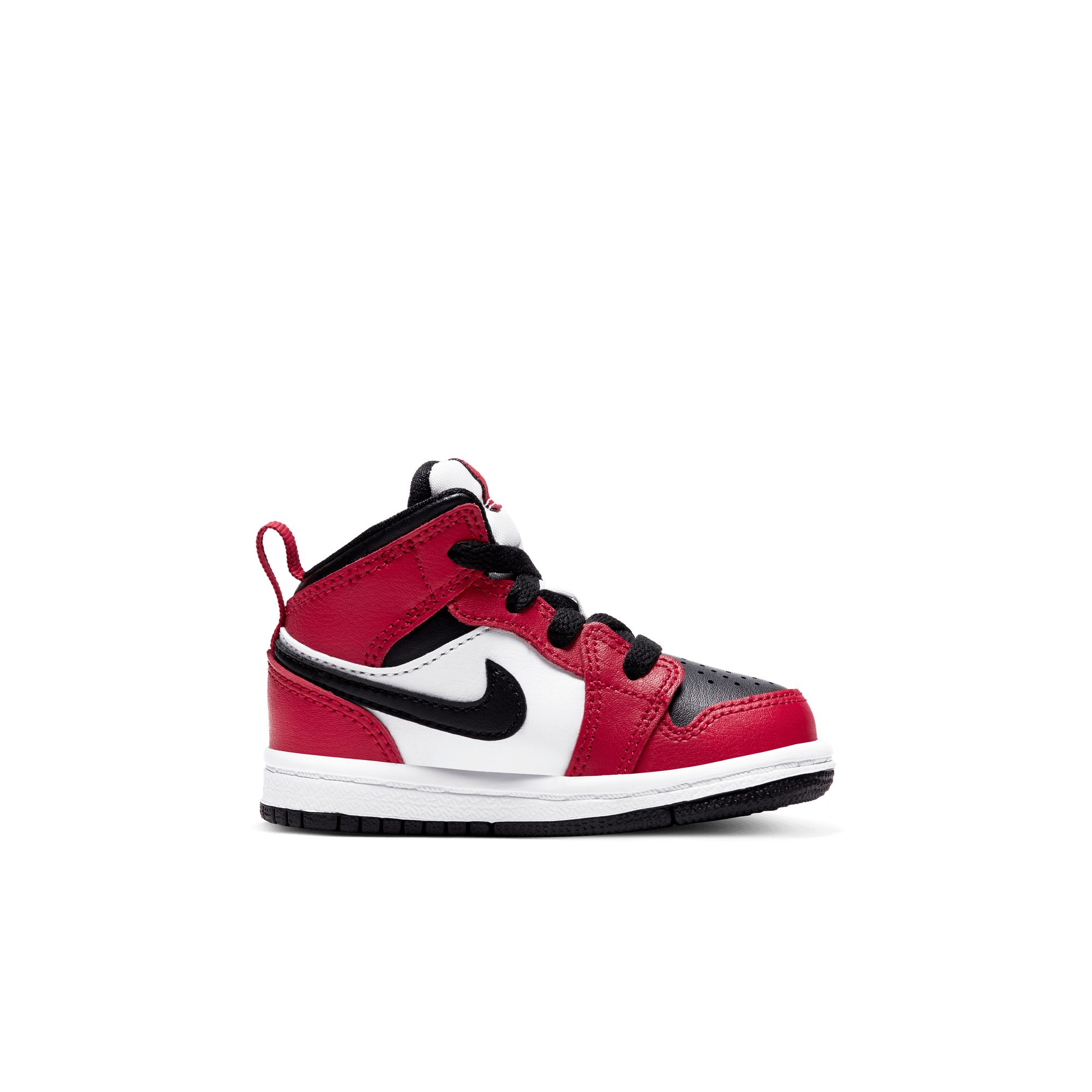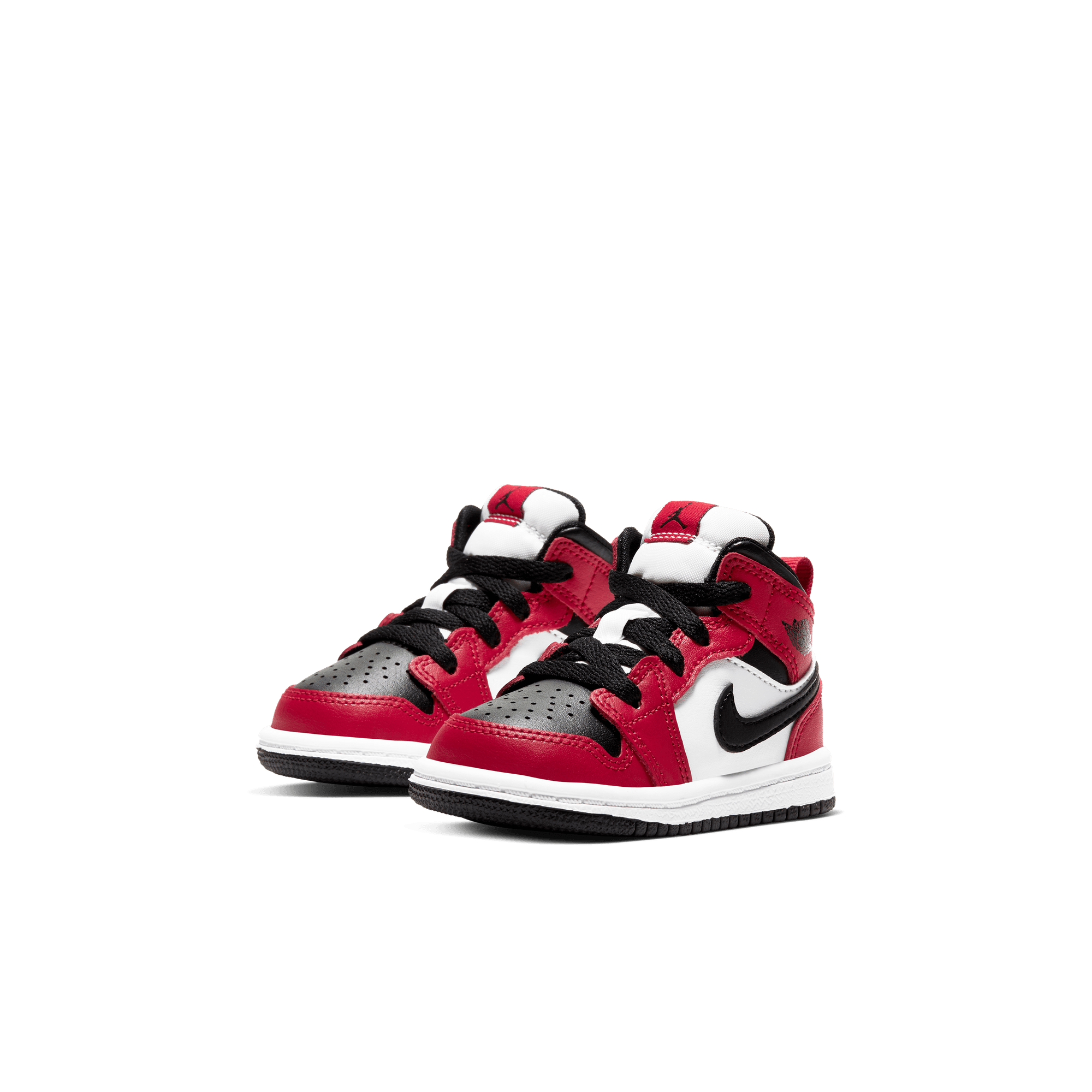 Two iconic OG colorways of the original Air Jordan combine to form another classic Bulls-inspired look on the Air Jordan 1 Mid "Chicago Black Toe". This mid top version of the classic silhouette takes the classic "Chicago" blocking of red overlays on smooth white leather with a black swoosh and collar, and adds the the signature "Black Toe" of a black toe box and red cap. Black branding on the red tongue tag and Wings logo, black laces, and lining, white midsole and black rubber outsole finish off the historic look.